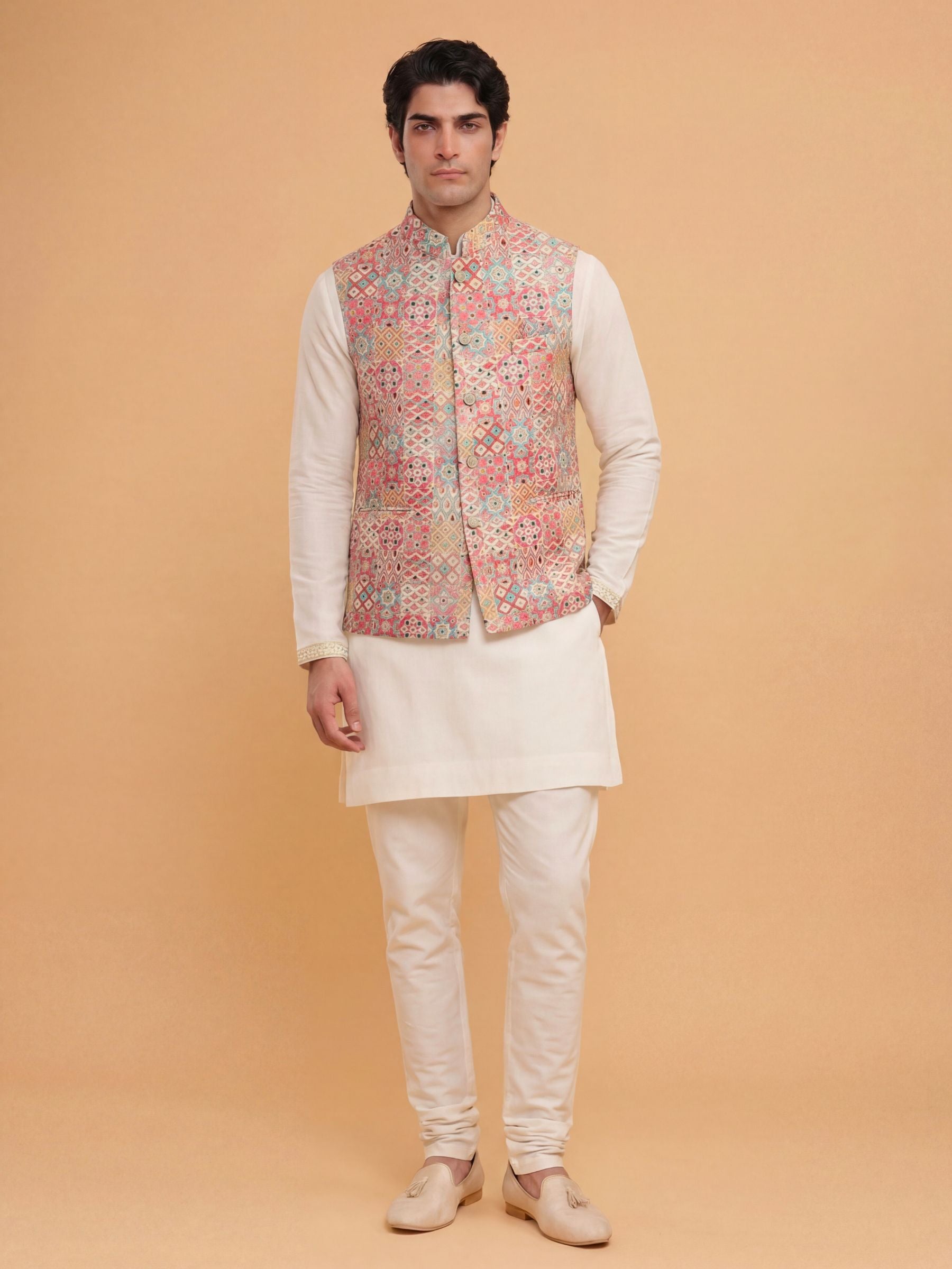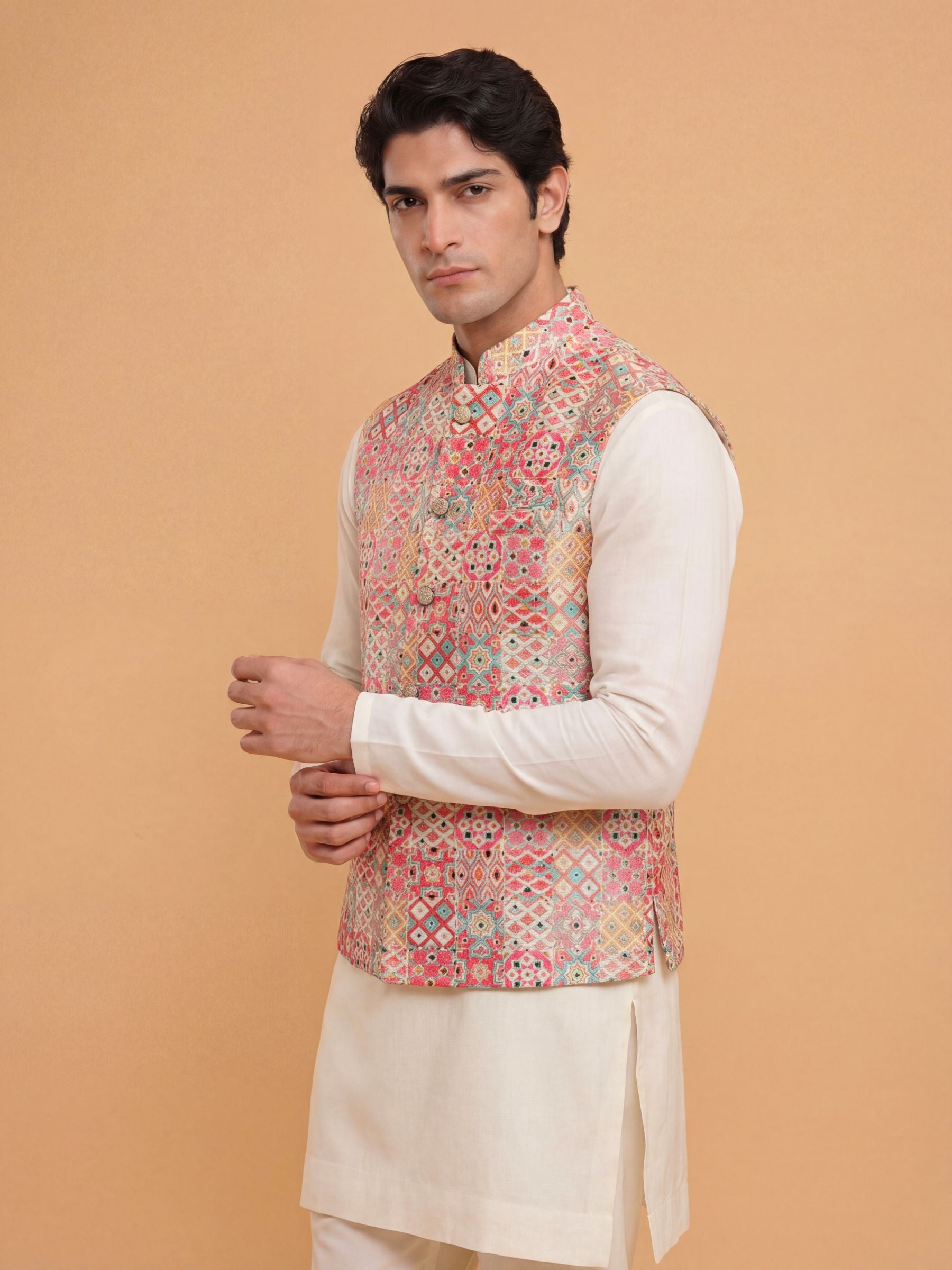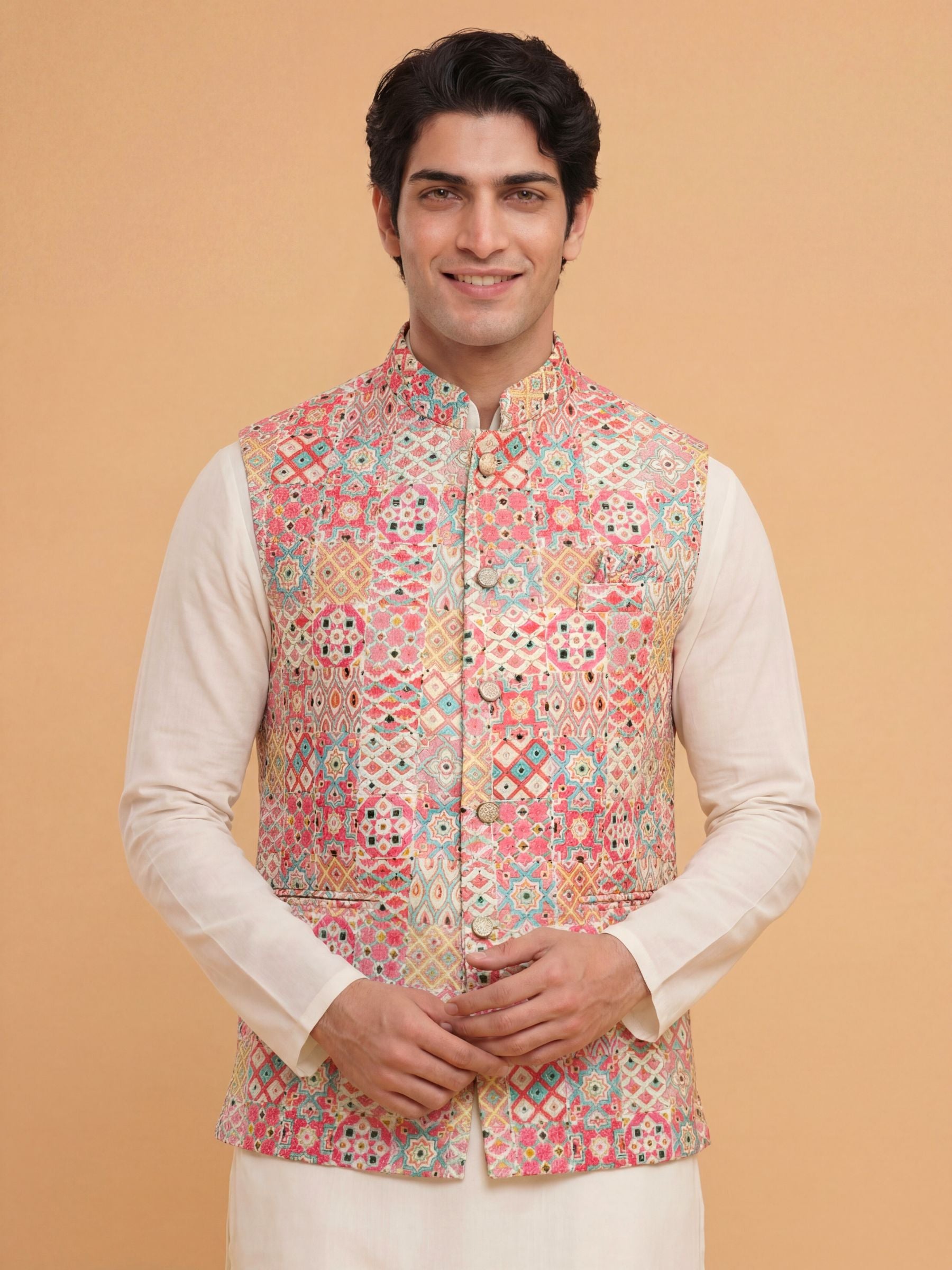 Light up every celebration with the आभा (Aabha) Heritage Mosaic Jacquard Nehru Jacket. Inspired by the richness of Indian textile artistry, this Modi Jacket features an intricate multi-color mosaic weave that blends coral reds, soft greens, and warm gold tones into a radiant heritage tapestry.