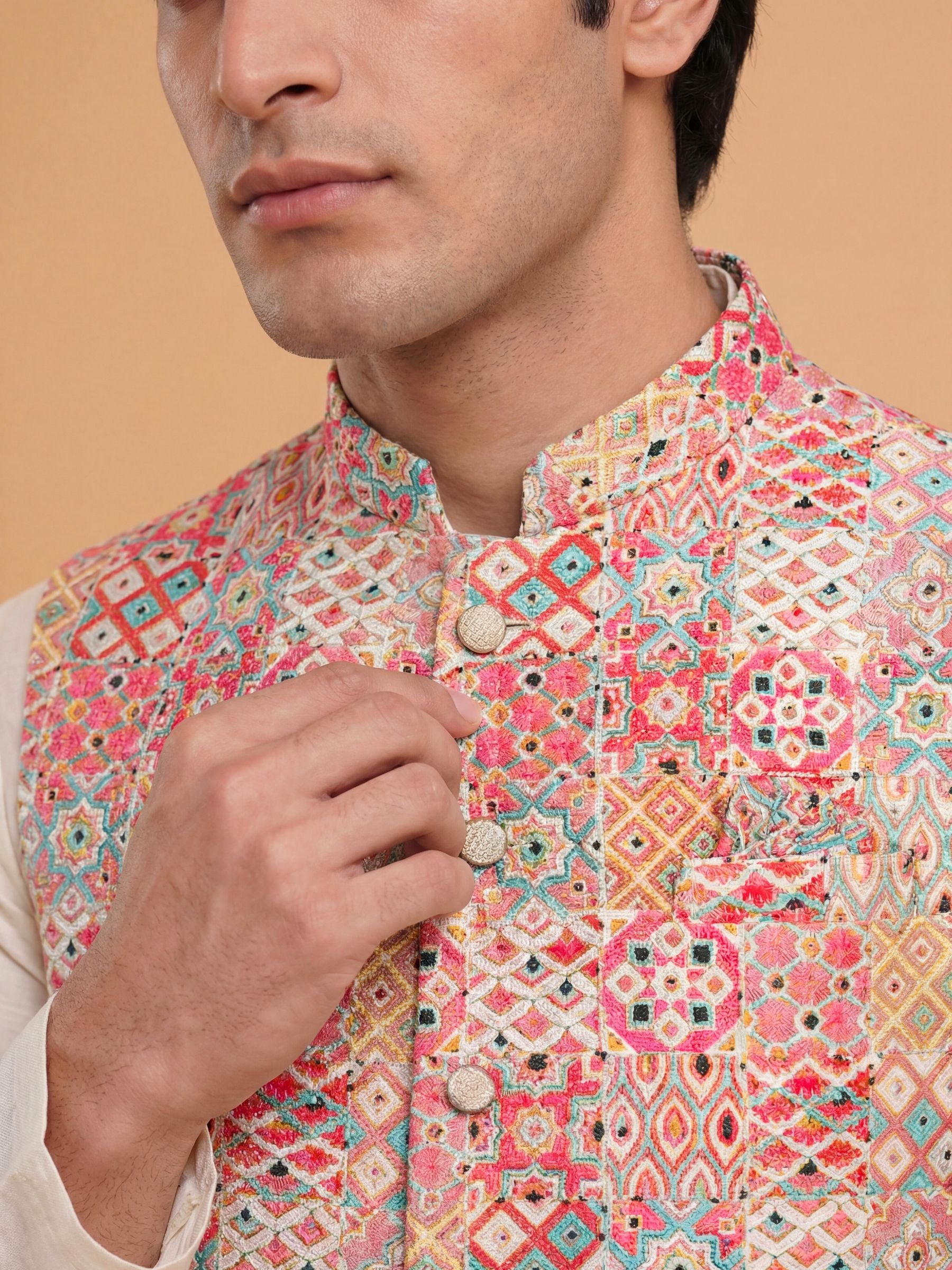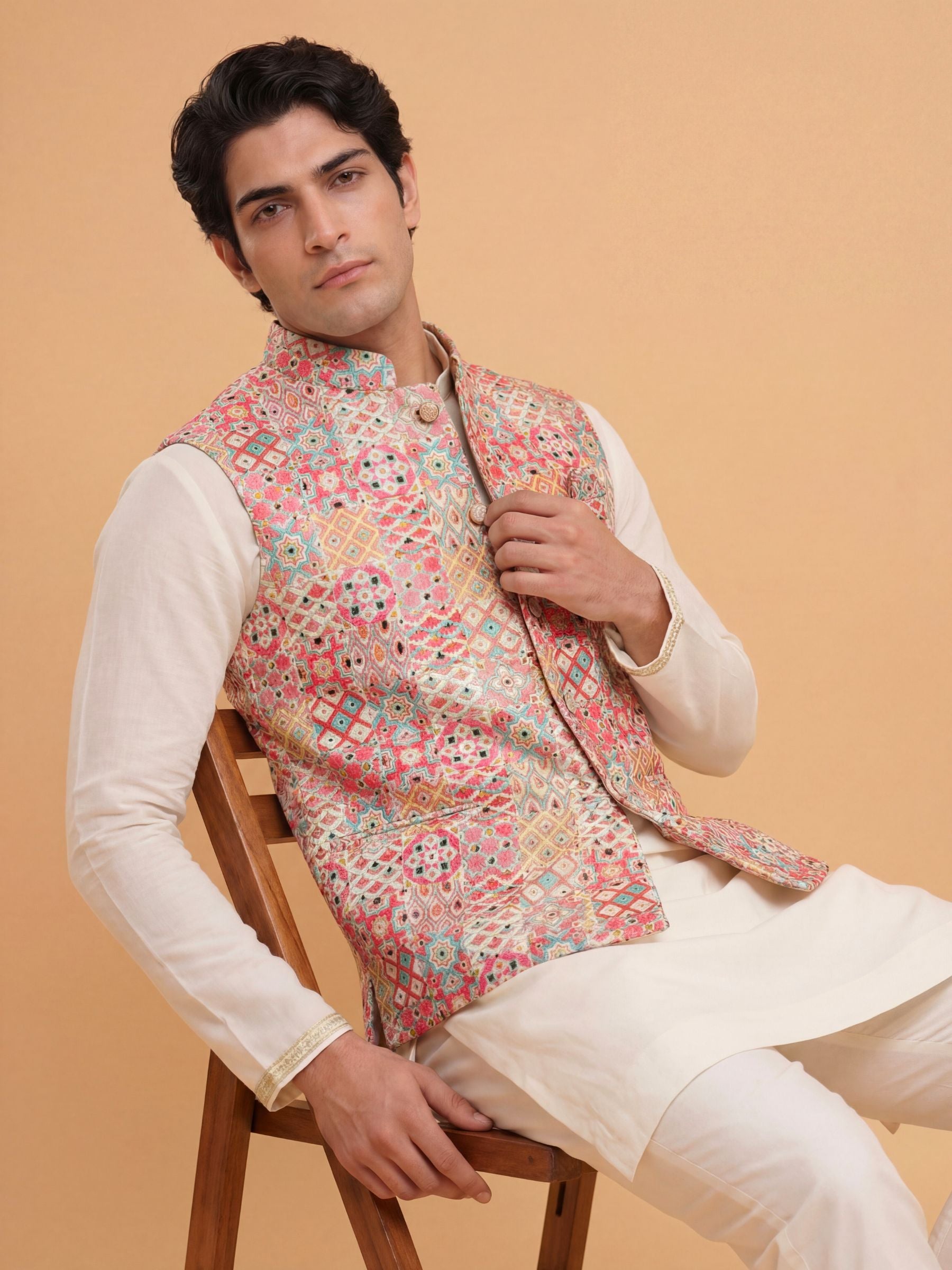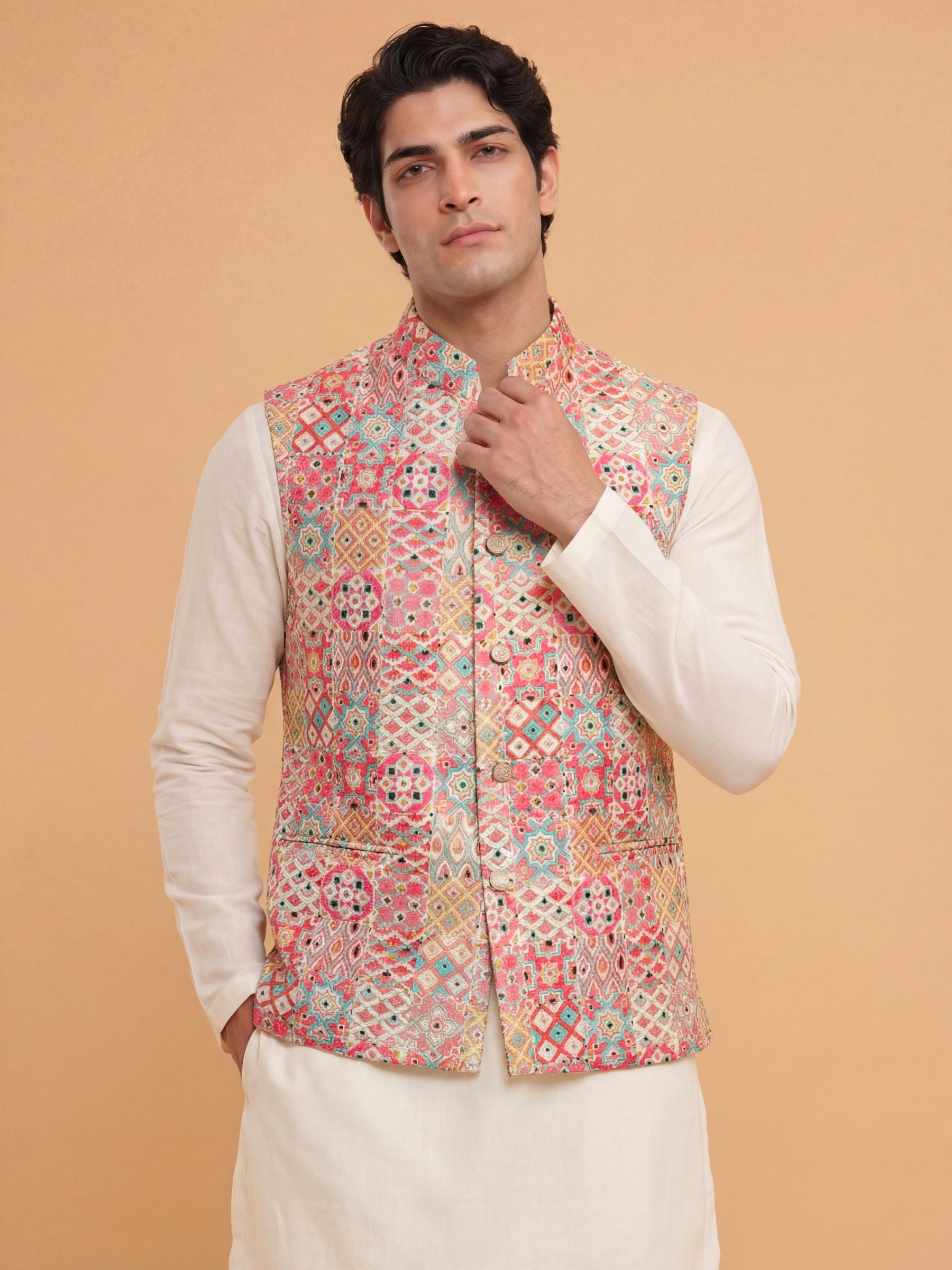 Light up every celebration with the आभा (Aabha) Heritage Mosaic Jacquard Nehru Jacket. Inspired by the richness of Indian textile artistry, this Modi Jacket features an intricate multi-color mosaic weave that blends coral reds, soft greens, and warm gold tones into a radiant heritage tapestry.