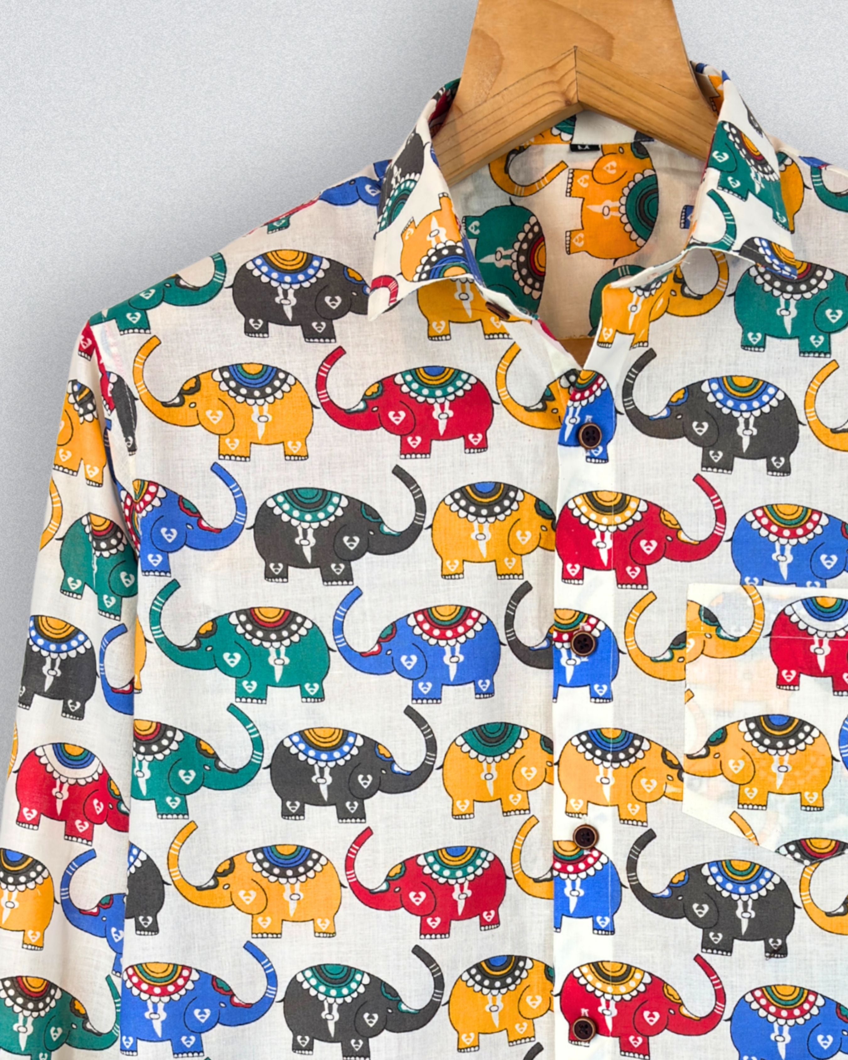 Add a splash of color to your wardrobe with Elephant Parade by Jaipuri Crown – a charming Full sleeve cotton shirt featuring an array of vibrant elephant prints in blue, yellow, red, and green on a soft cream base. Made from 100% Sanganeri cotton, this shirt ensures a comfortable and breathable fit, perfect for casual outings, festive occasions, or laid-back weekends.