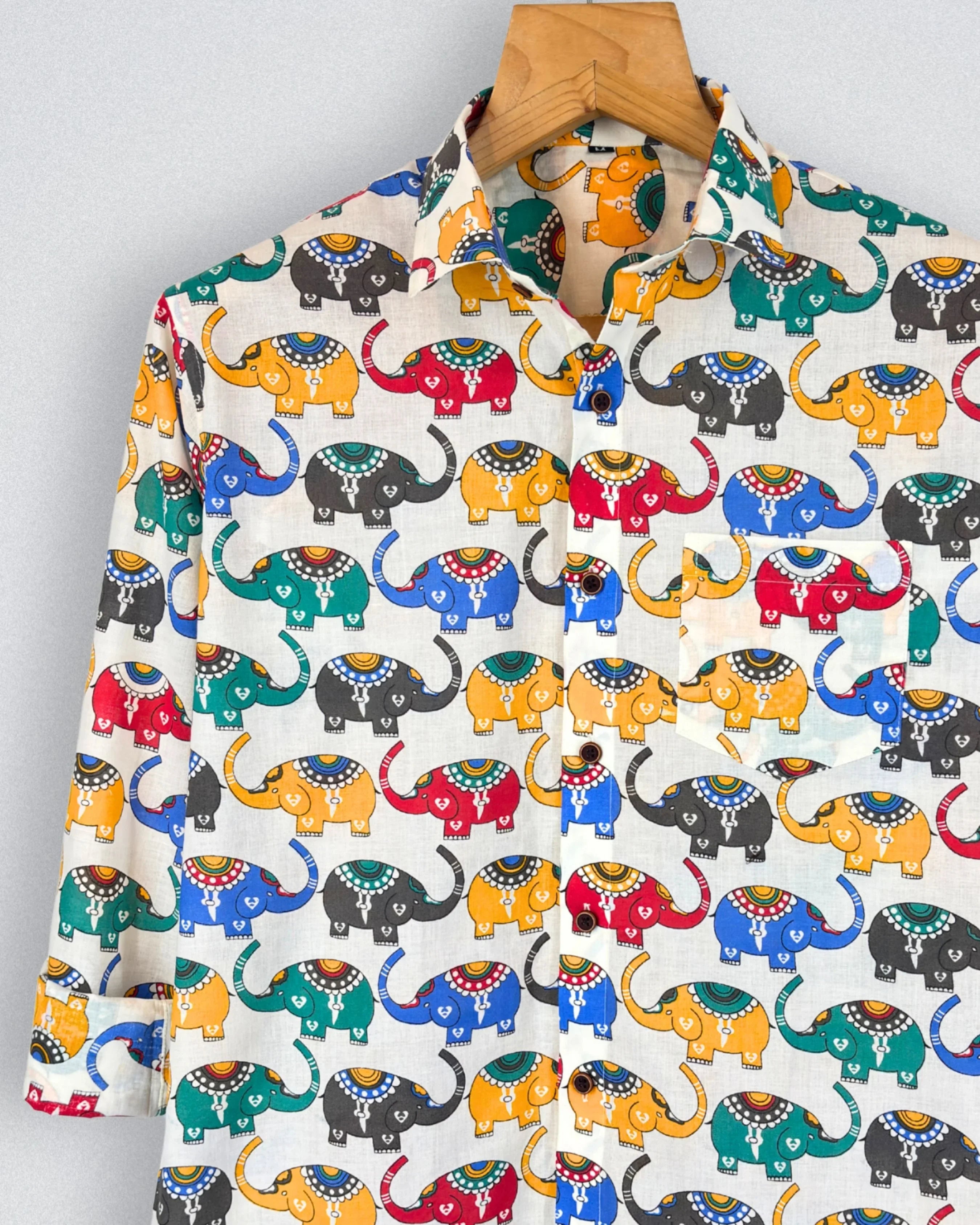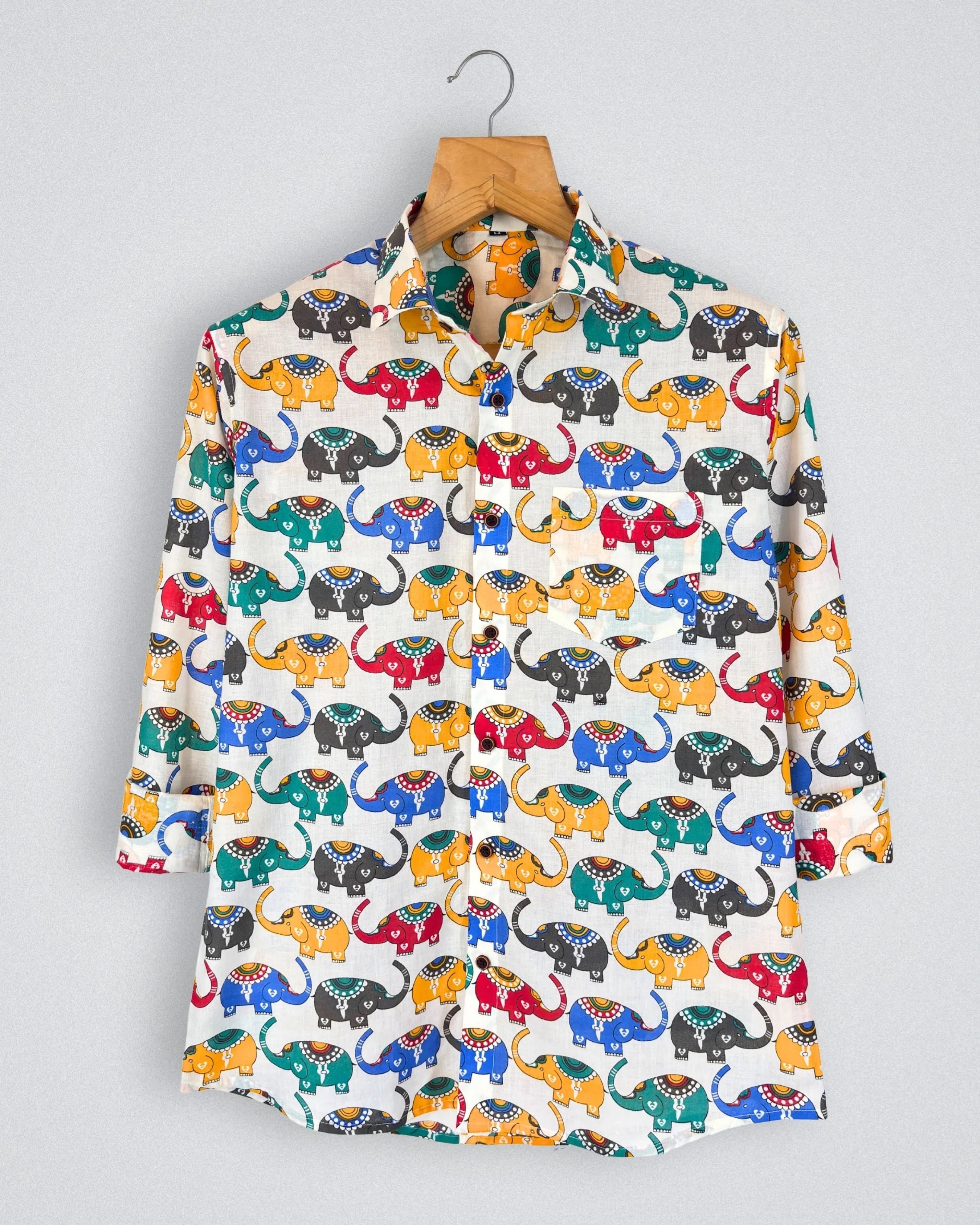 Add a splash of color to your wardrobe with Elephant Parade by Jaipuri Crown – a charming Full sleeve cotton shirt featuring an array of vibrant elephant prints in blue, yellow, red, and green on a soft cream base. Made from 100% Sanganeri cotton, this shirt ensures a comfortable and breathable fit, perfect for casual outings, festive occasions, or laid-back weekends.