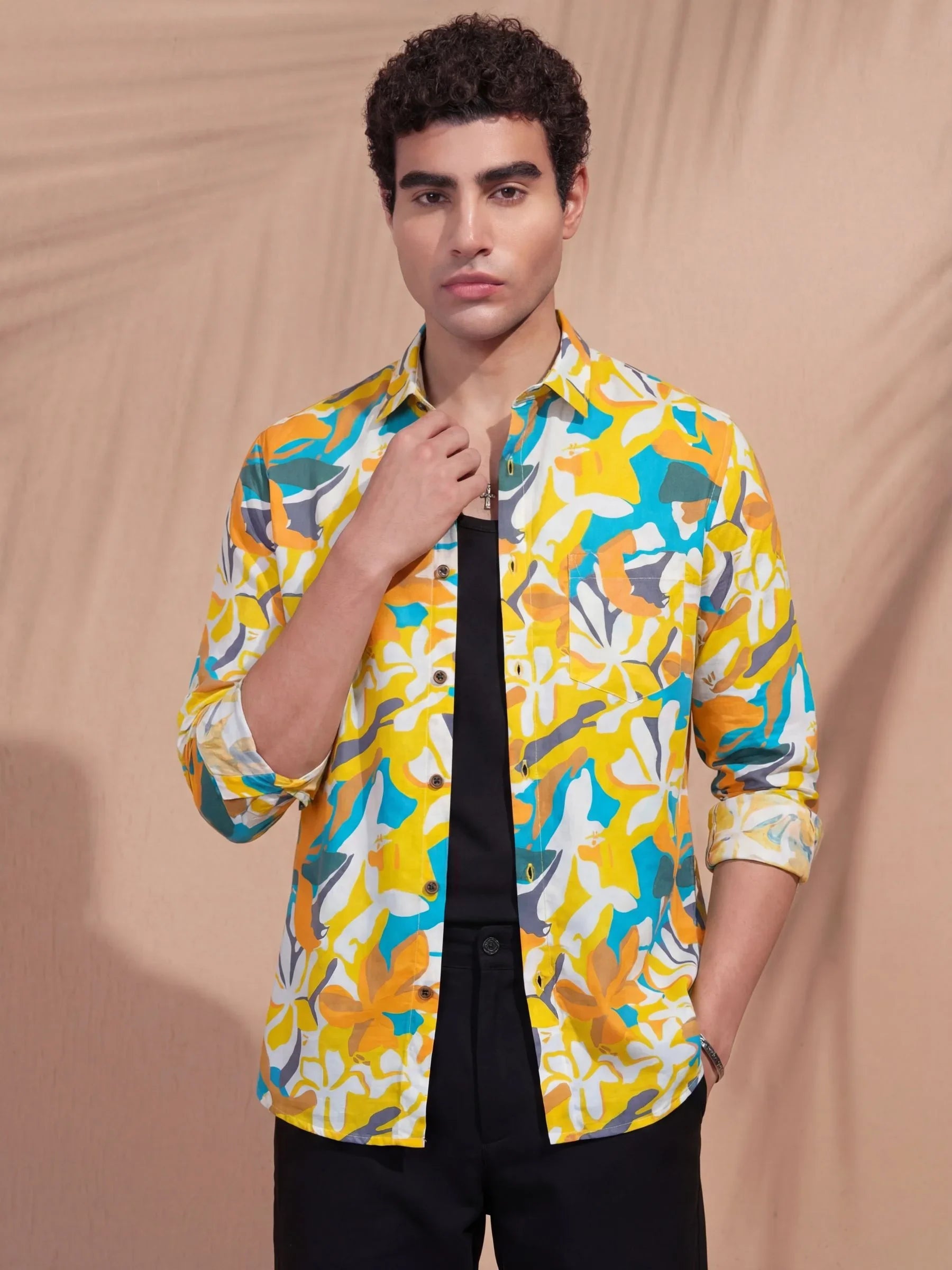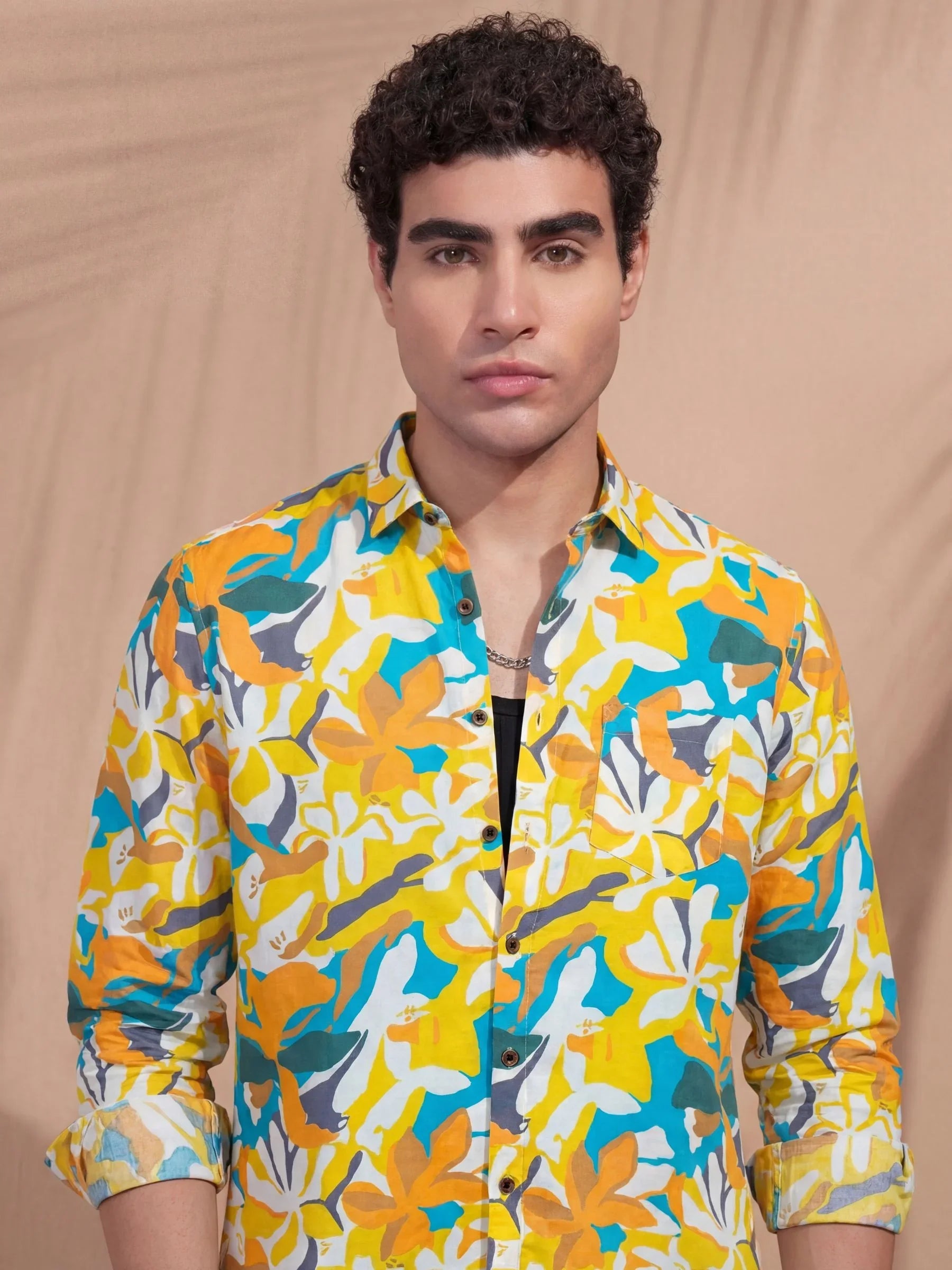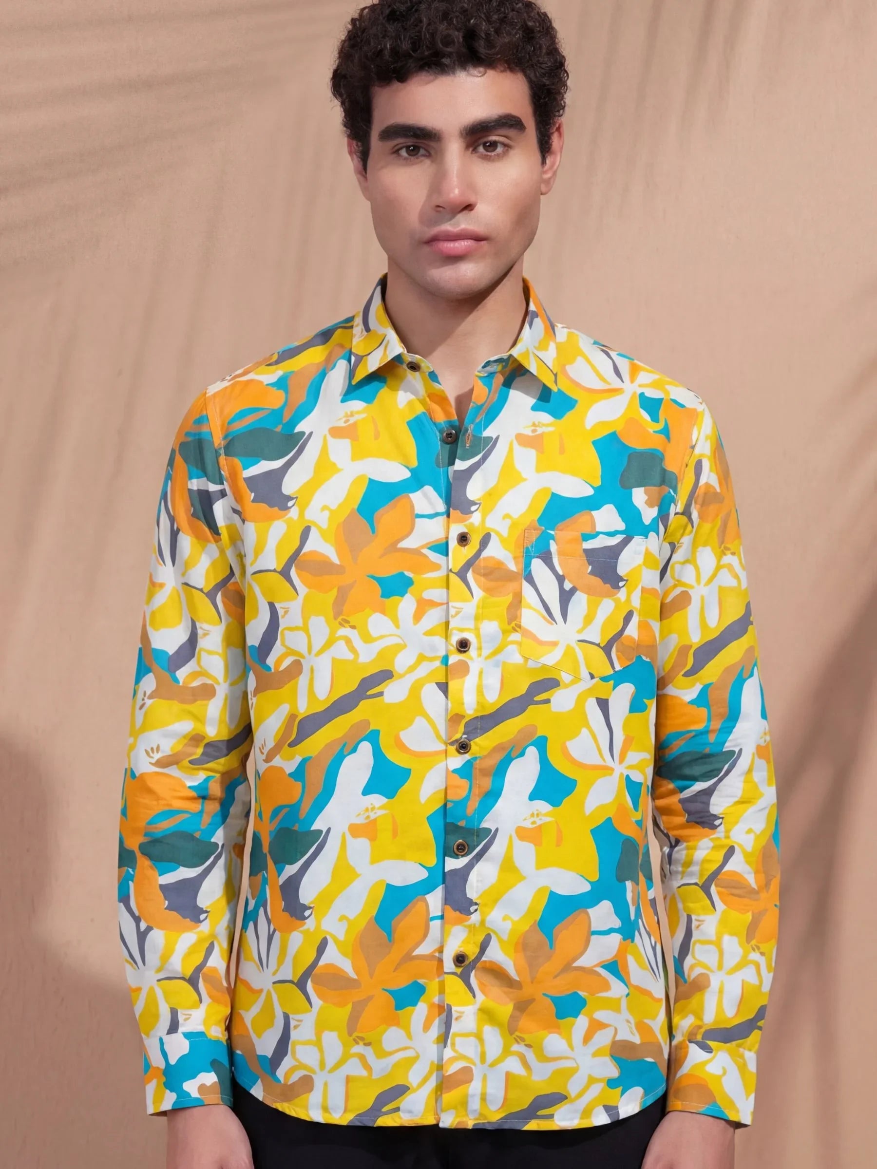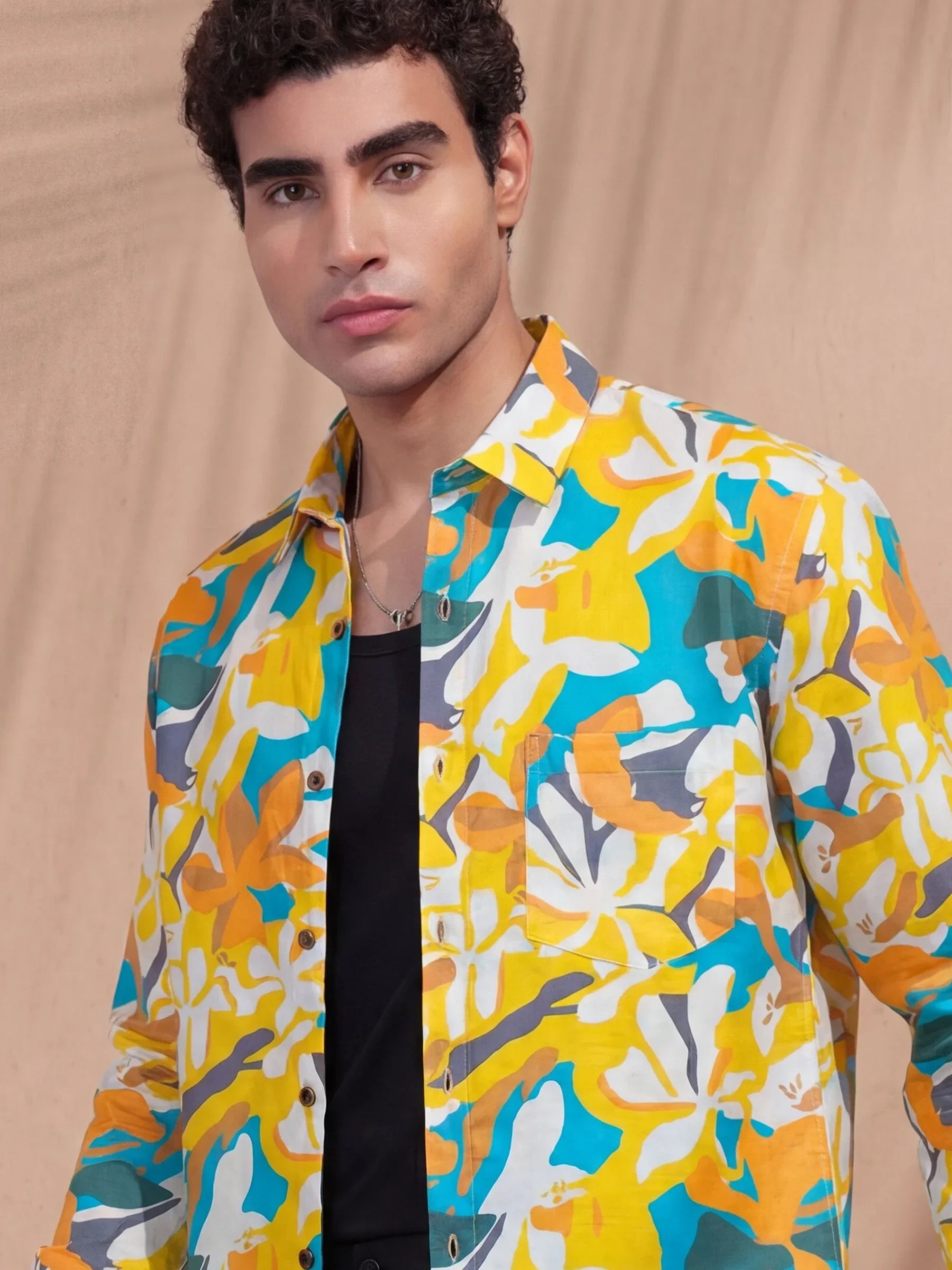 Stand out with sun-soaked tones in the Amber Tropic shirt by Jaipuri Crown. This full sleeve printed shirt features a bold, oversized floral abstract in shades of mustard, teal, and burnt orange against a calm beige base. Designed in premium satin blend fabric, it’s smooth, stylish, and breathable — made for beach weekends, brunches, and tropical getaways.