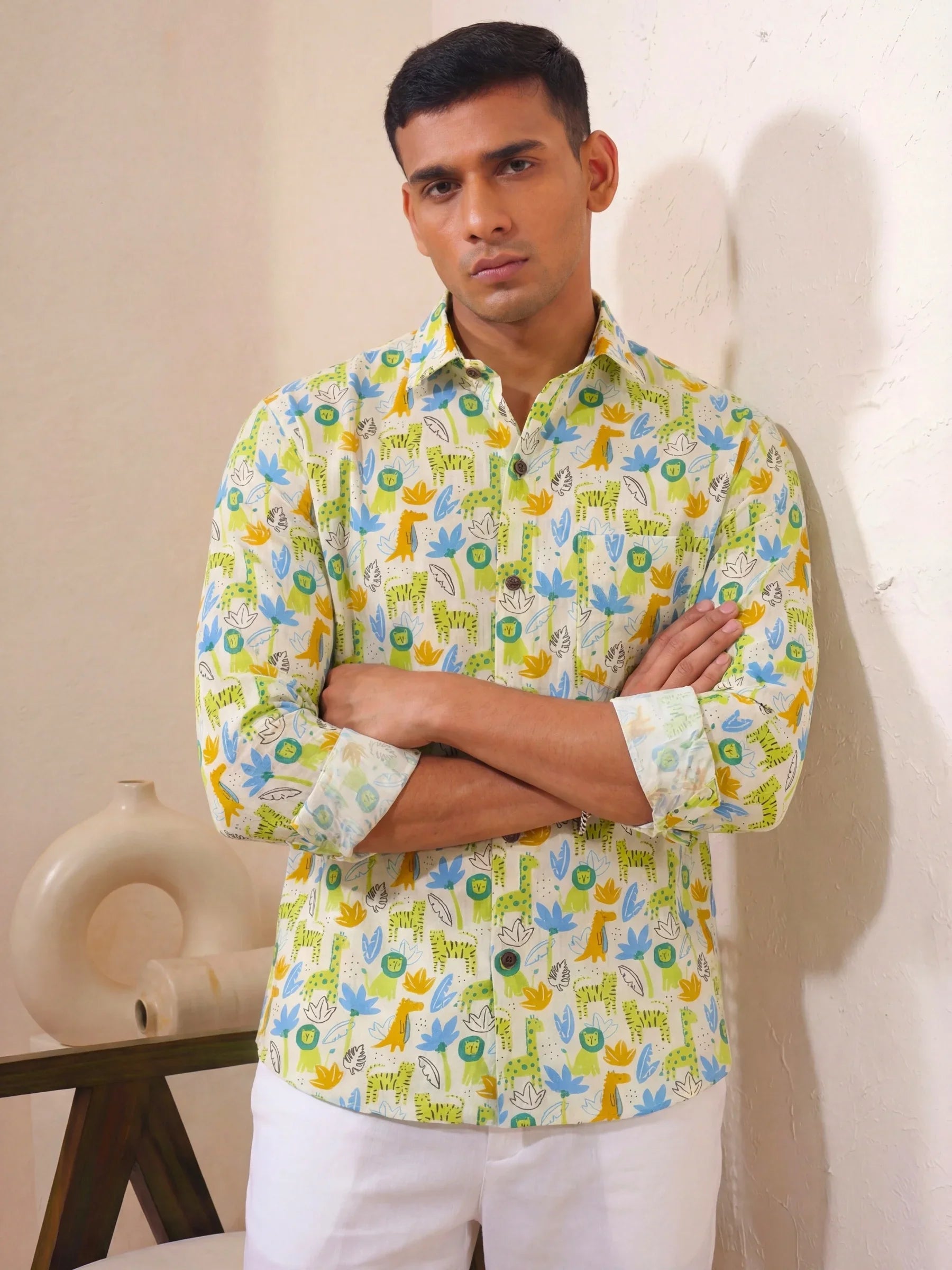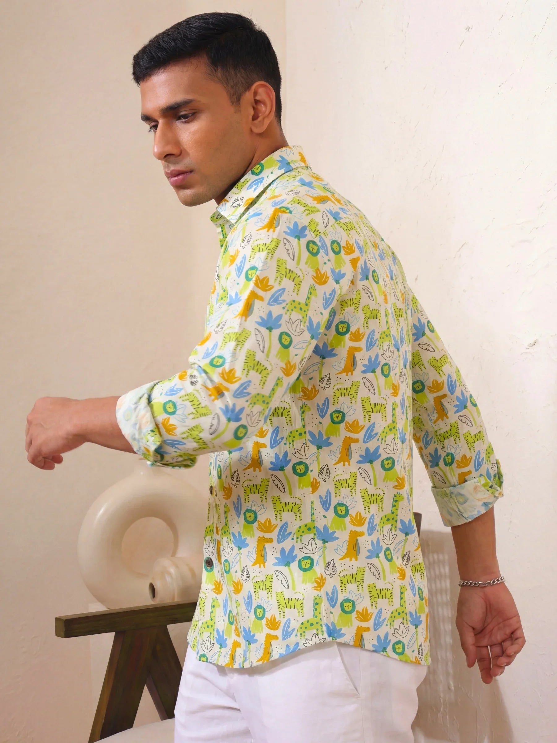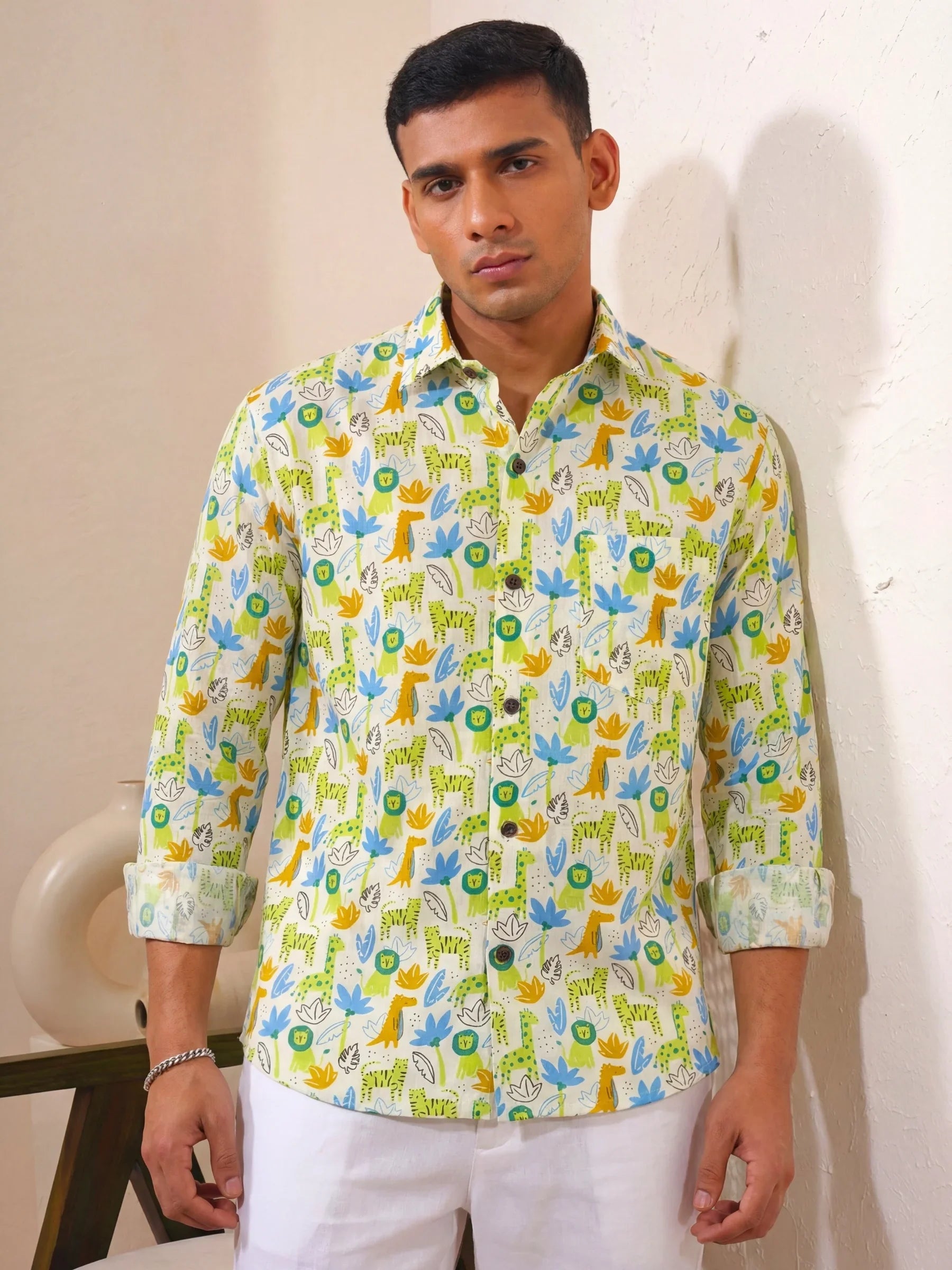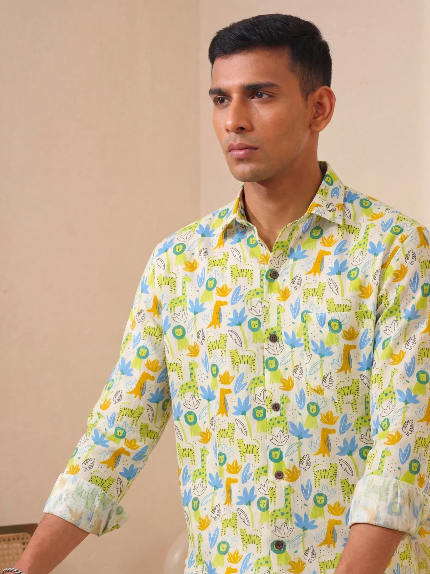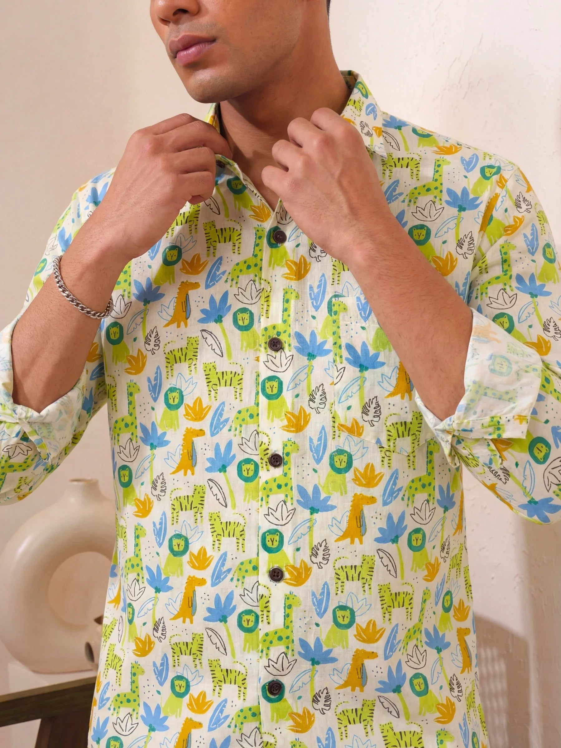 Step into the wild with the Safari Vibes by Jaipuri Crown – a playful Full sleeve cotton shirt featuring an array of vibrant animal prints in lively hues of green, blue, orange, and yellow against a soft cream backdrop. Made from 100% Sanganeri cotton, this shirt combines comfort and style, making it perfect for casual outings, weekend get-togethers, or lively gatherings.