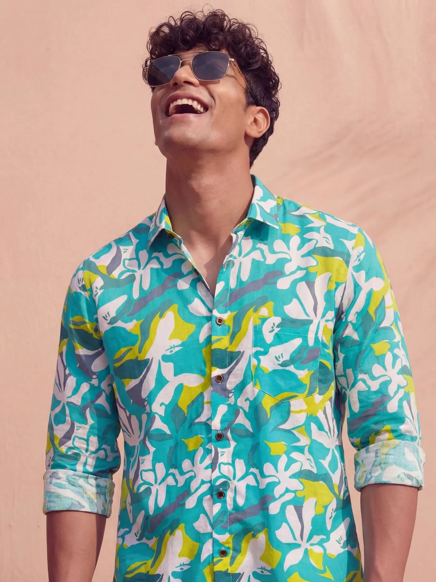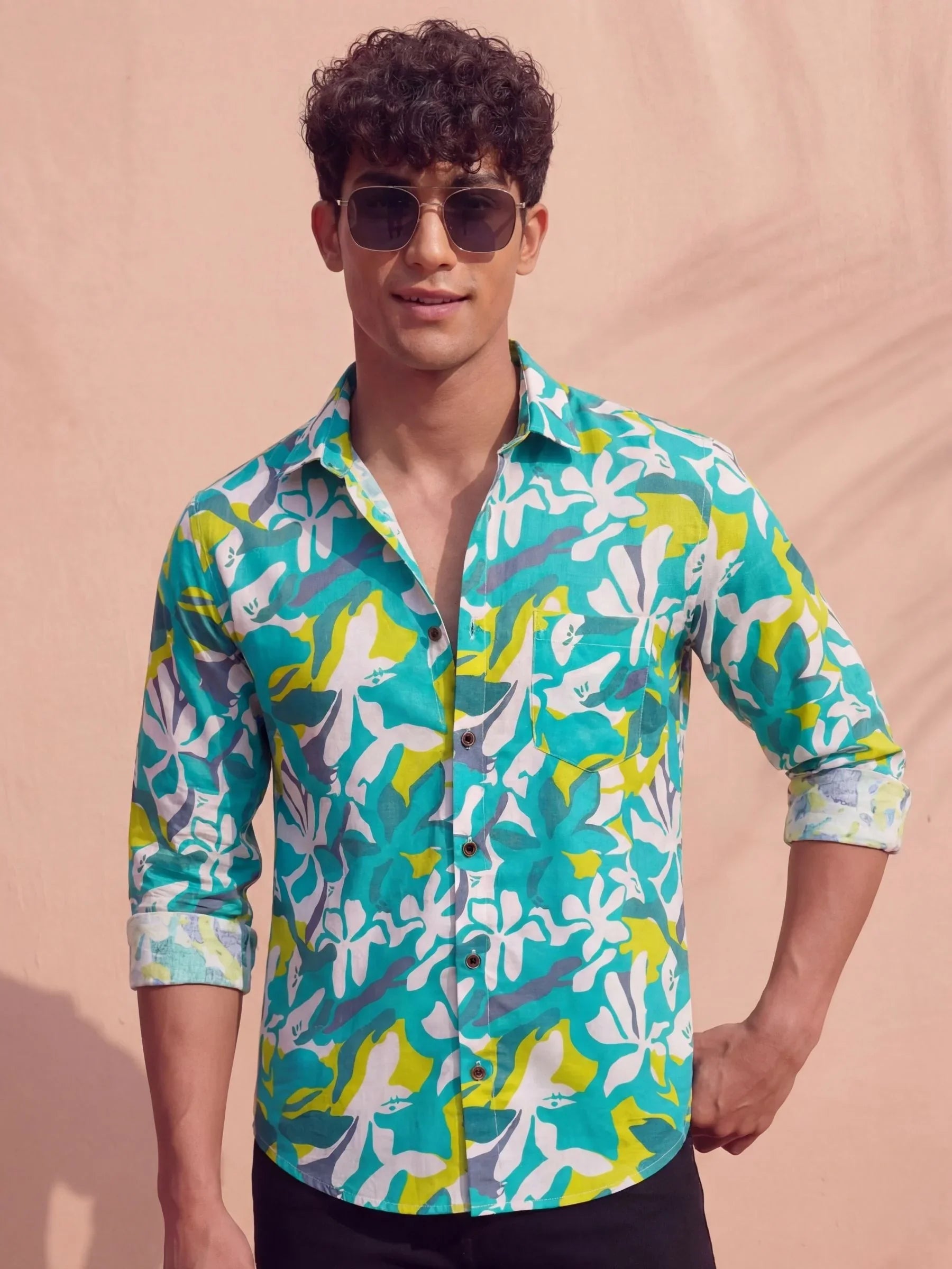 Breathe freshness into your wardrobe with the Aqua Bloom shirt by Jaipuri Crown. This full sleeve printed shirt features a lively mix of teal green, mustard yellow, and ivory-white abstract floral forms over a soft beige base. Crafted from a premium satin blend fabric, it delivers a soft sheen, smooth feel, and lightweight wearability — ideal for daytime style and tropical evenings alike.