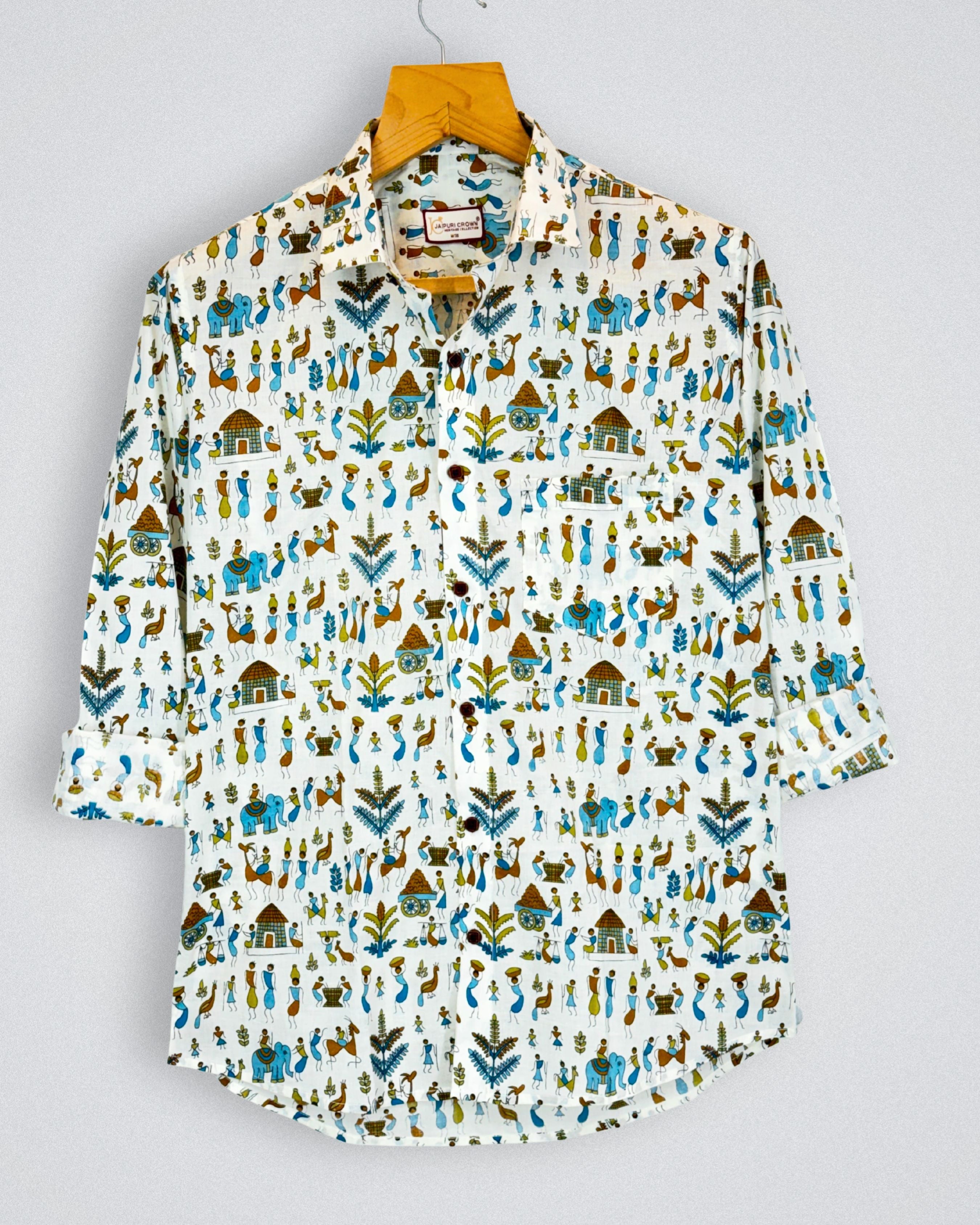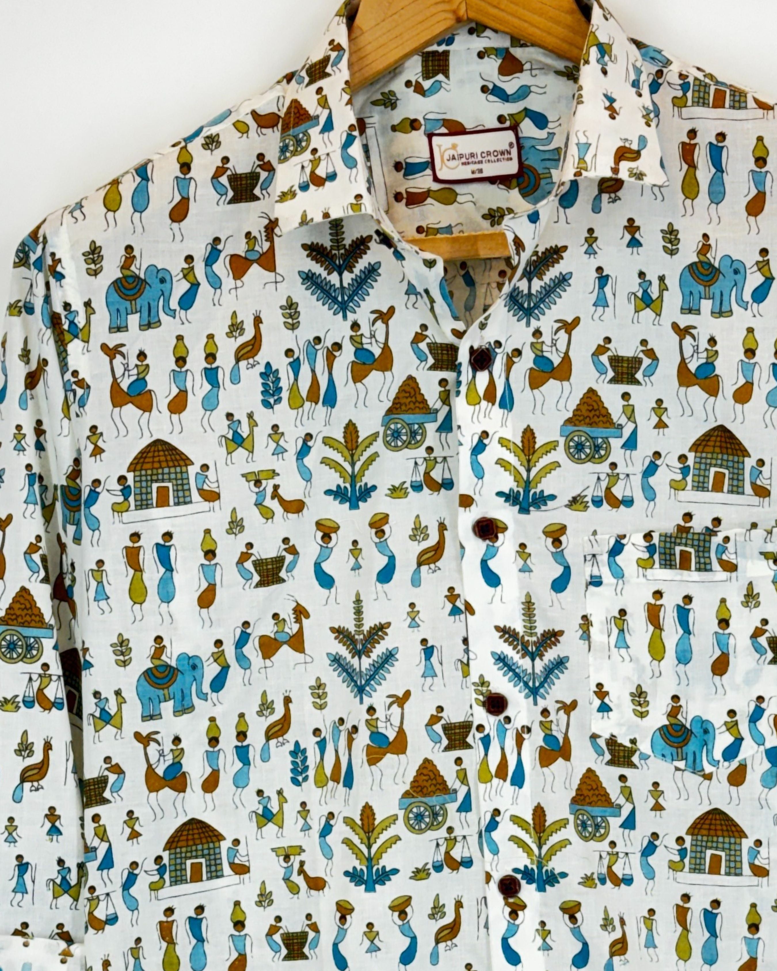 Step into a world of creativity with Artful Echoes by Jaipuri Crown – a charming full sleeve cotton shirt showcasing a delightful print in hues of blue and brown against a creamy backdrop. Made from 100% Sanganeri cotton, this shirt promises a soft touch and breathability, perfect for casual meetups, festivals, or laid-back weekends.