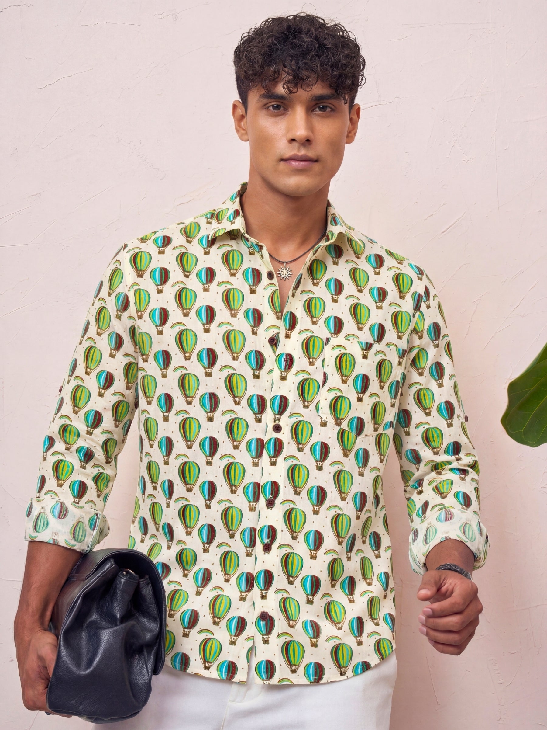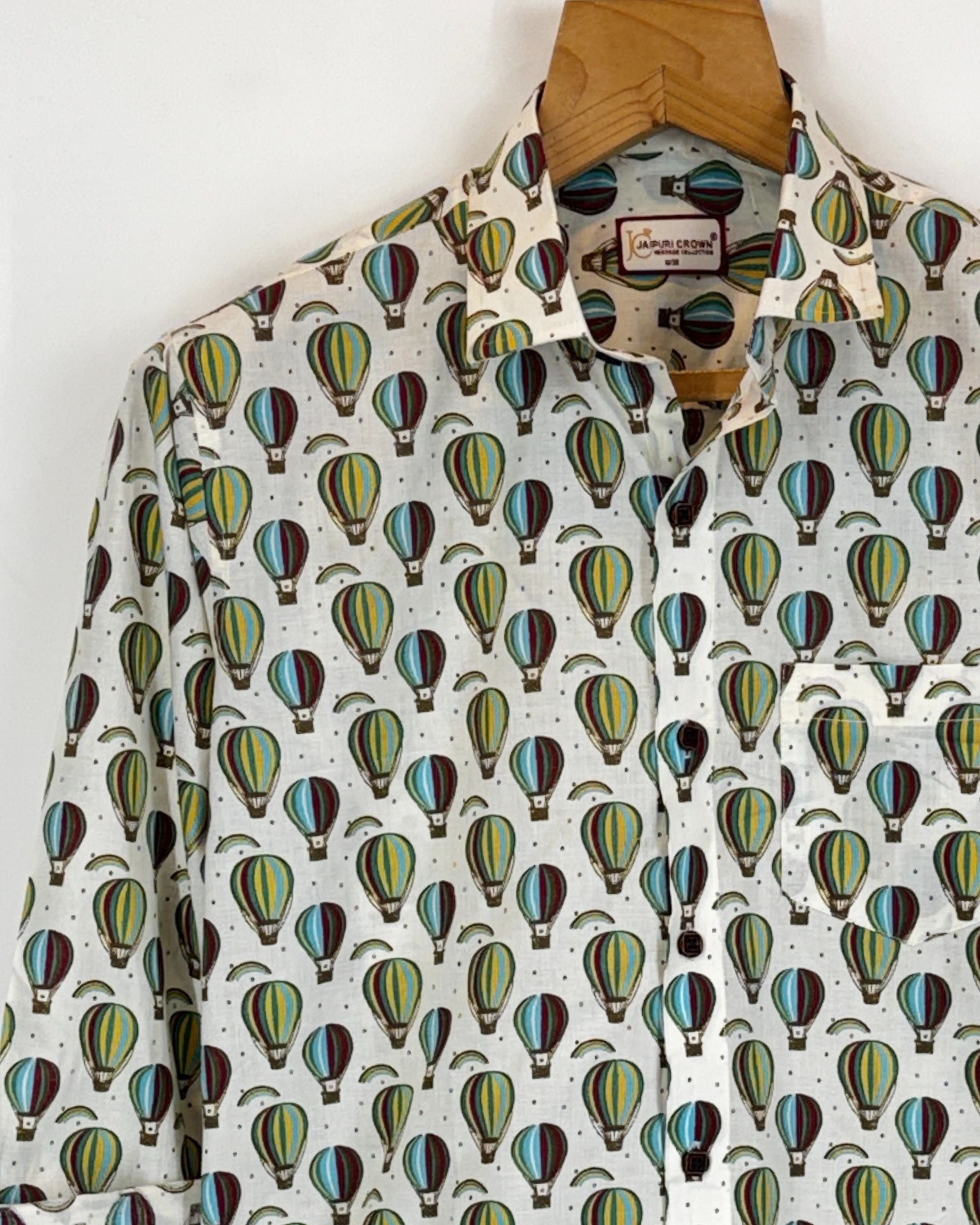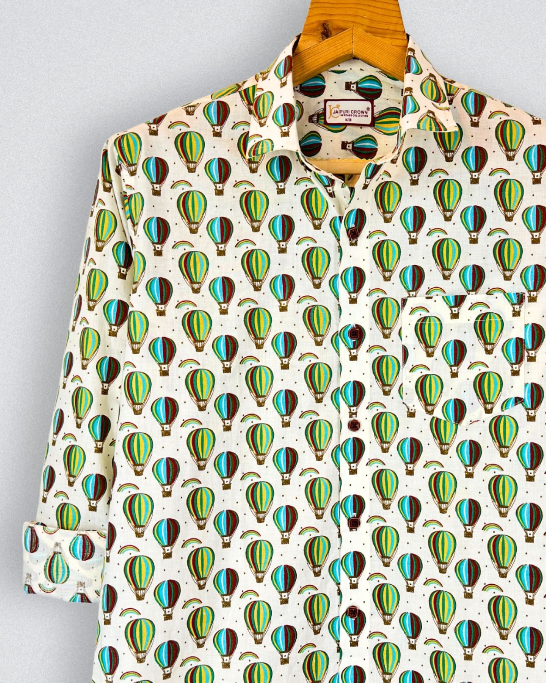 Elevate your casual wardrobe with the Balloon Bliss by Jaipuri Crown – a unique Full sleeve cotton shirt featuring a playful balloon print in vibrant shades of red, blue, and green on a soft cream backdrop. Made from 100% Sanganeri cotton, this shirt ensures a lightweight and breathable fit, making it ideal for outings, gatherings, or laid-back weekends.