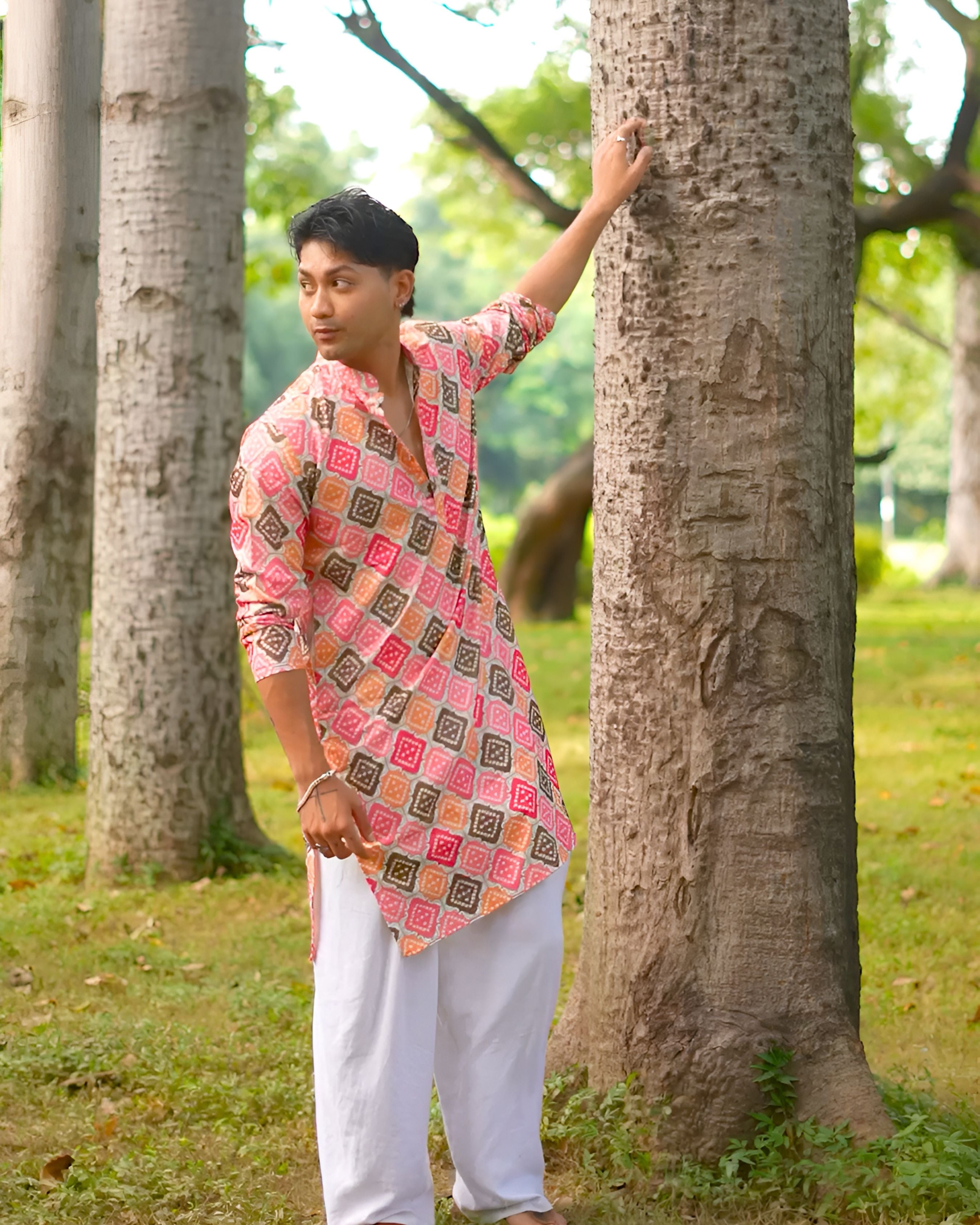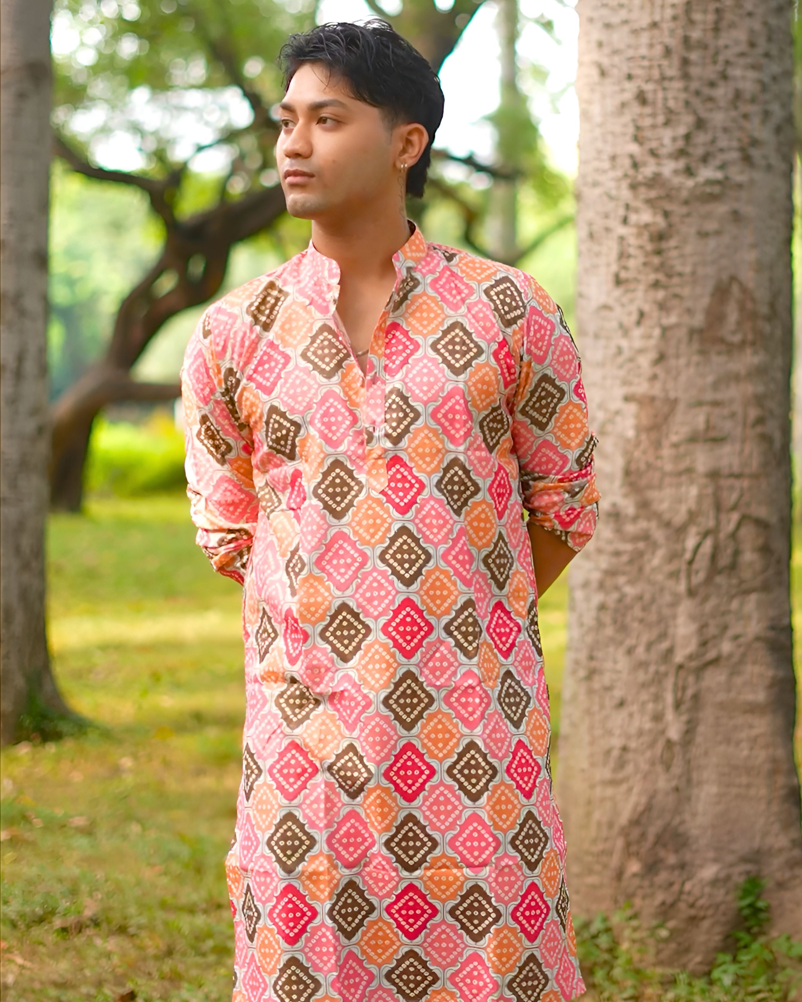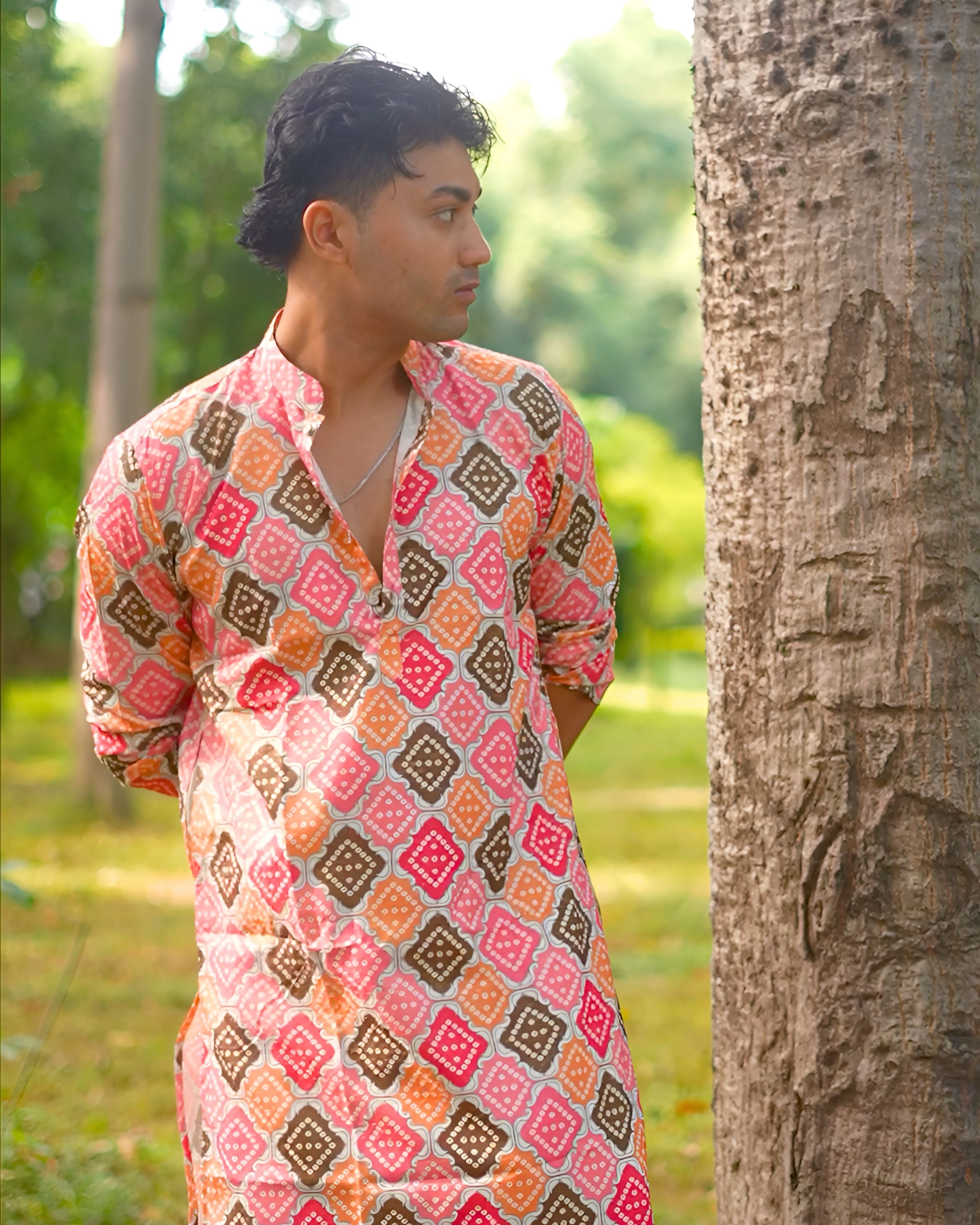 Make a vibrant statement in this eye-catching Bandhani long kurta, a testament to the traditional tie-dye craftsmanship of India. 🎨 The unique, intricate patterns in a medley of pink, orange, brown, and red create a lively and festive look. 👀 This kurta is perfect for special occasions, cultural events, or simply adding a pop of color to your wardrobe. ✨ With a classic mandarin collar and a comfortable fit, it's both stylish and easy to wear. ✅