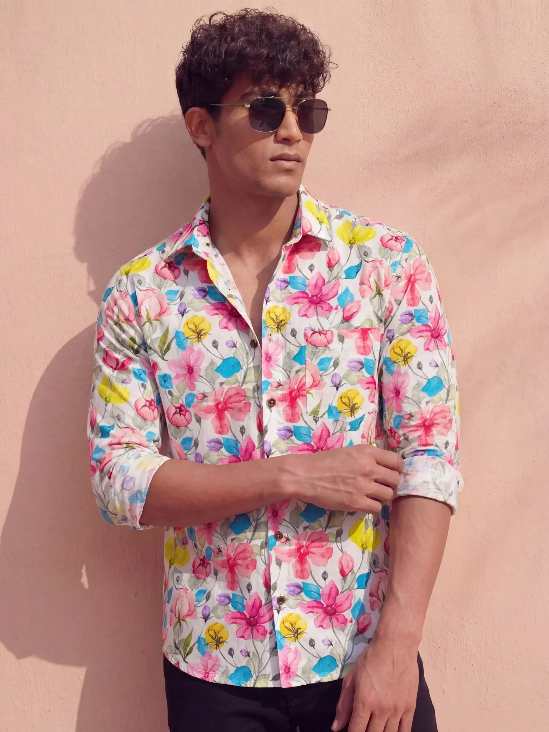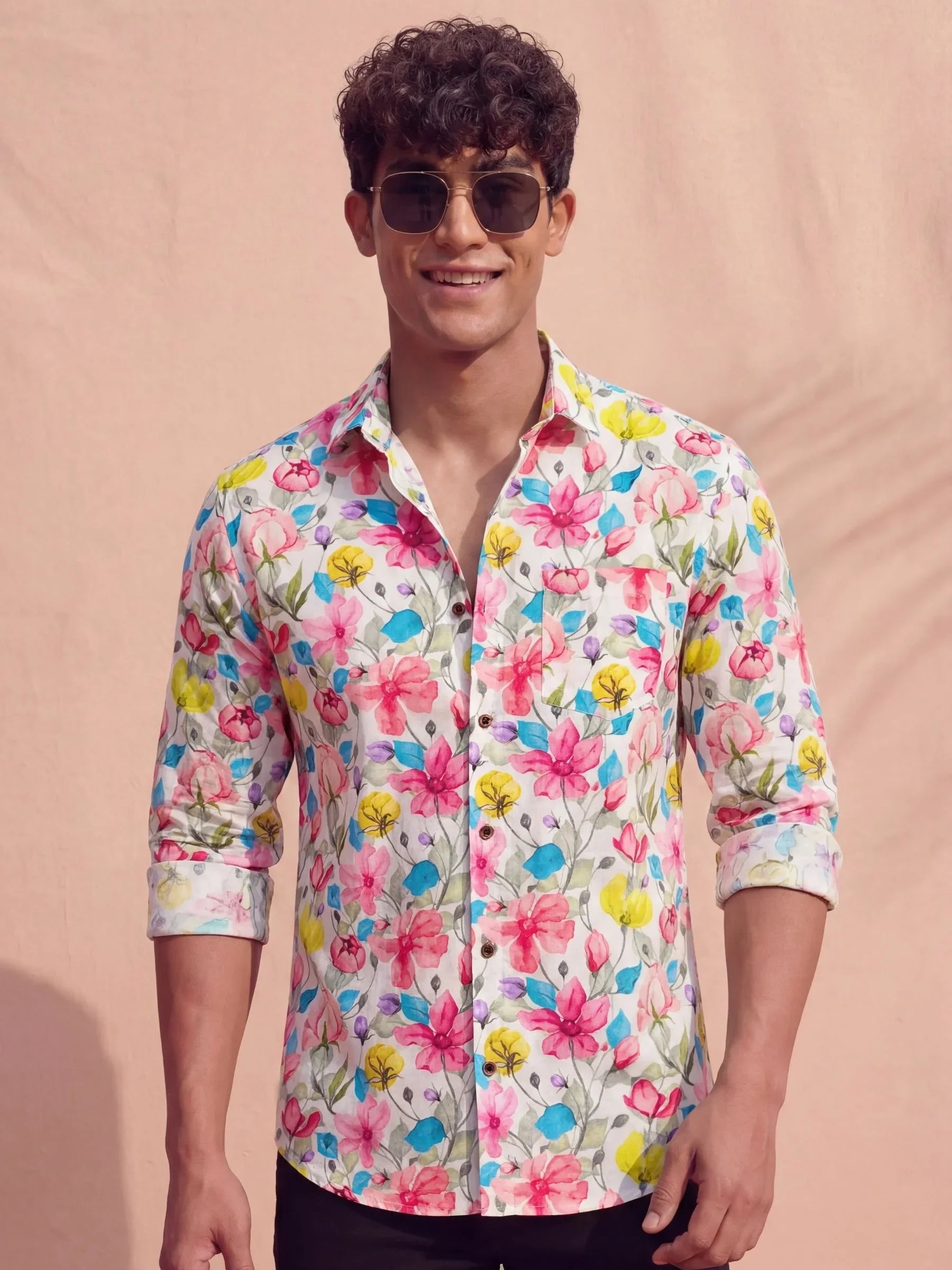 Let your wardrobe burst with color in the Bloom Pop shirt by Jaipuri Crown. Designed with vibrant hand-painted floral motifs in hot pink, lemon yellow, sky blue, and lilac on a subtle light-grey base, this full sleeve shirt brings joy and energy to any look. Crafted from premium satin blend fabric, it gives you that rich shine with a breezy, breathable touch.