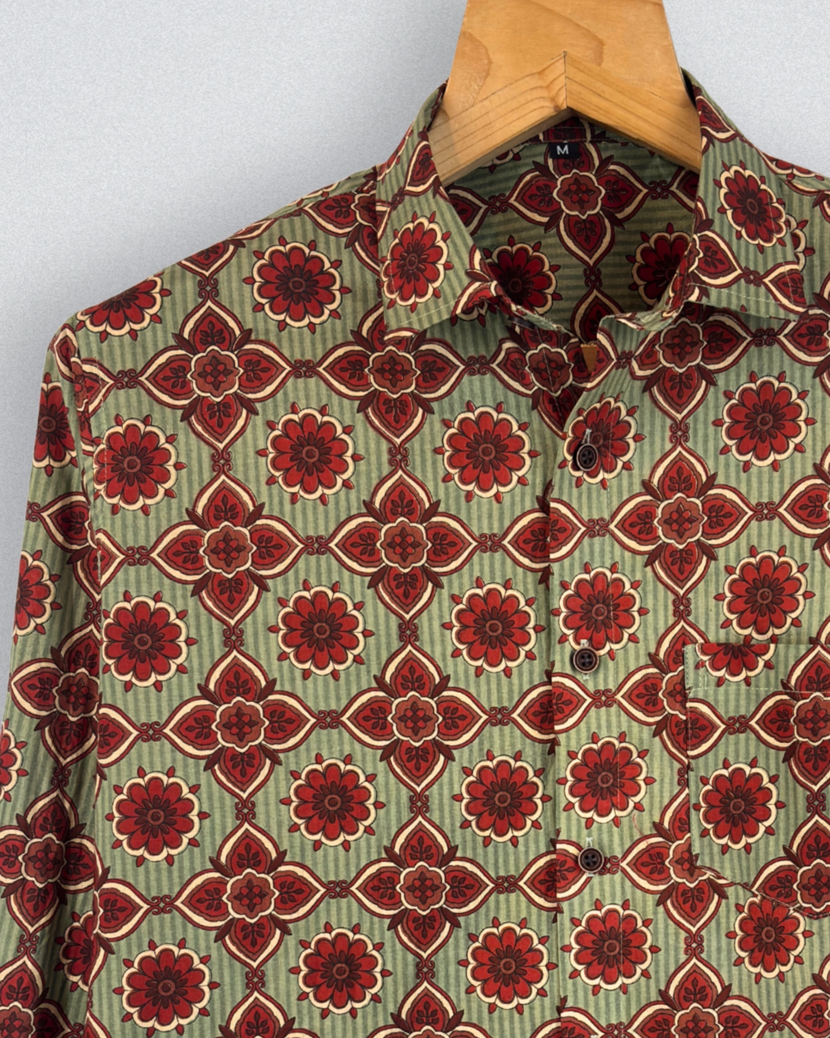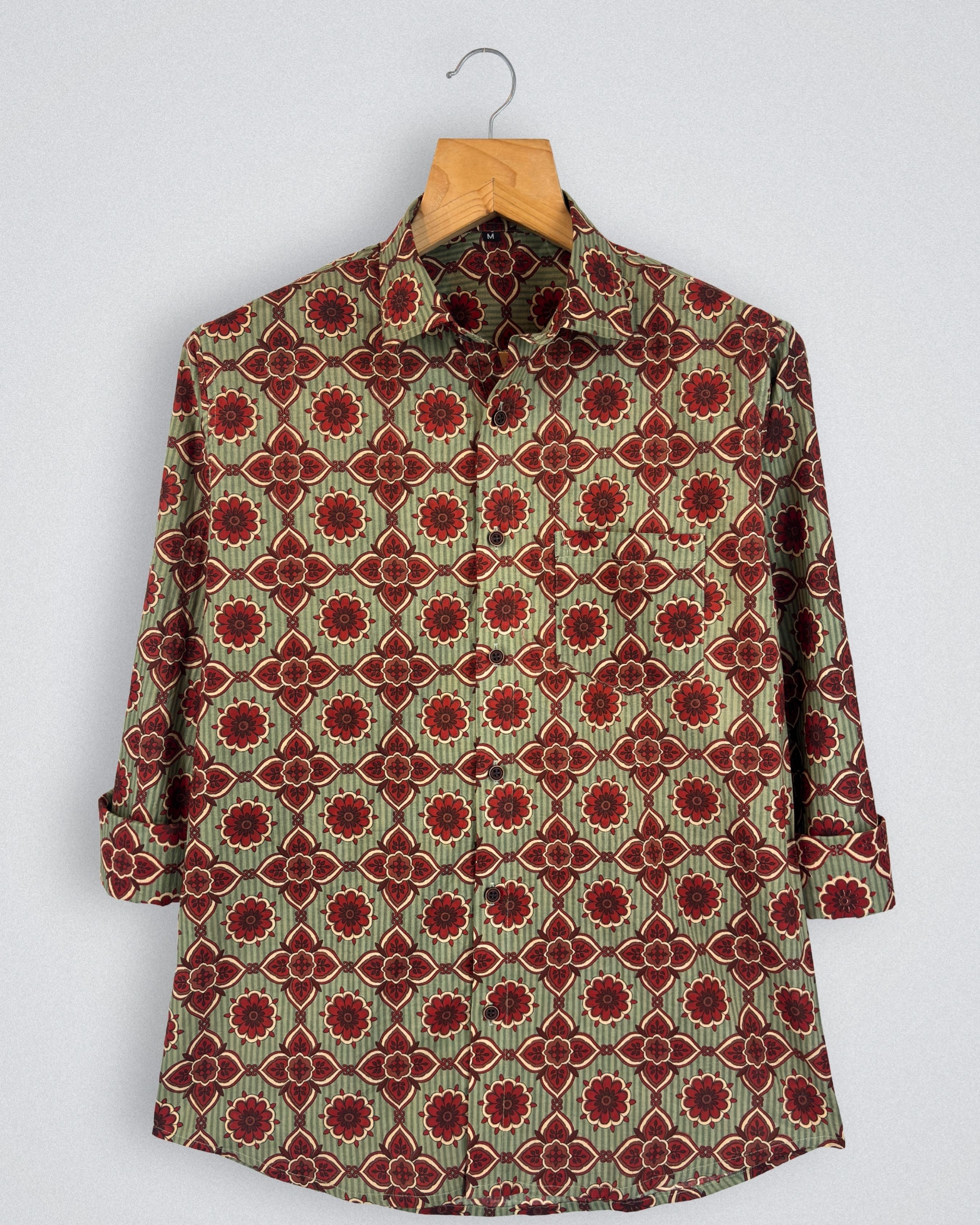Step into style with Blossom Charm by Jaipuri Crown – a striking Full sleeve cotton shirt featuring a captivating floral print in rich red against a subtle olive backdrop. Crafted from 100% Sanganeri cotton, this shirt ensures a soft and breathable experience, making it suitable for casual gatherings, festive occasions, or relaxed weekends.