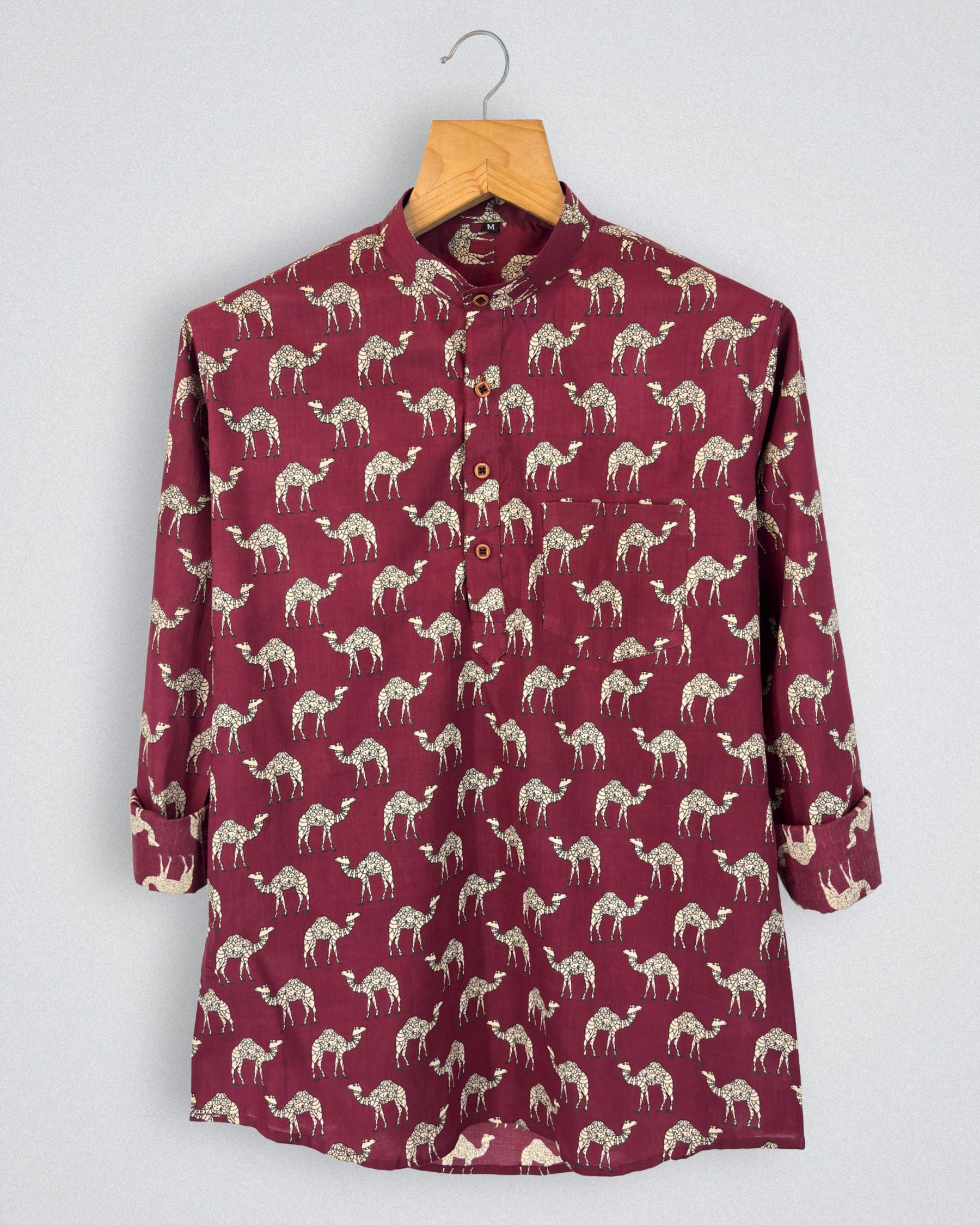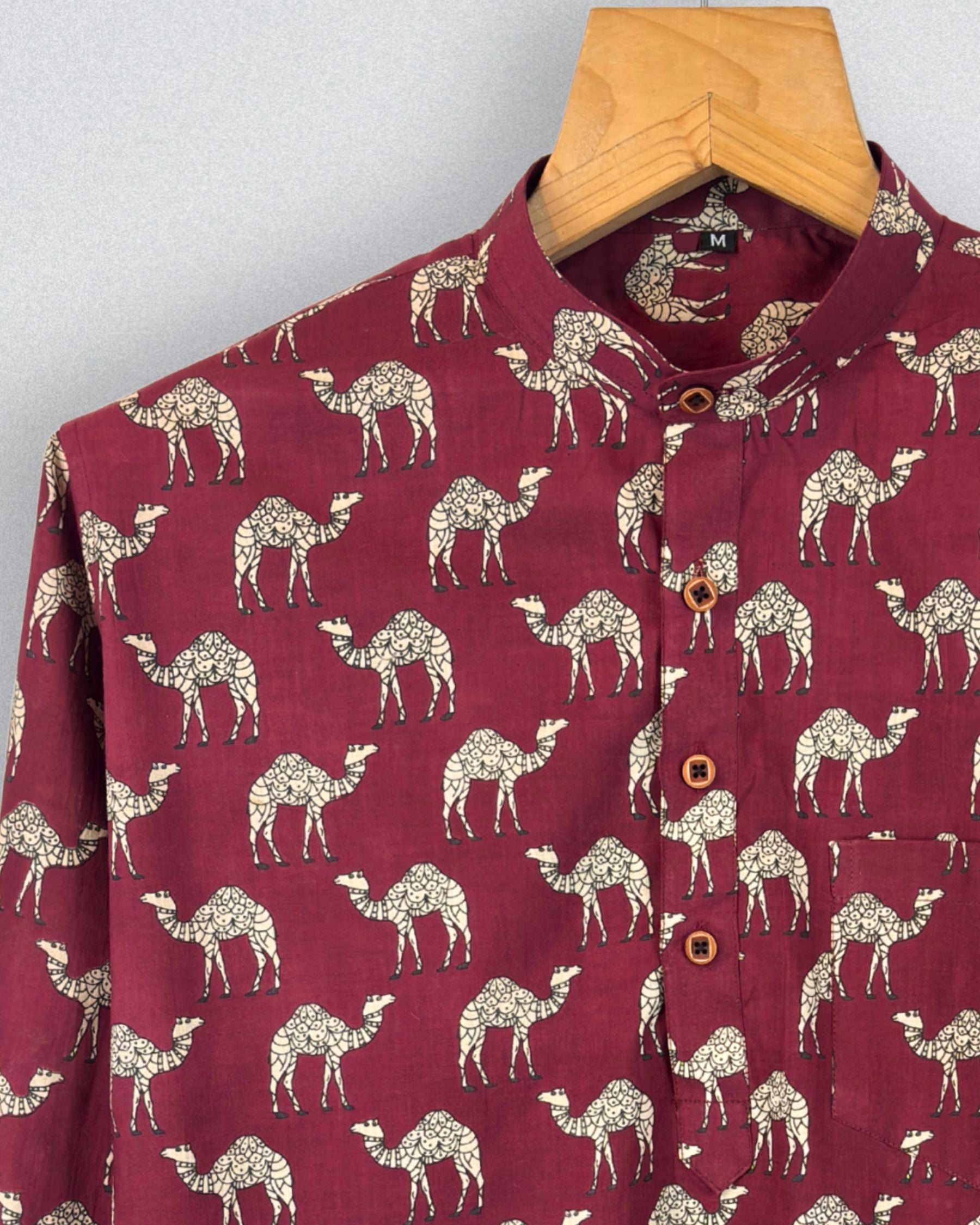Step into the exotic with Camel Dance by Jaipuri Crown – a vibrant Short Kurta featuring a playful camel print in cream against a rich burgundy backdrop. Made from 100% Sanganeri cotton, this Kurta combines comfort with style, making it ideal for festive occasions or casual gatherings.