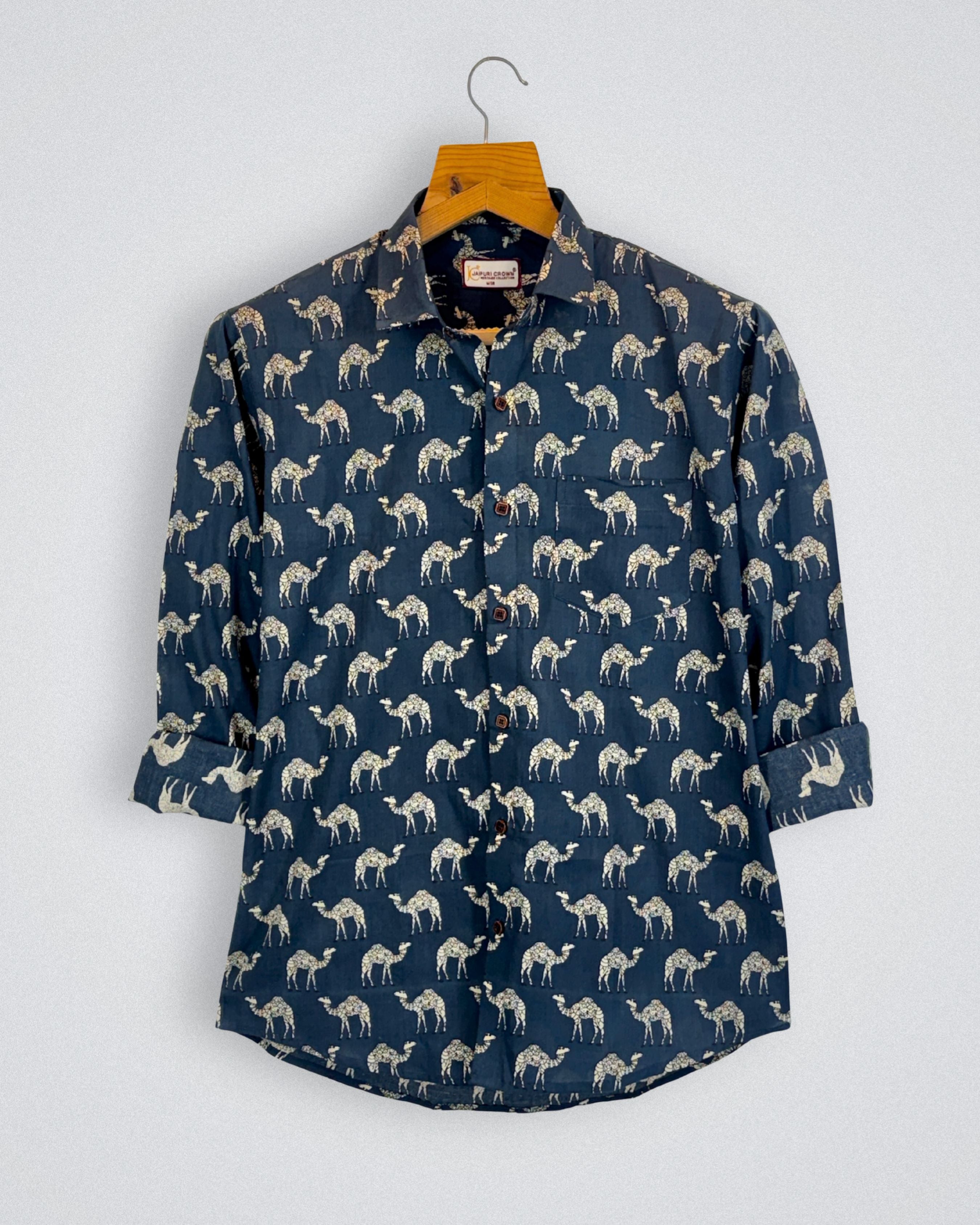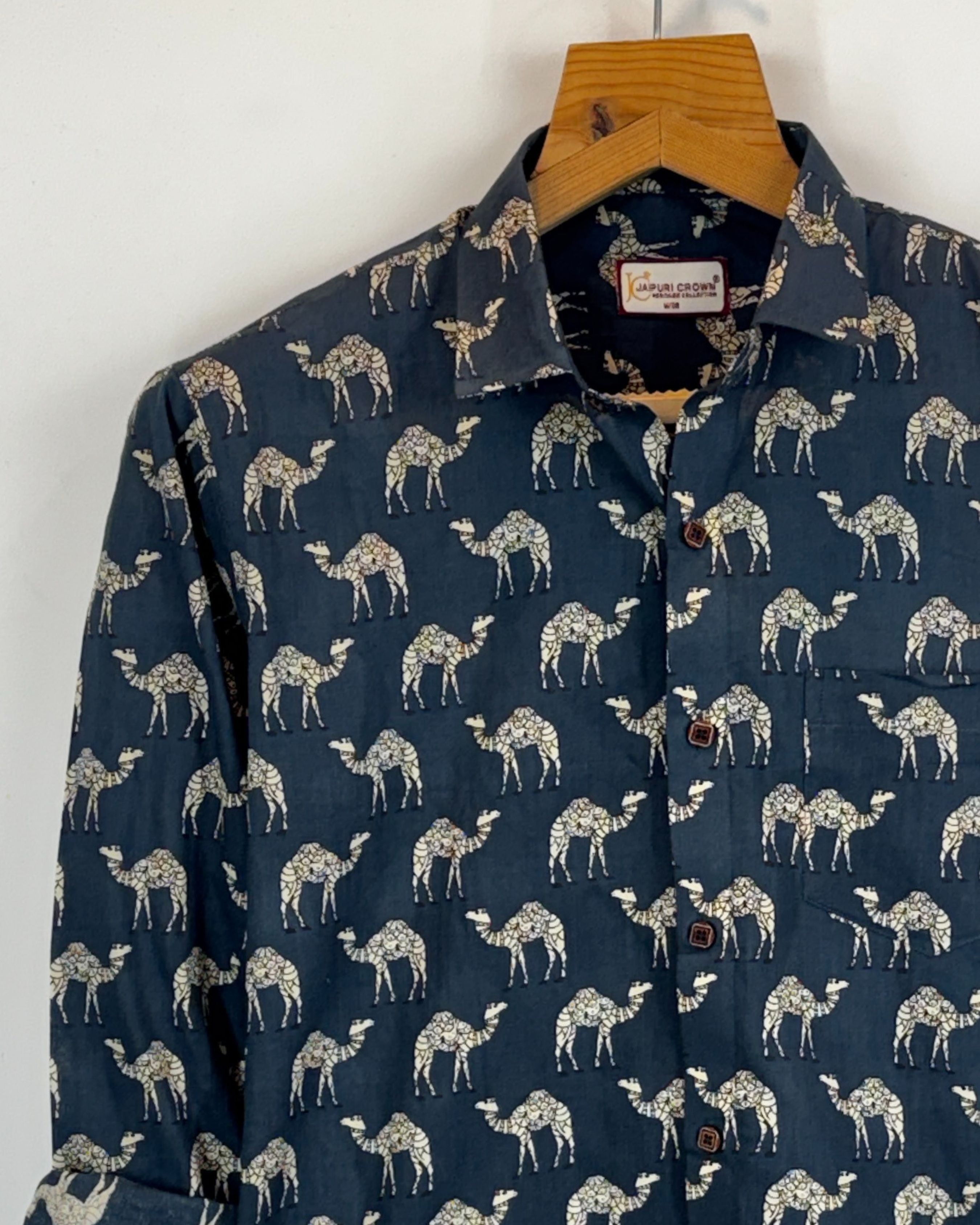 Step out in style with the Camel Heritage by Jaipuri Crown – a charming Full sleeve cotton shirt featuring a playful giraffe print in beige against a deep navy background. Made from 100% Sanganeri cotton, this shirt offers a soft, breathable feel, perfect for casual gatherings, outings, or relaxed weekends.
