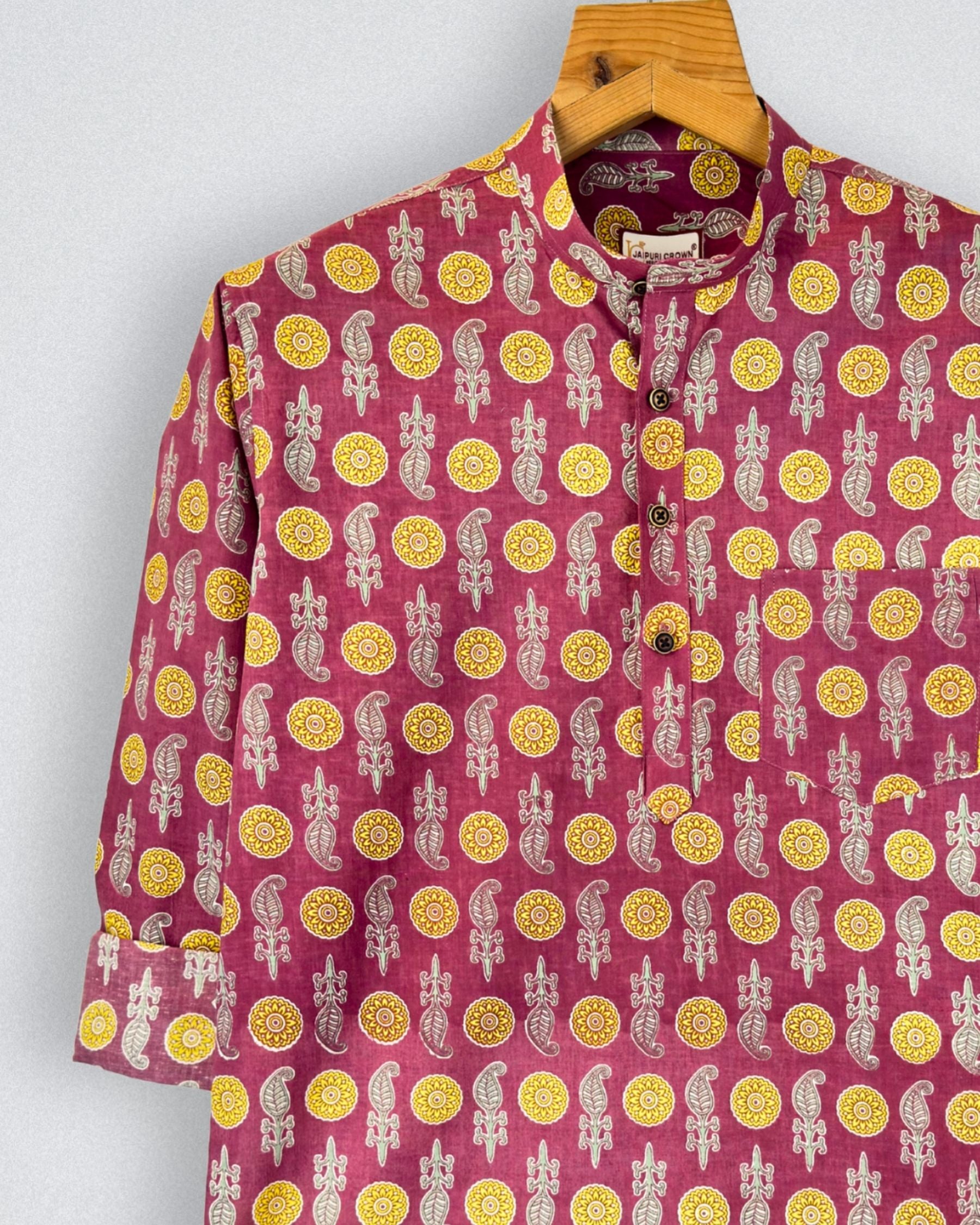 Step into a world of vibrant colors with Floral Harmony by Jaipuri Crown – a stunning Short Kurta featuring an eye-catching floral print in pink and yellow on a rich maroon background. Made from 100% Sanganeri cotton, this Kurta ensures utmost comfort and breathability, making it an ideal choice for festive occasions, brunches, or casual outings.