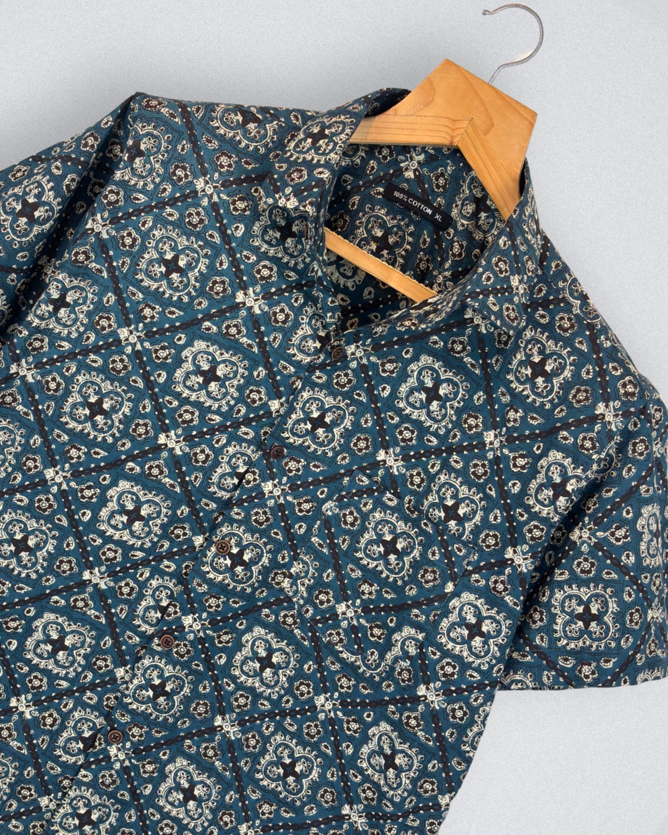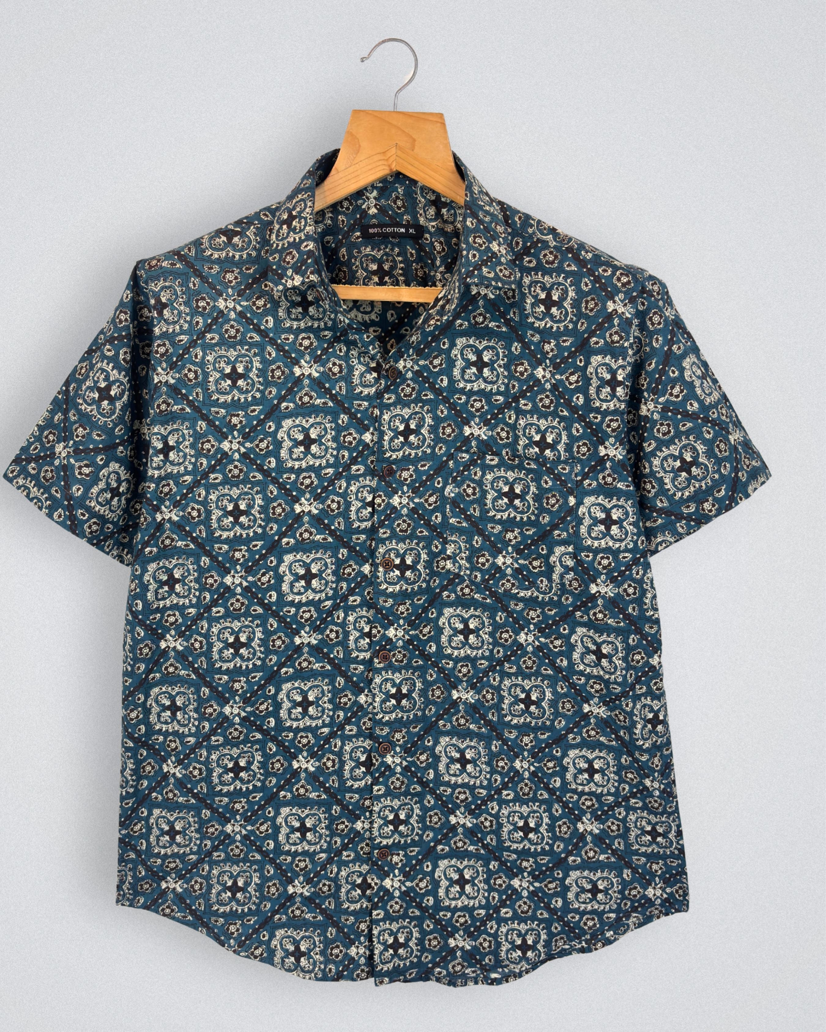 Bring heritage elegance to your everyday look with Indigo Mosaic by Jaipuri Crown — a stunning blue cotton shirt featuring intricate cream and brown geometric block prints. Designed with a relaxed half-sleeve fit and breathable cotton fabric, it blends timeless Rajasthani artistry with modern style for effortless charm.