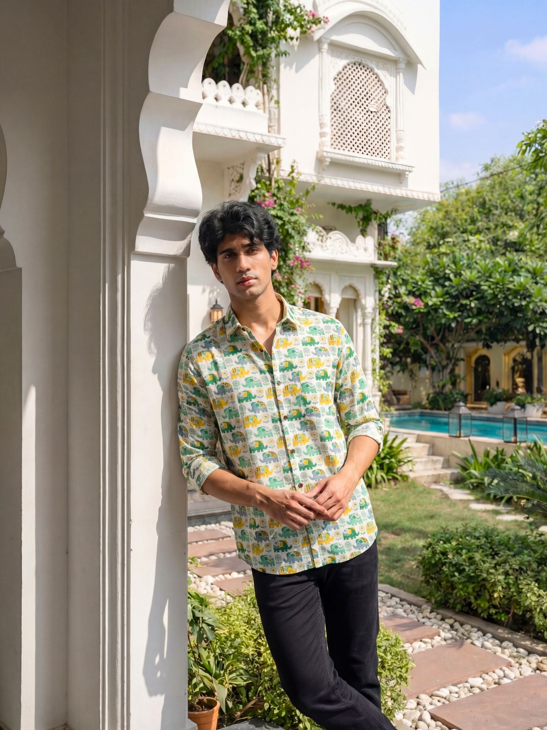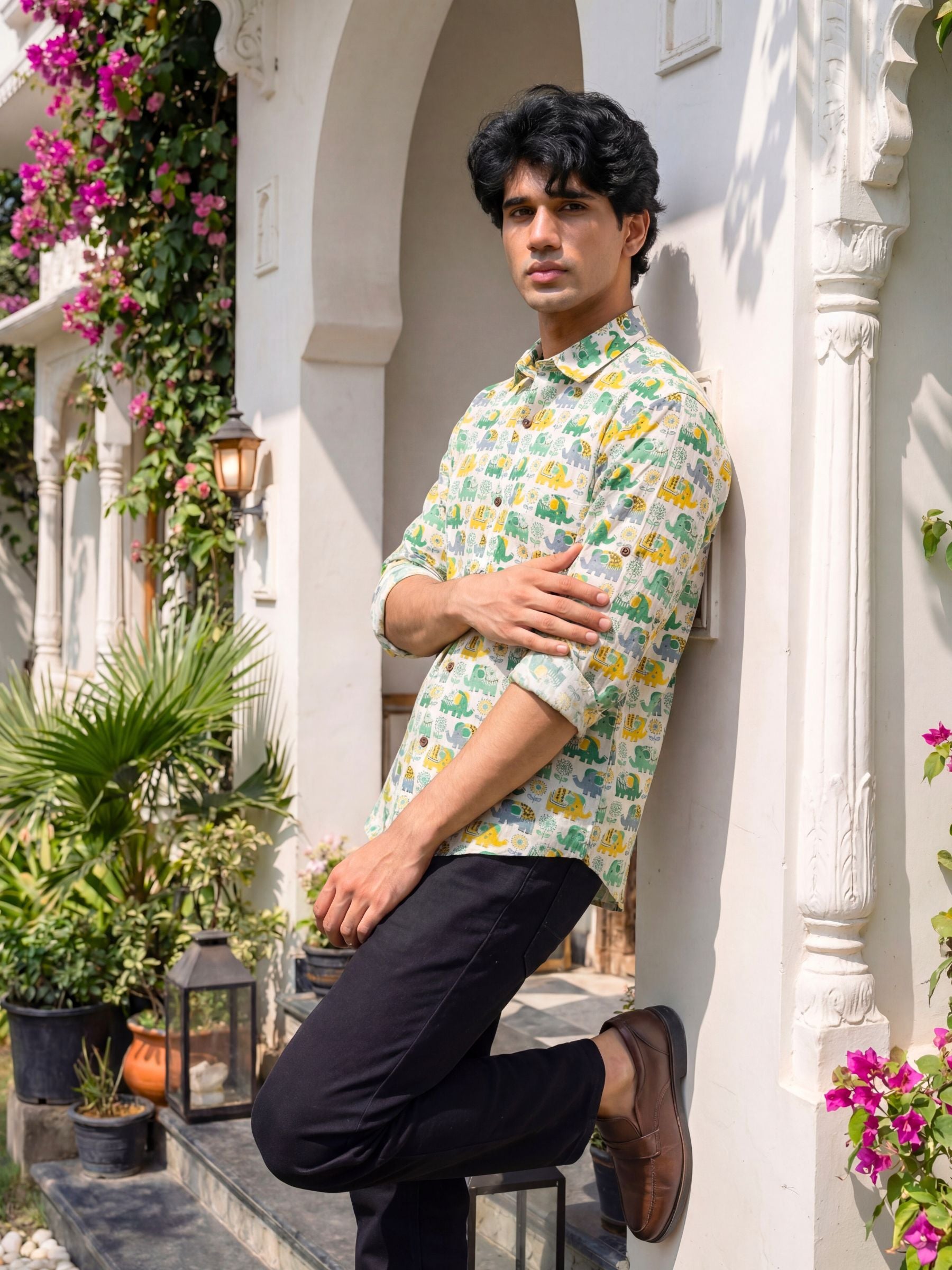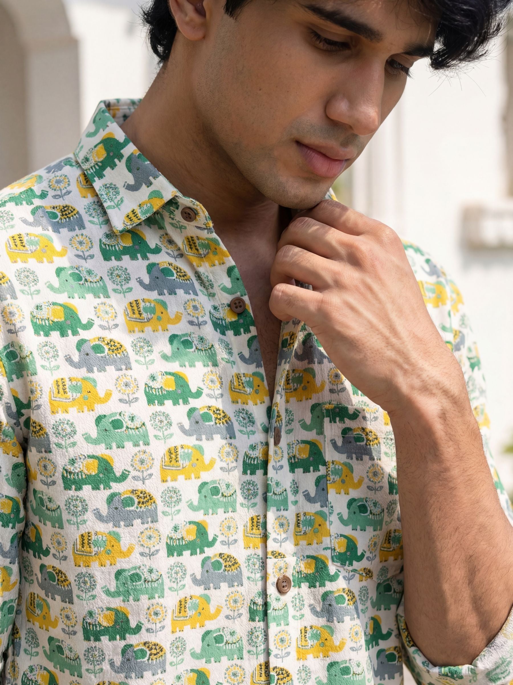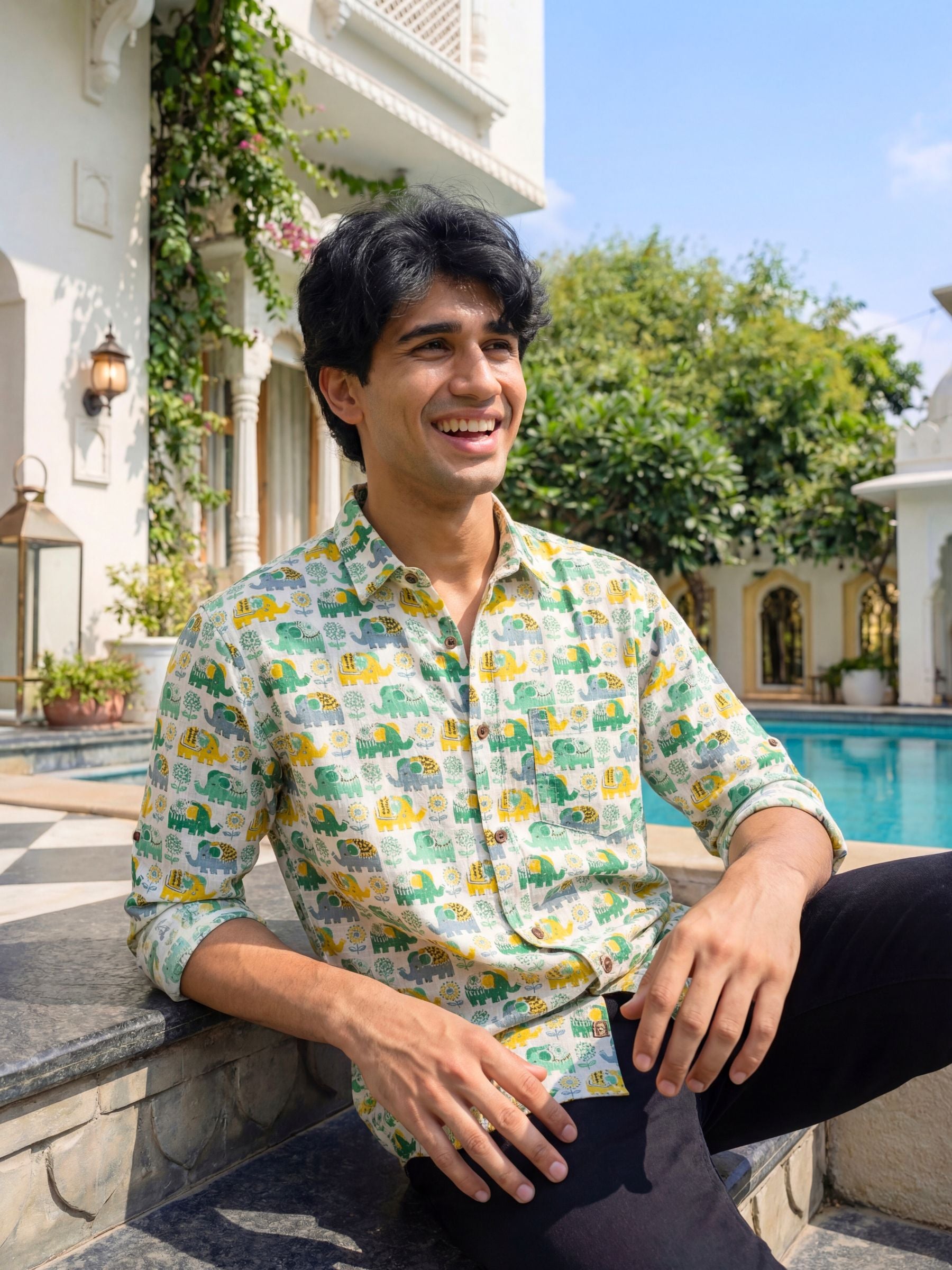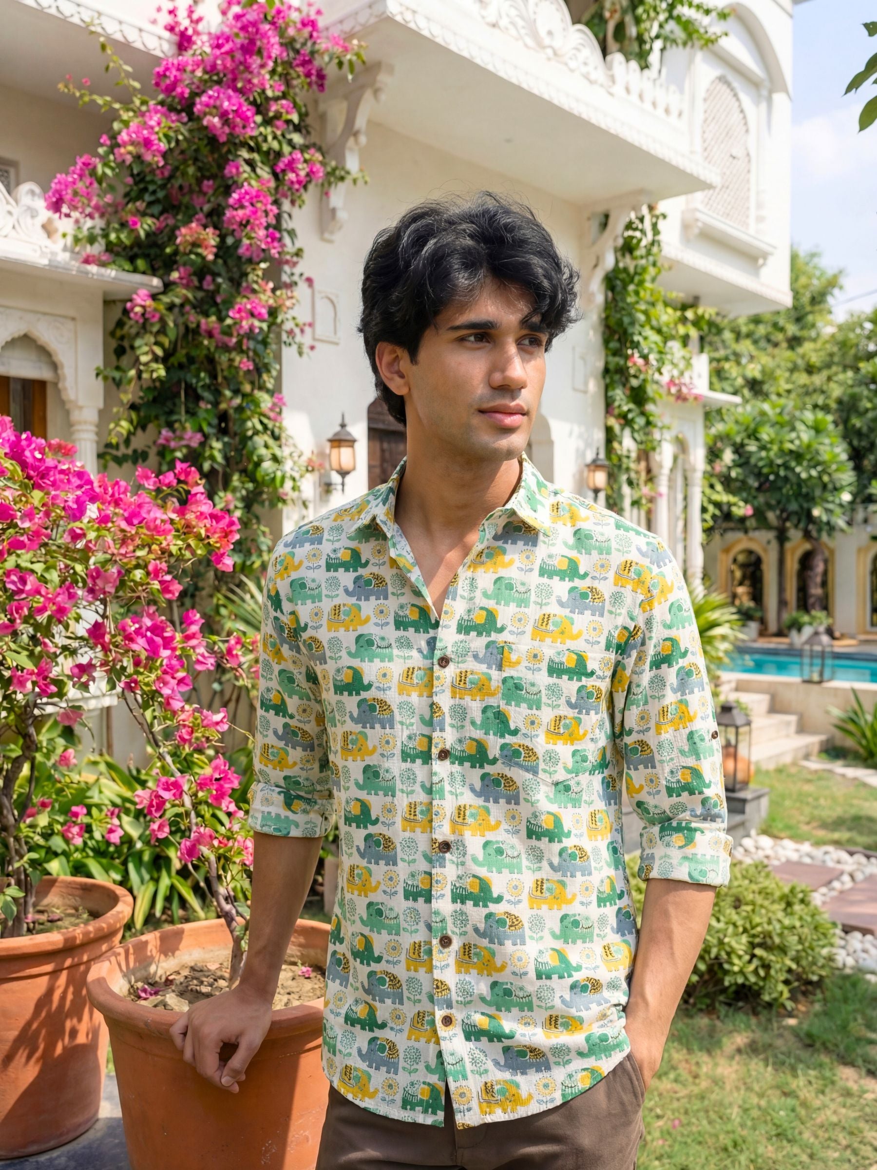 Step into a world of vibrant colors with Elephant Parade by Jaipuri Crown – a charming Full sleeve cotton shirt featuring a delightful elephant print in shades of green, yellow, and blue against a cream backdrop. Made from 100% Sanganeri cotton, this shirt promises exceptional comfort and breathability, making it an ideal choice for casual outings, festive occasions, or laid-back weekends.
