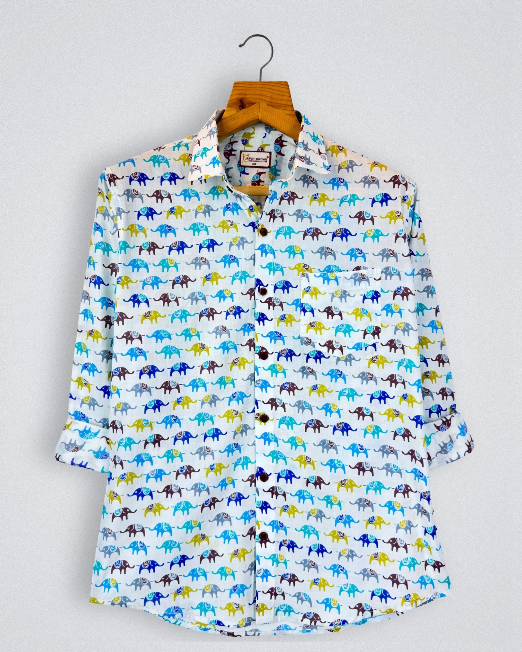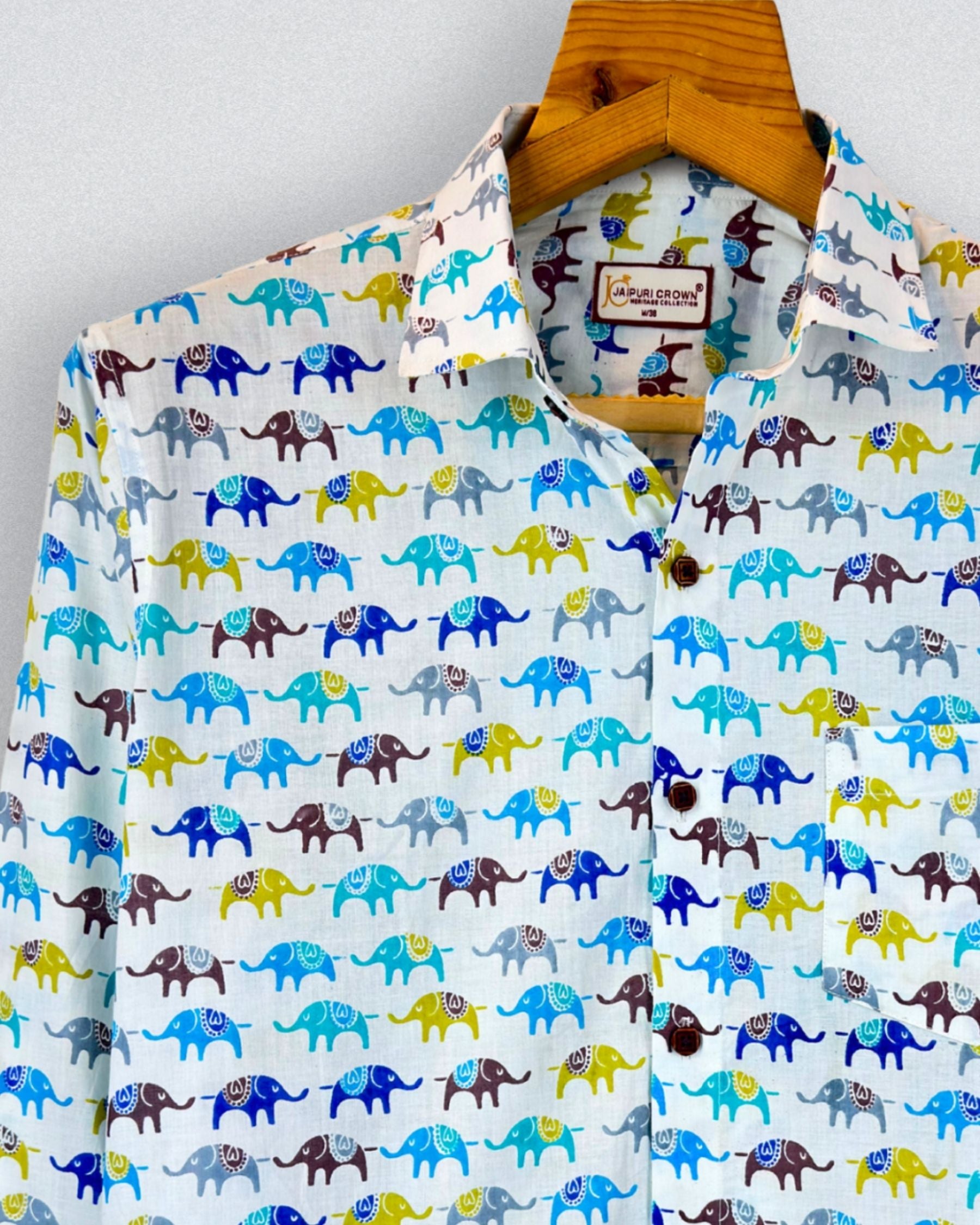 Step into style with our Elephant Parade by Jaipuri Crown – a charming Full sleeve cotton shirt featuring an adorable elephant print in vibrant colors against a soft white base. Made from 100% breathable cotton, this shirt ensures comfort throughout your day, whether you're out with friends, enjoying a family gathering, or simply relaxing at home.