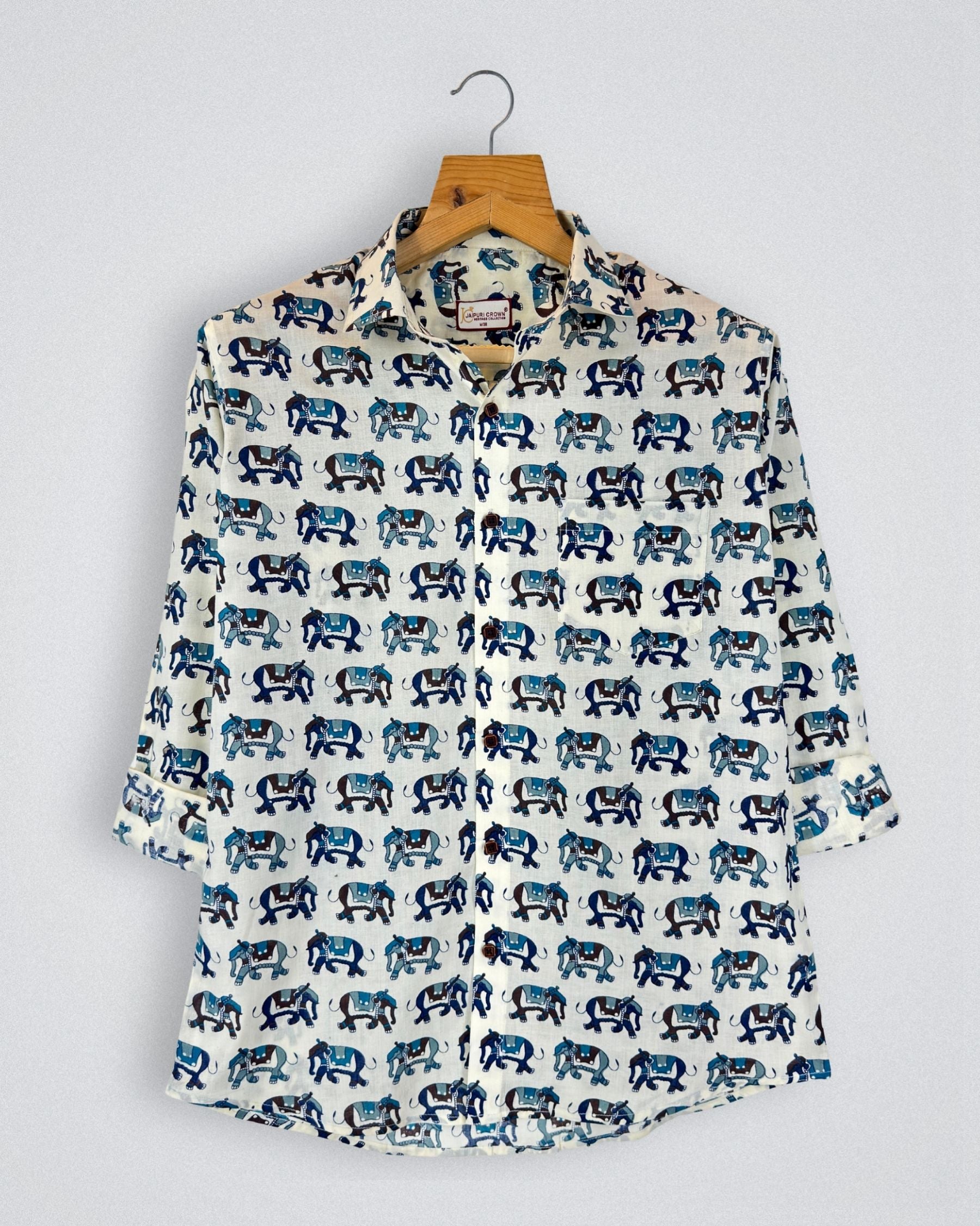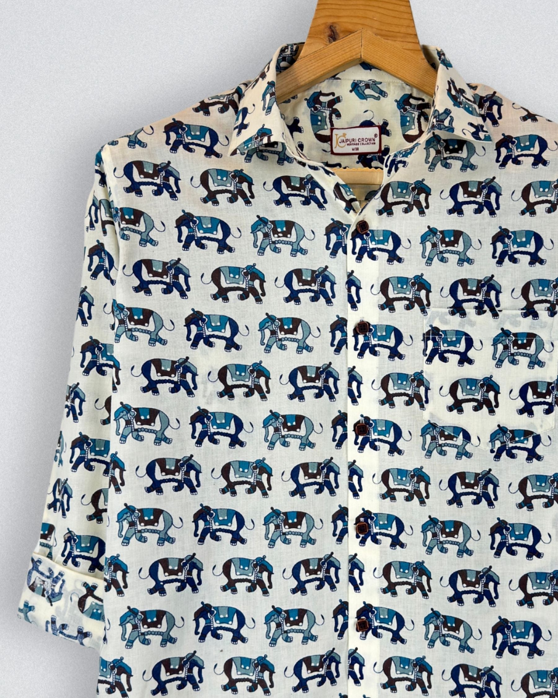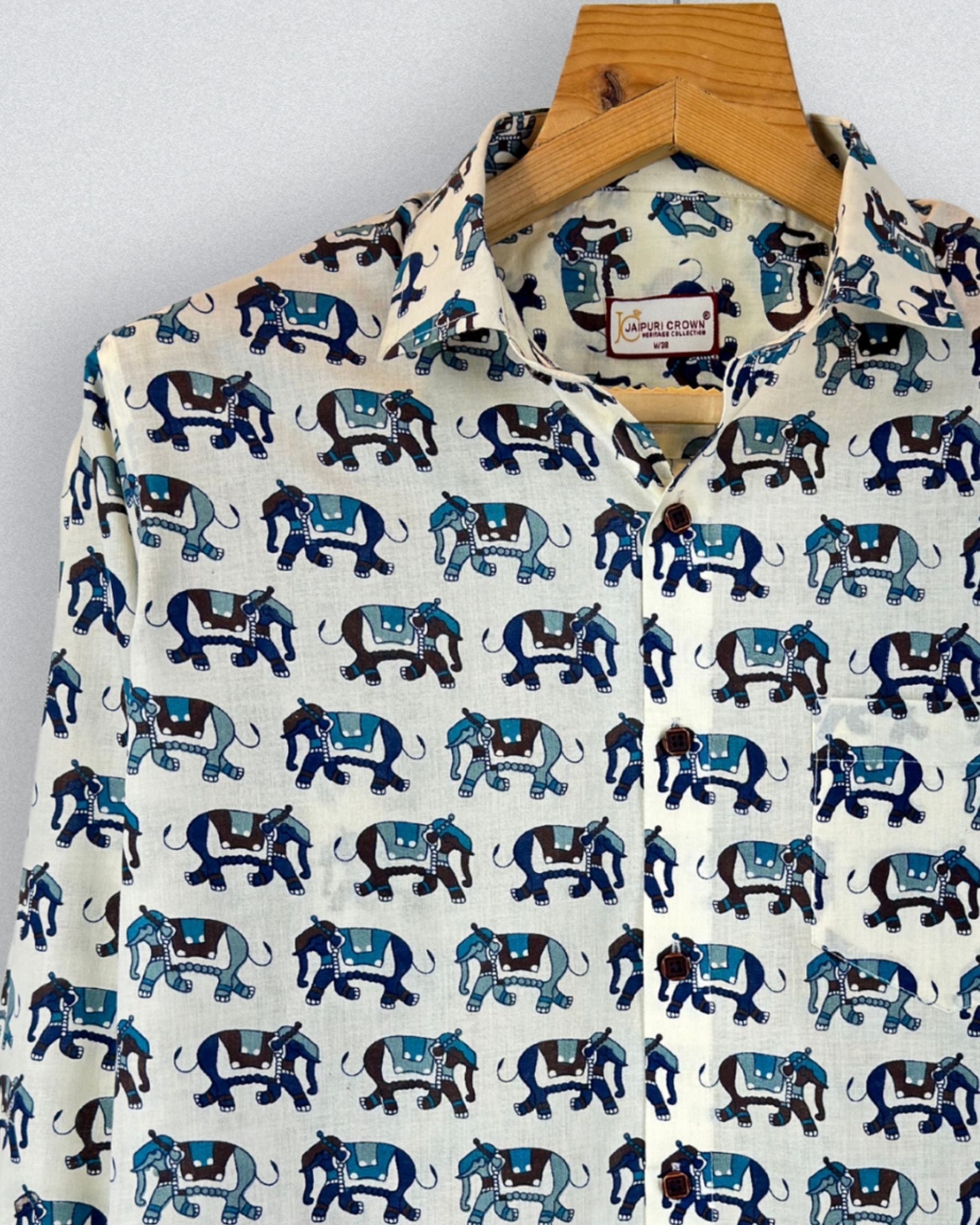 Step into a world of whimsical charm with Elephant Dance by Jaipuri Crown – a trendy Full sleeve cotton shirt featuring an eye-catching elephant motif in shades of blue and brown on a soft cream background. Made from 100% Sanganeri cotton, this shirt is designed to provide a breathable and comfortable fit, making it a perfect choice for casual gatherings, outings, or laid-back weekends.