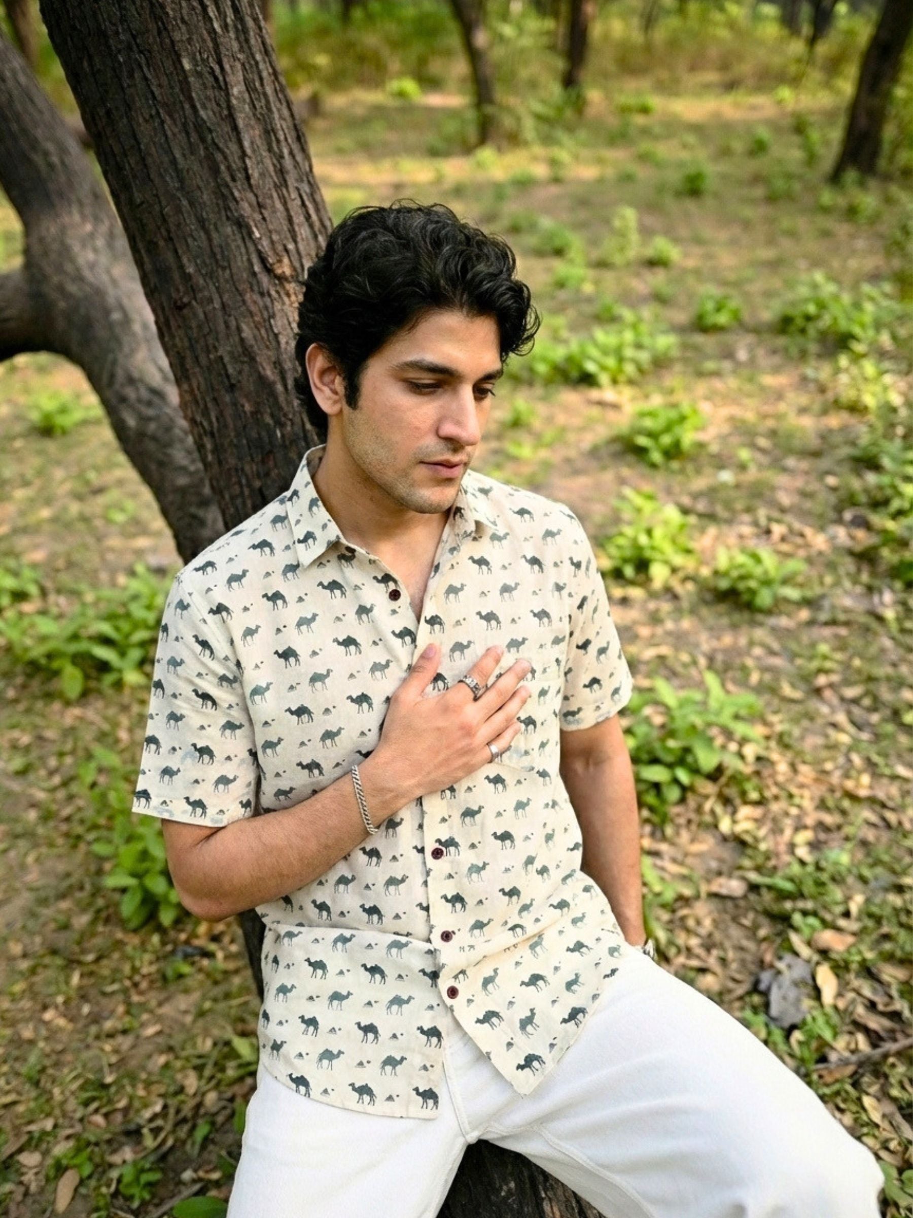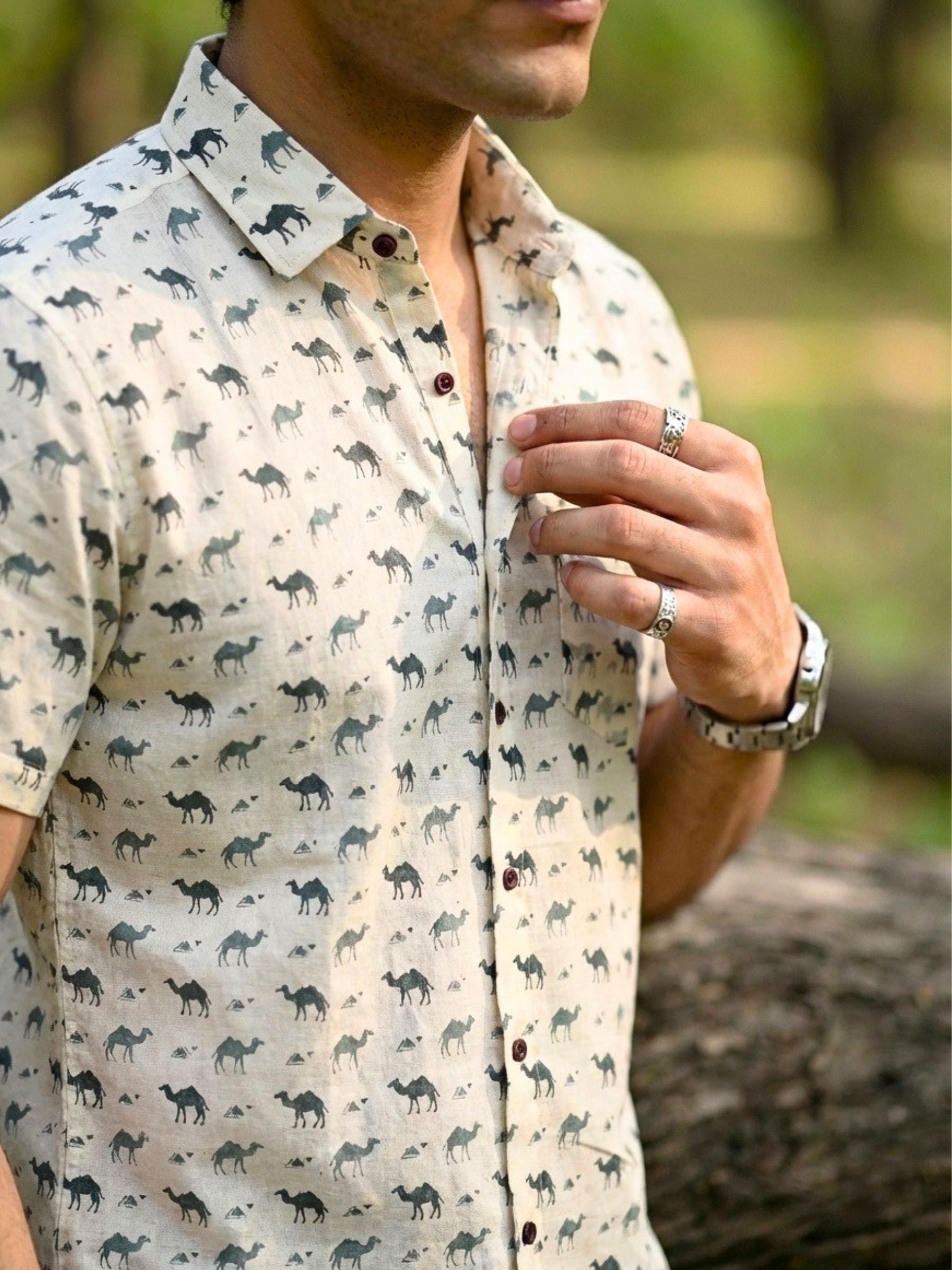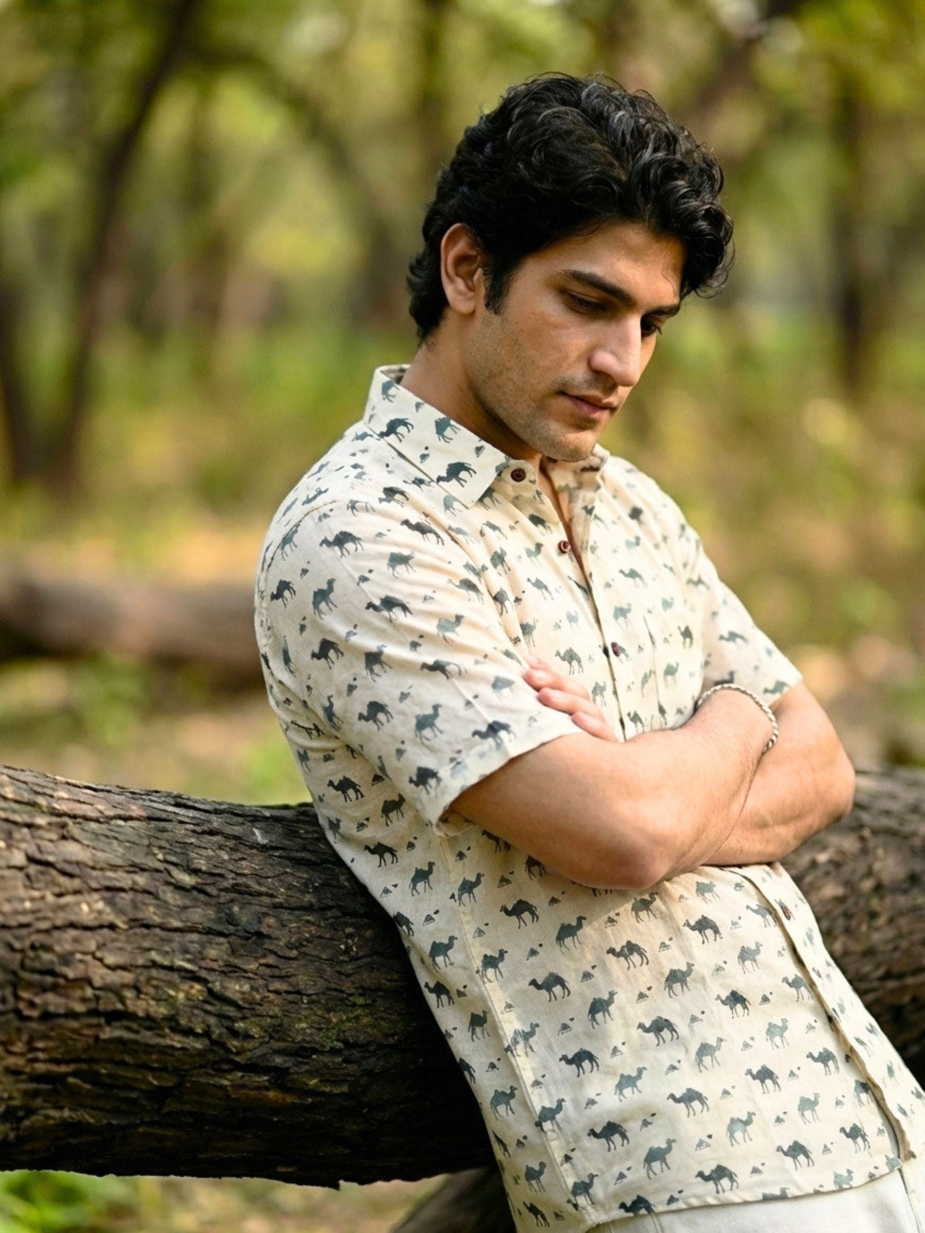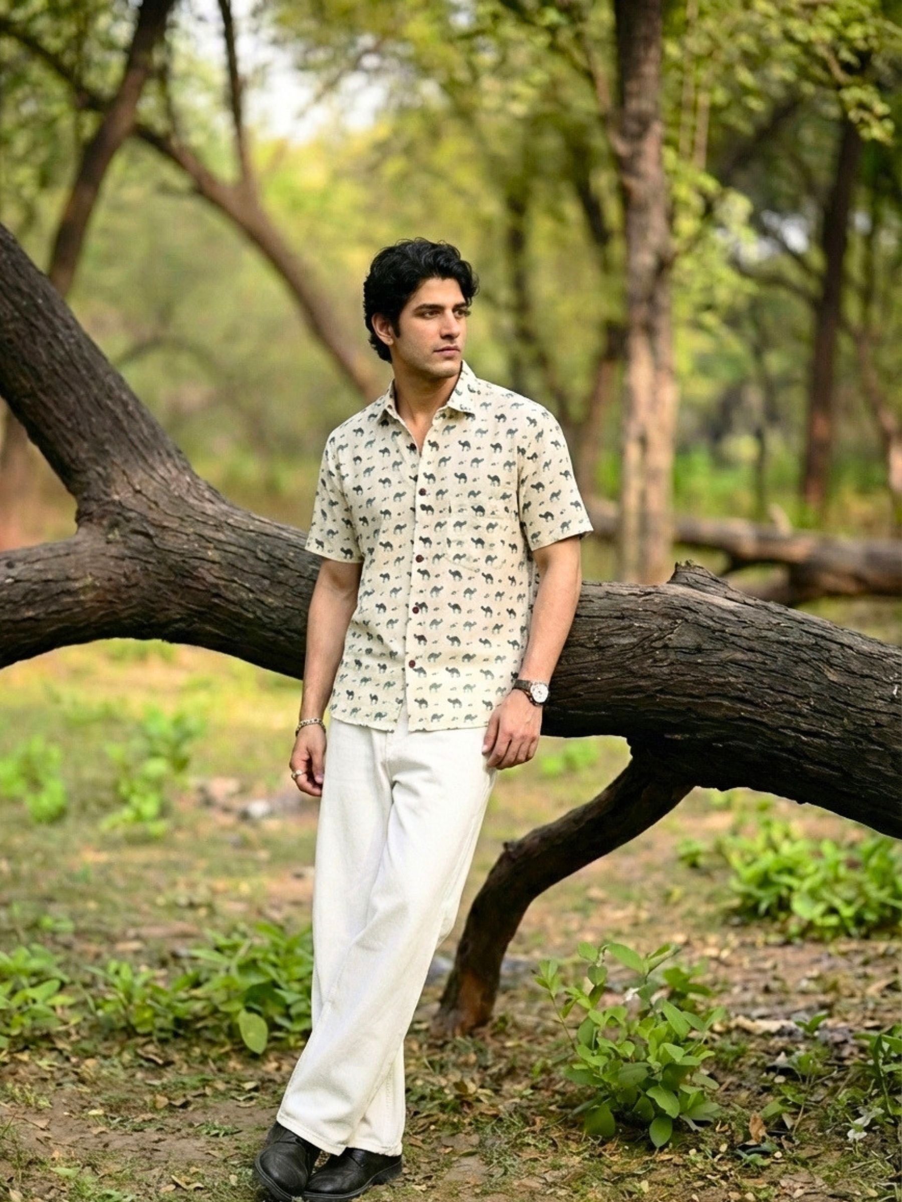 Step into style with our Desert Safari Half Sleeve Shirt! 🌵 Crafted from premium Sanganeri cotton, this shirt is not only lightweight but also breathable, perfect for the warm Indian climate. ☀️ Featuring a unique camel and triangle print, it adds a touch of desert charm to your wardrobe. 🐪