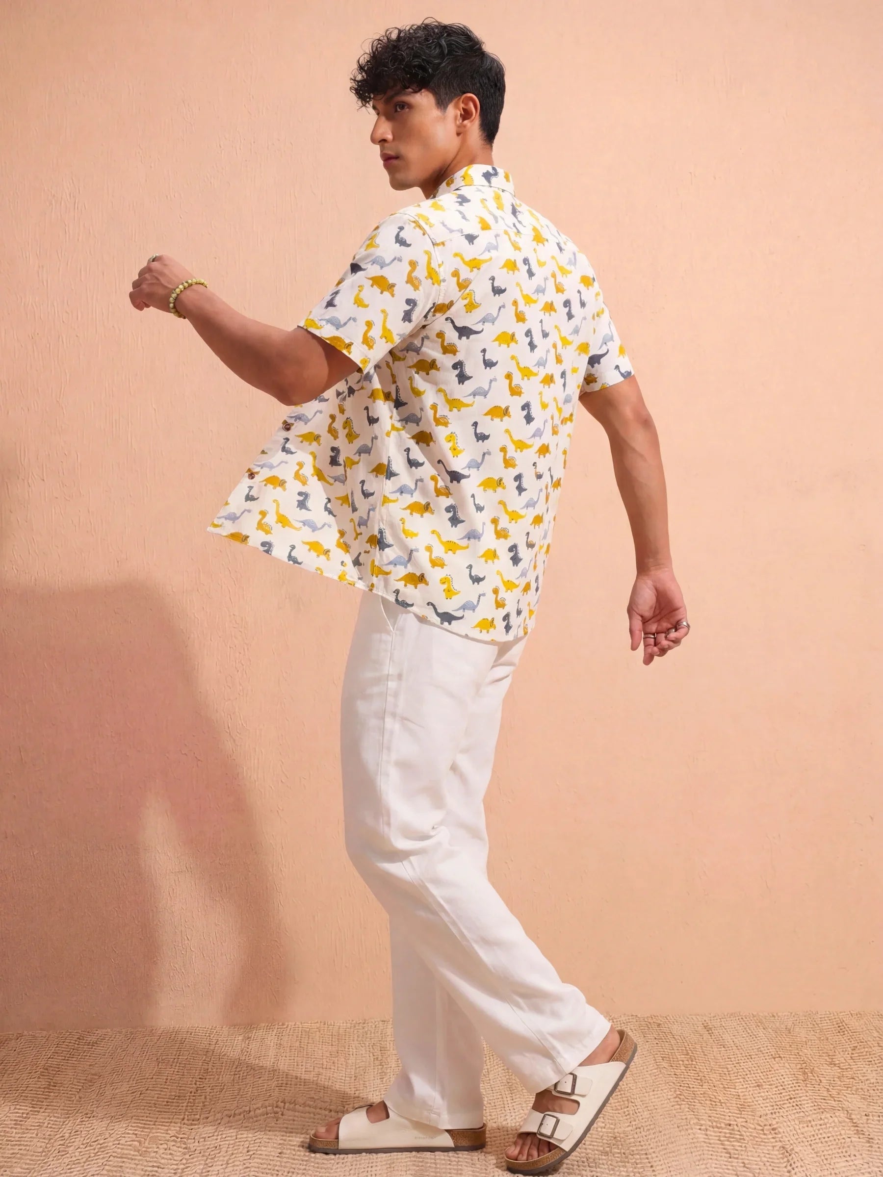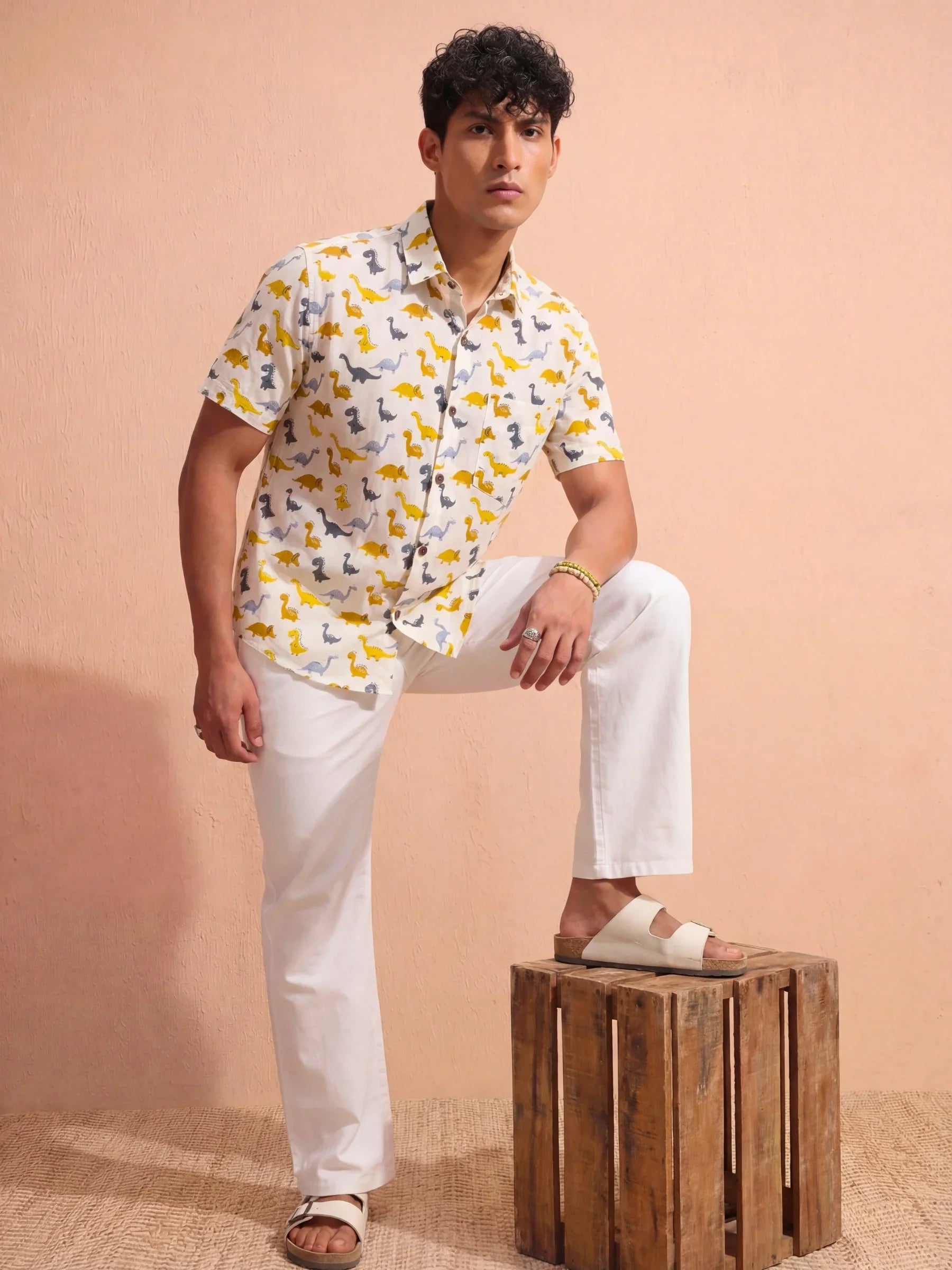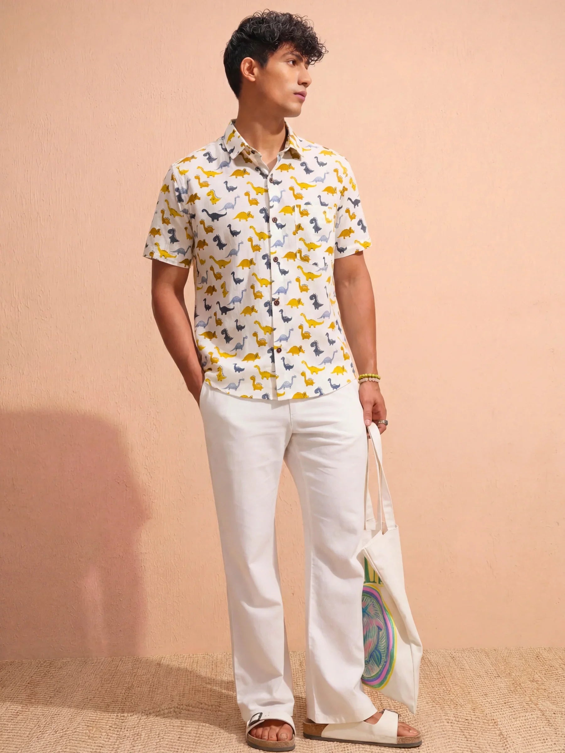 Unleash your playful side with the Dino Parade shirt by Jaipuri Crown. Featuring a cheerful mix of yellow, grey, and brown dinosaur prints on a soft off-white base, this half sleeve shirt is made from 100% Sanganeri cotton. Lightweight and breathable, it’s perfect for vacations, brunches, or simply standing out from the crowd.