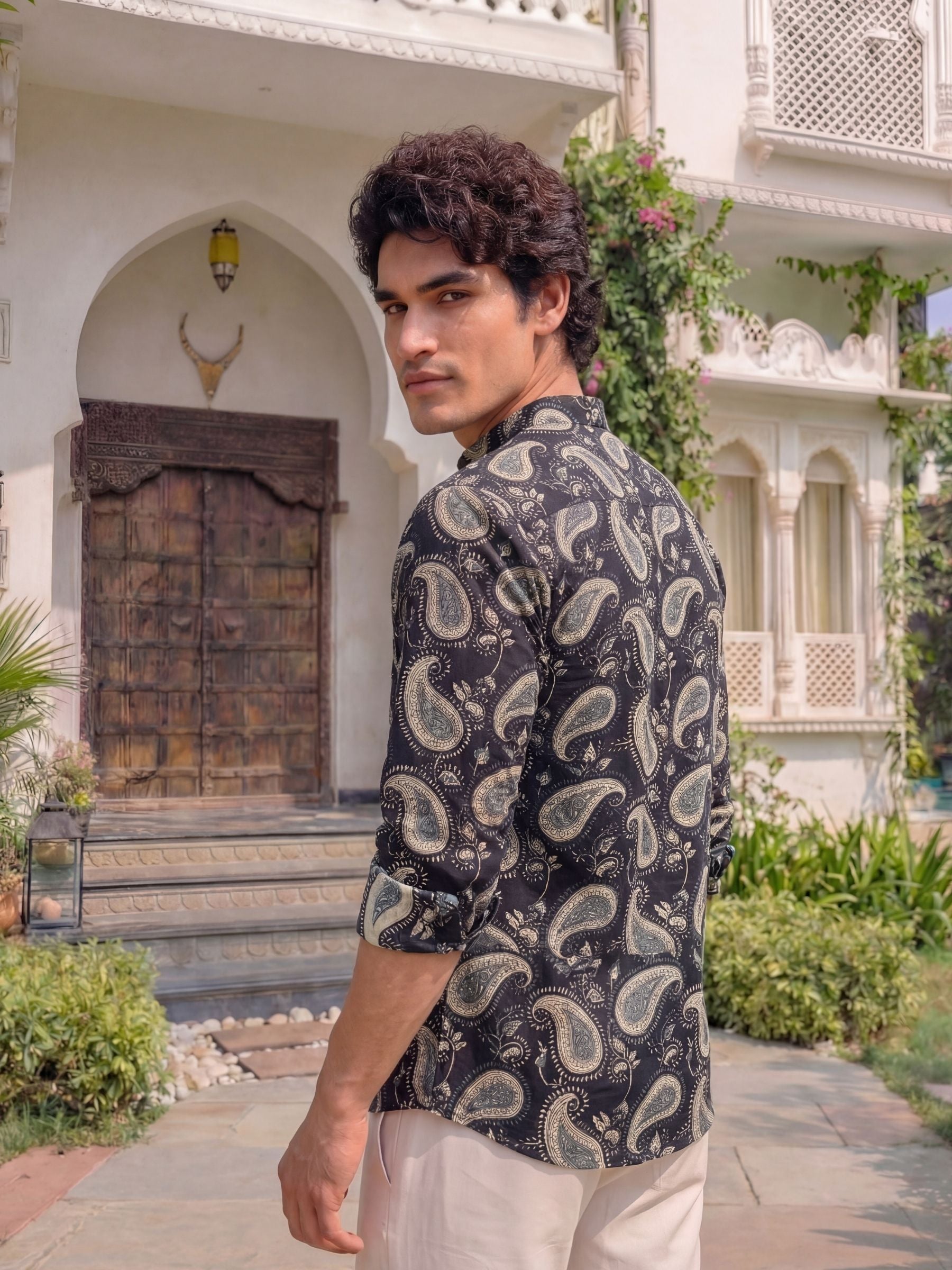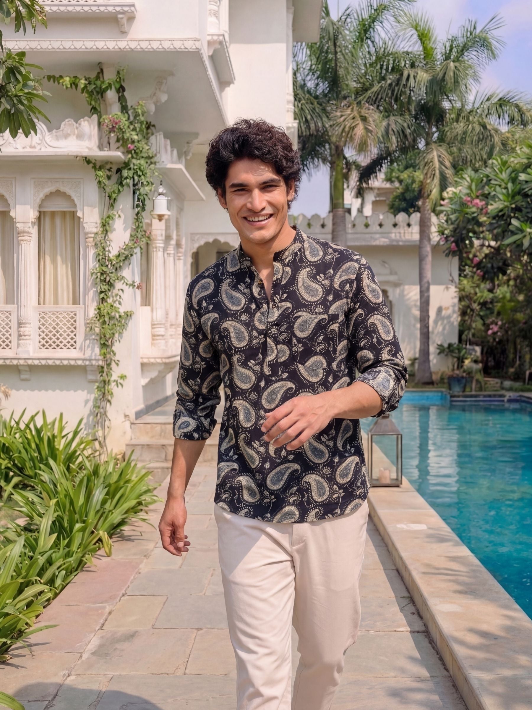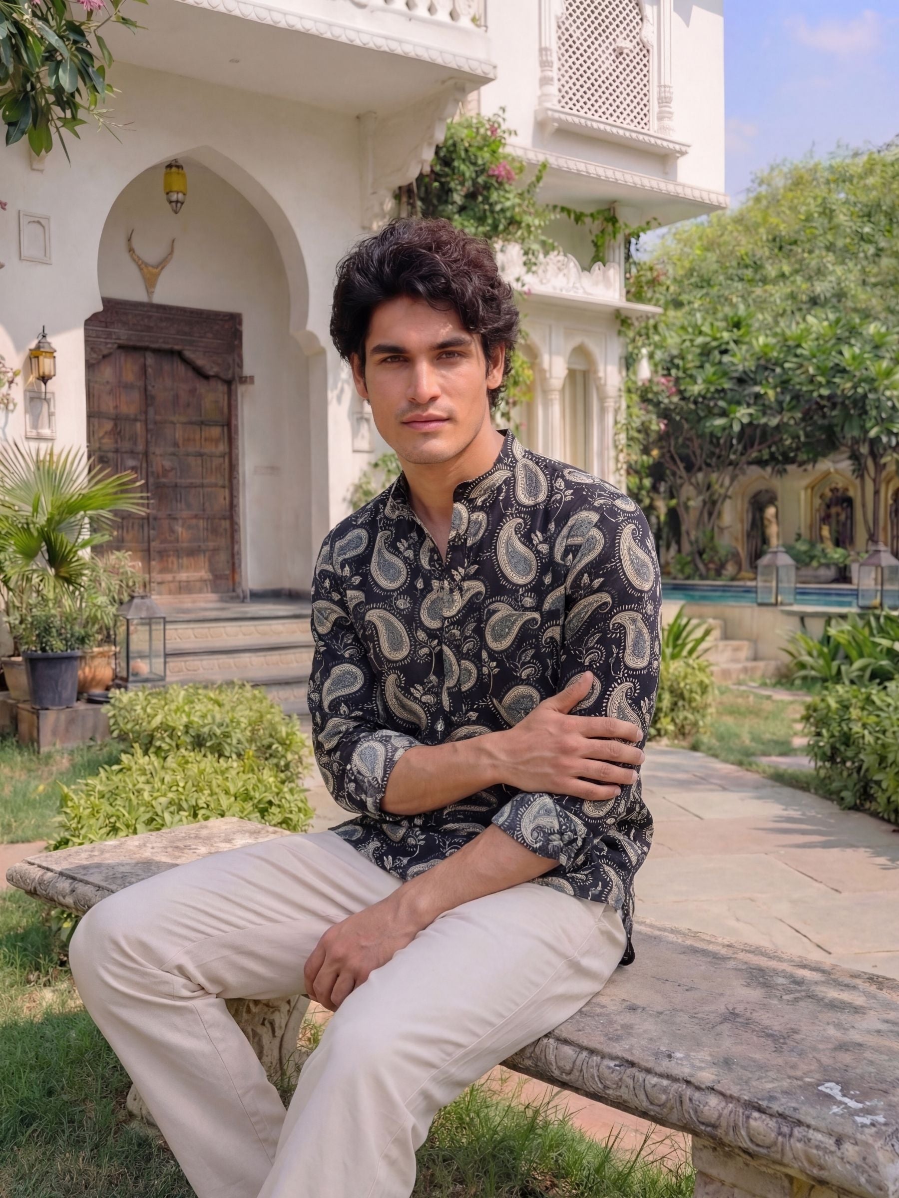 Elevate your style with the Paisley Charm by Jaipuri Crown – a stunning Short Kurta featuring an intricate paisley print in rich navy and cream hues. Made from 100% high-quality cotton, this Kurta ensures comfort and breathability, making it an ideal choice for festive occasions, family gatherings, or casual outings.