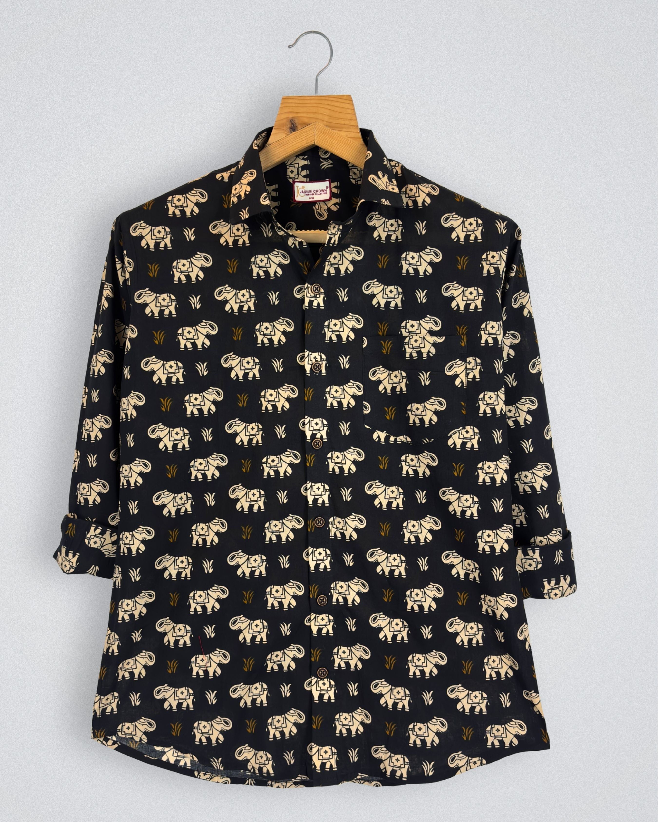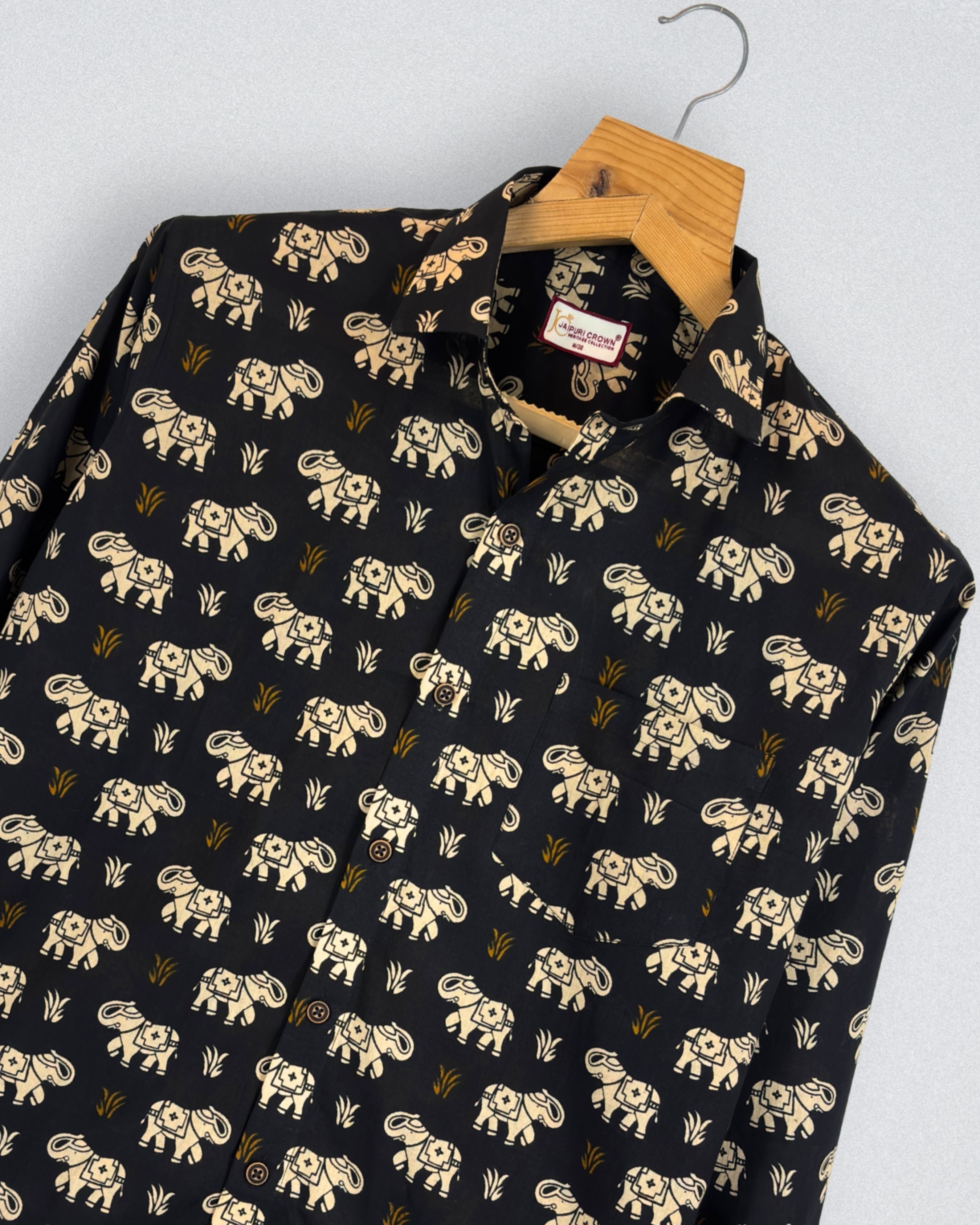 Step into a realm of tradition with the Elephant Charm by Jaipuri Crown – a fashionable Full sleeve cotton shirt featuring intricate elephant motifs in beige against a deep black background. Made from 100% Sanganeri cotton, this shirt combines softness and breathability, making it ideal for casual gatherings, festive occasions, or laid-back weekends.