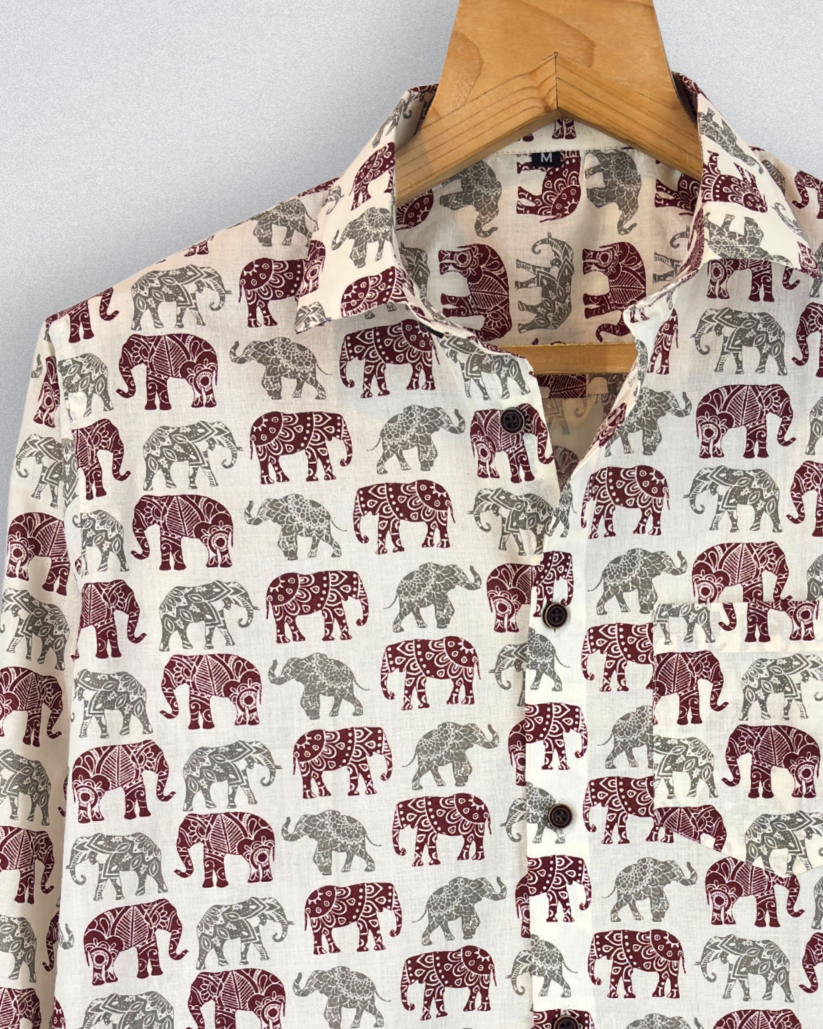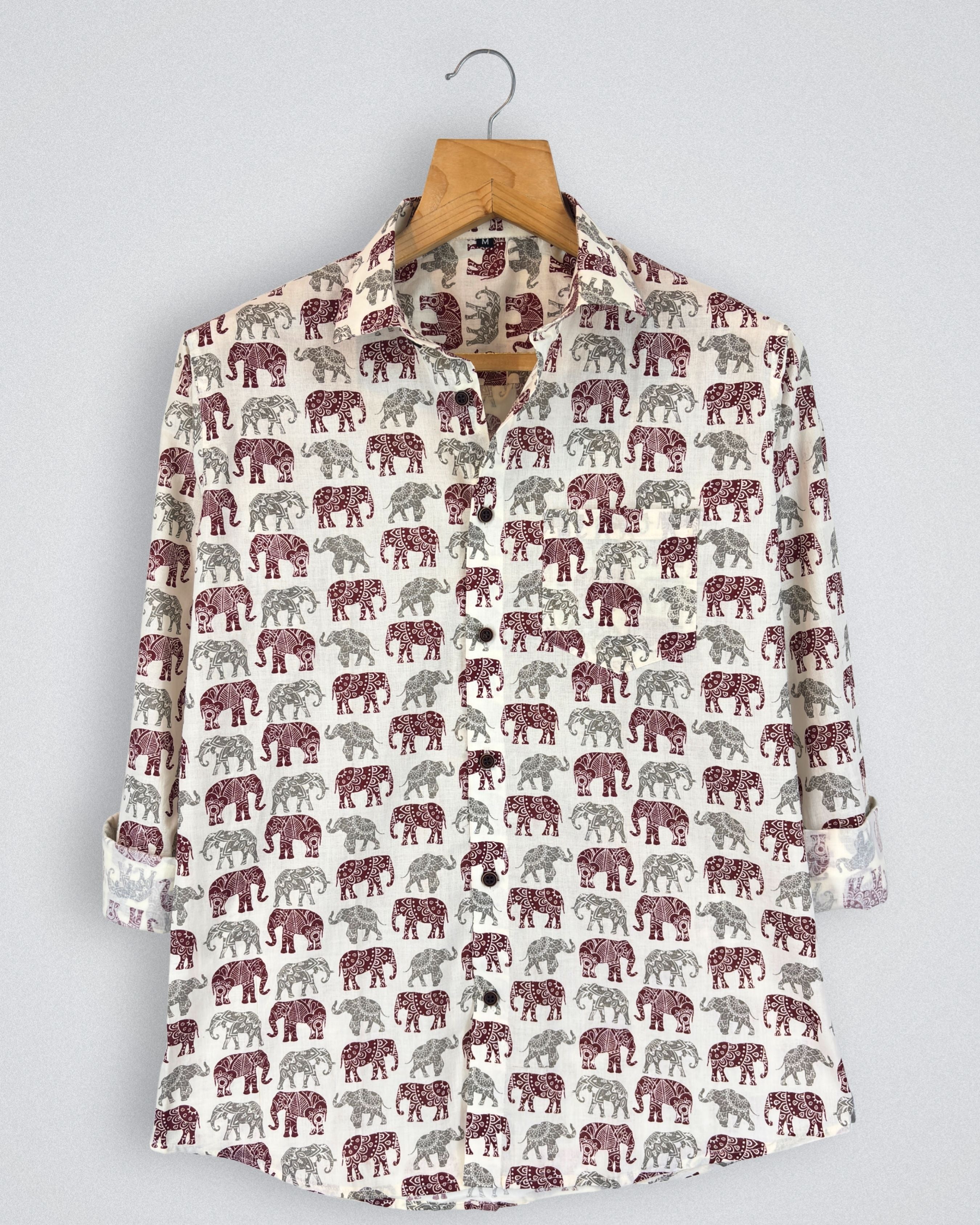 Step into a world of elegance with Elephant Charm by Jaipuri Crown – a stylish Full sleeve cotton shirt featuring a unique elephant print in rich maroon and subtle grey on a cream backdrop. Made from 100% Sanganeri cotton, this shirt ensures a soft and breathable fit, making it ideal for casual outings, festive gatherings, or laid-back weekends.