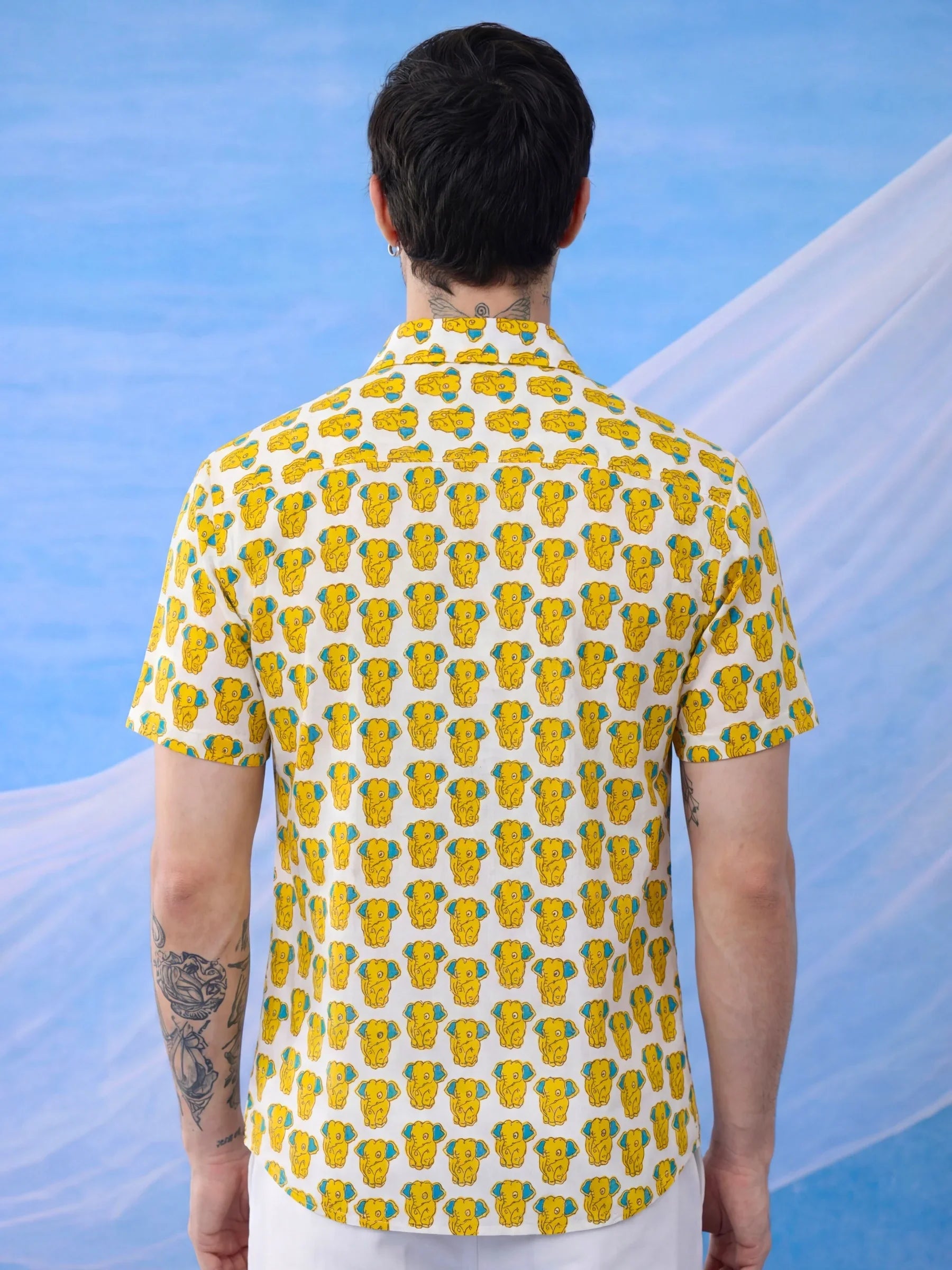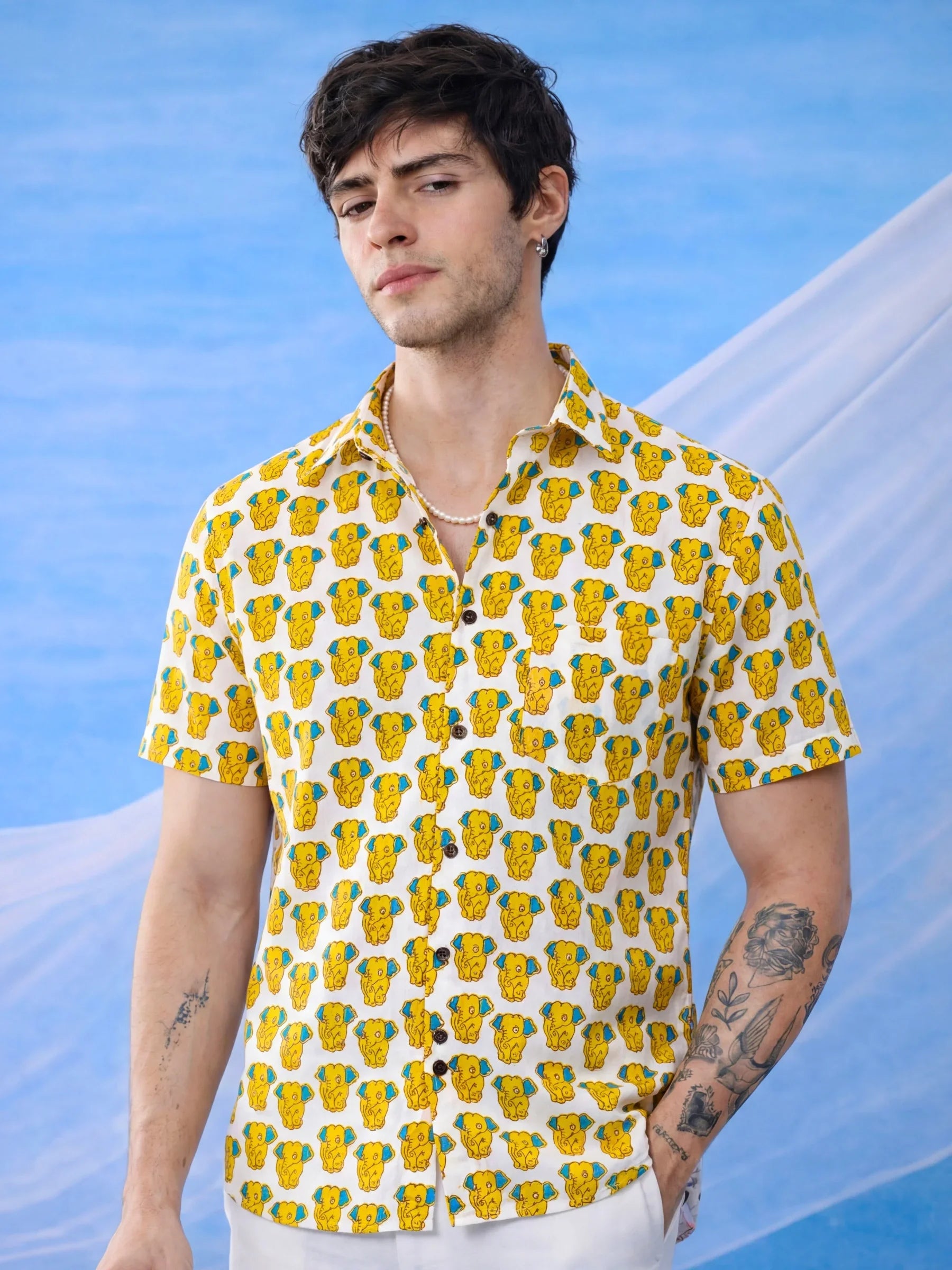 Bring a playful vibe to your wardrobe with Elephant Charm by Jaipuri Crown – a delightful half sleeve cotton shirt featuring a charming elephant print in vibrant yellow and blue on a light cream background. Made from 100% Sanganeri cotton, this shirt ensures a soft, breathable feel, making it an ideal choice for casual outings, beach trips, or relaxed weekend gatherings.