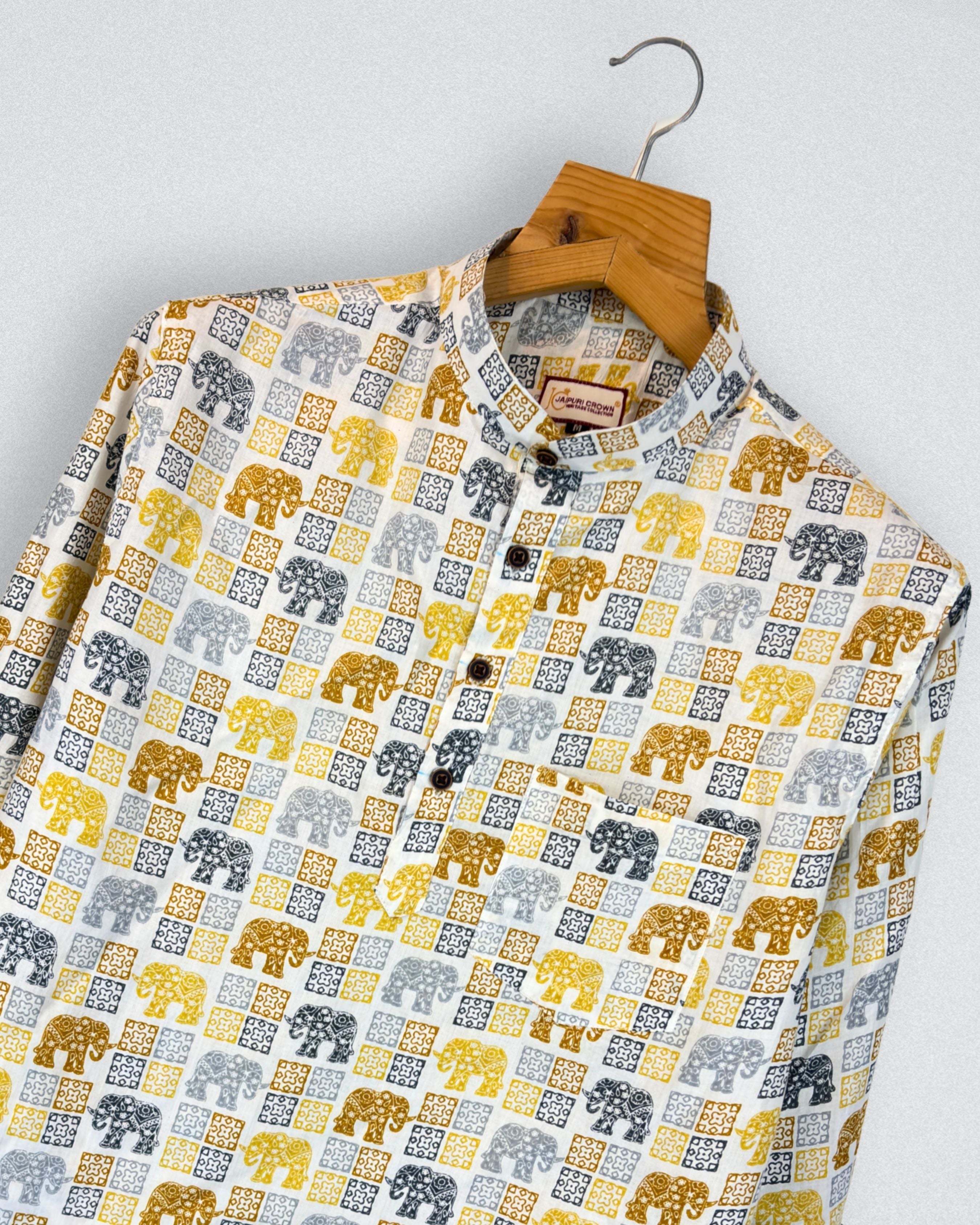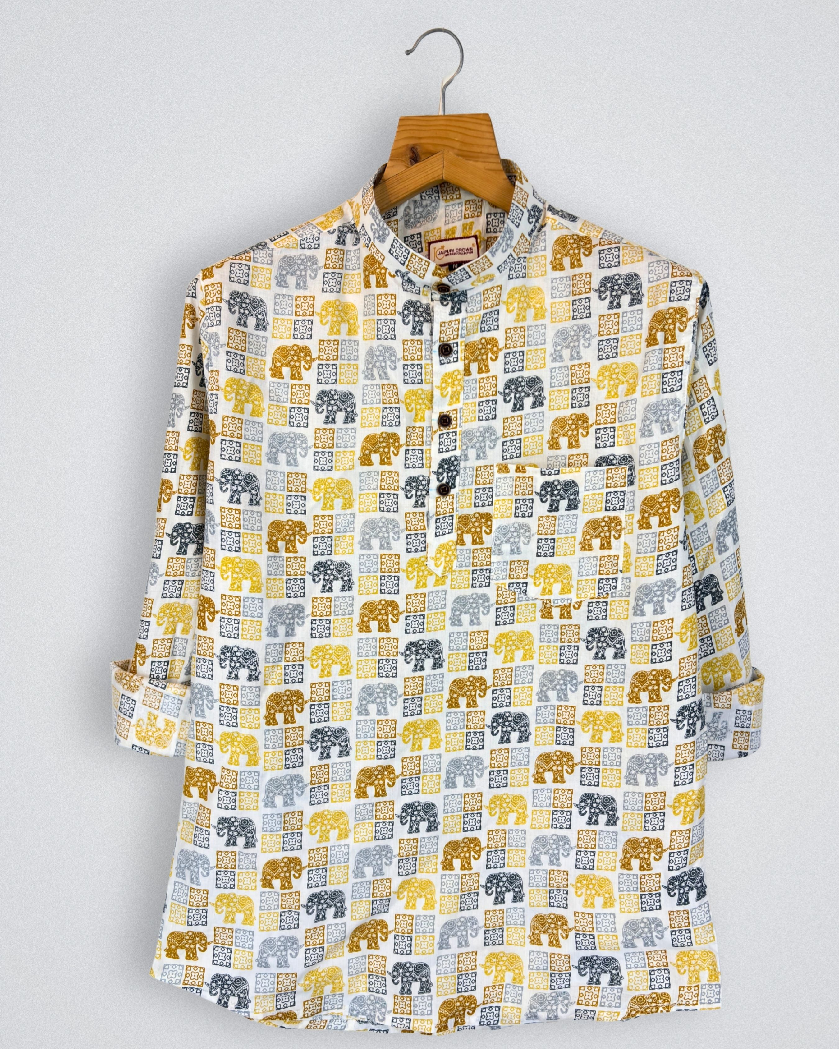 Step into style with Elephant Charm by Jaipuri Crown – a charming Short Kurta featuring an eye-catching elephant print in vibrant yellow and grey against a white backdrop. Made from 100% Sanganeri cotton, this kurta promises comfort and breathability, making it an ideal choice for casual outings, festive celebrations, or relaxed weekends.