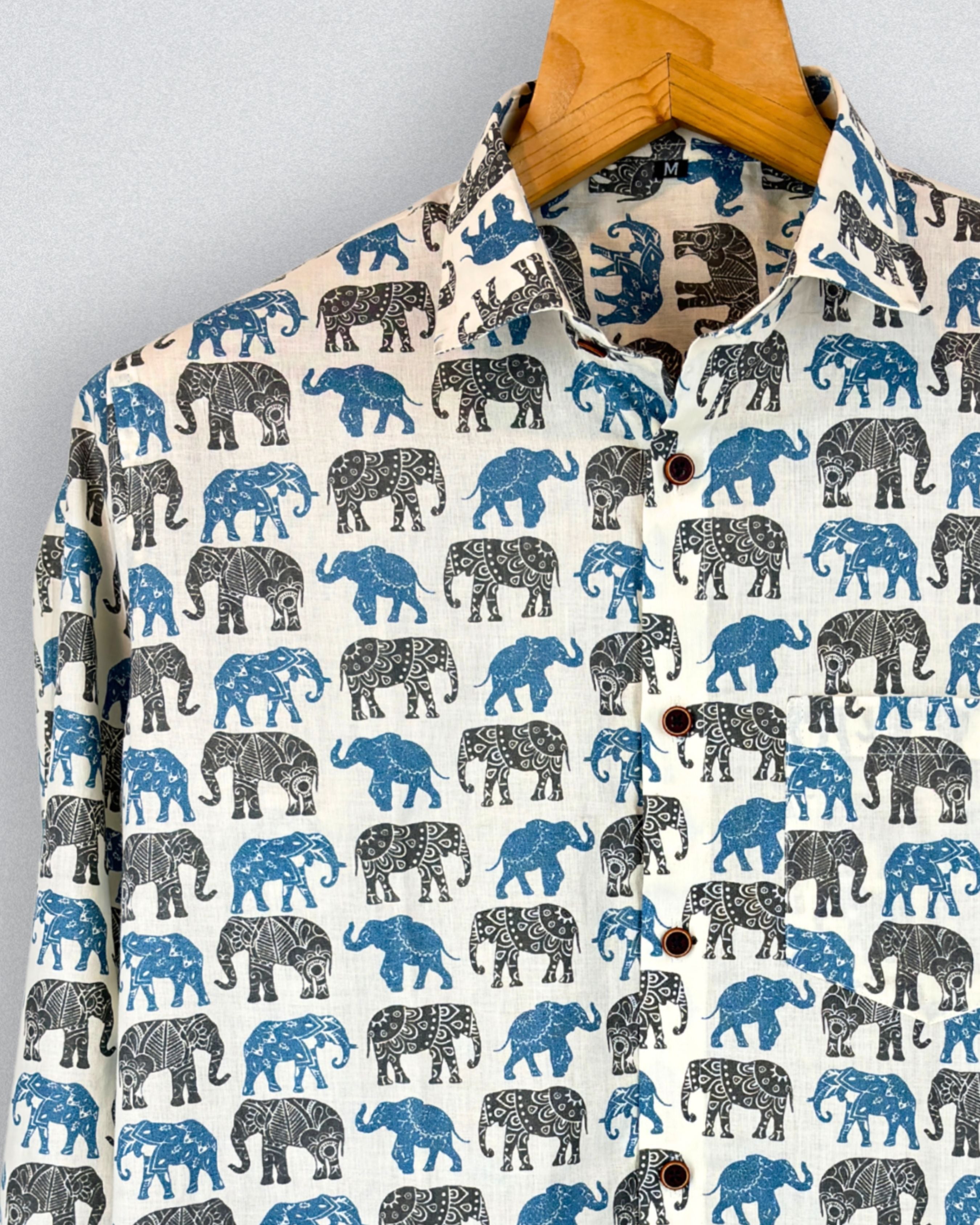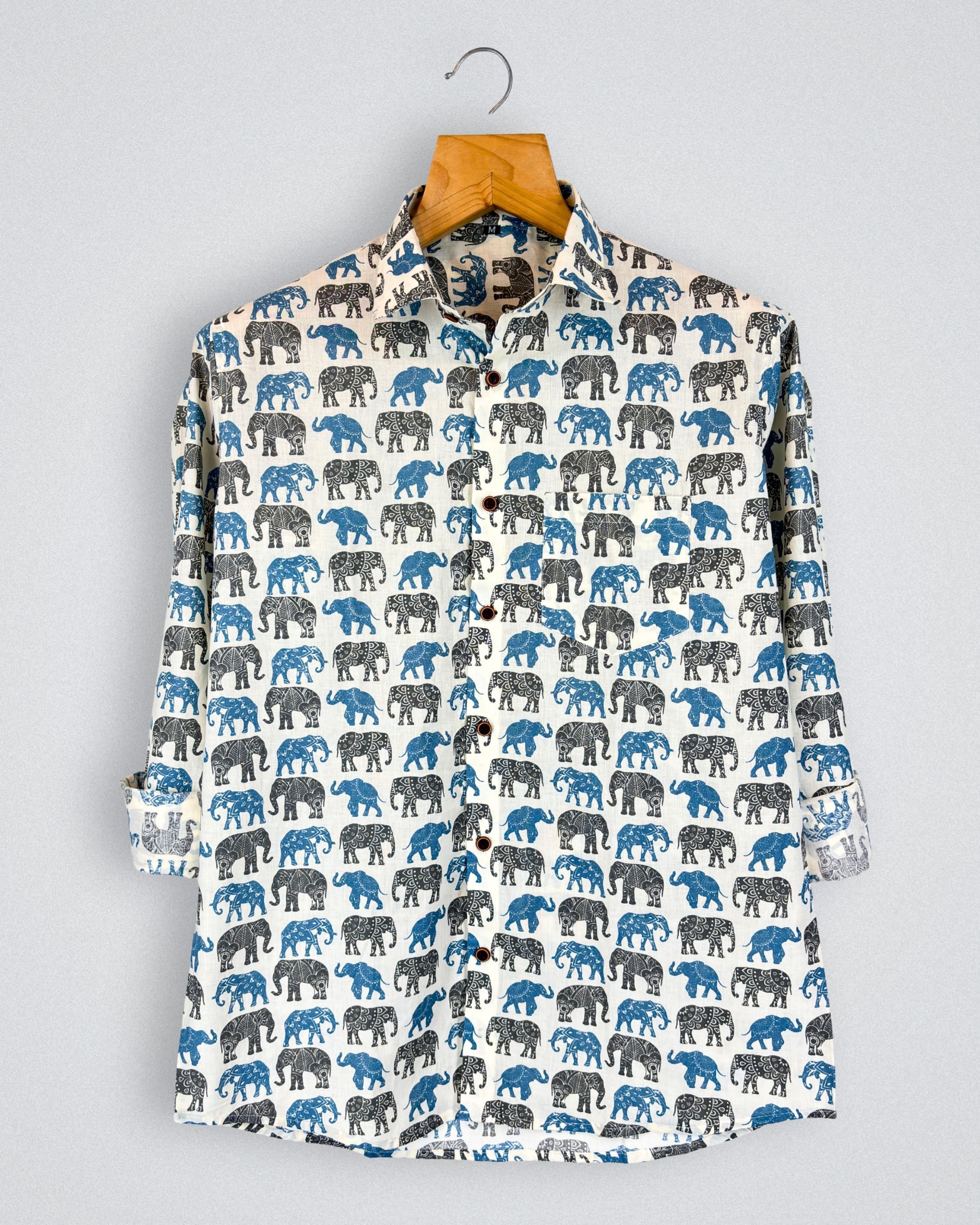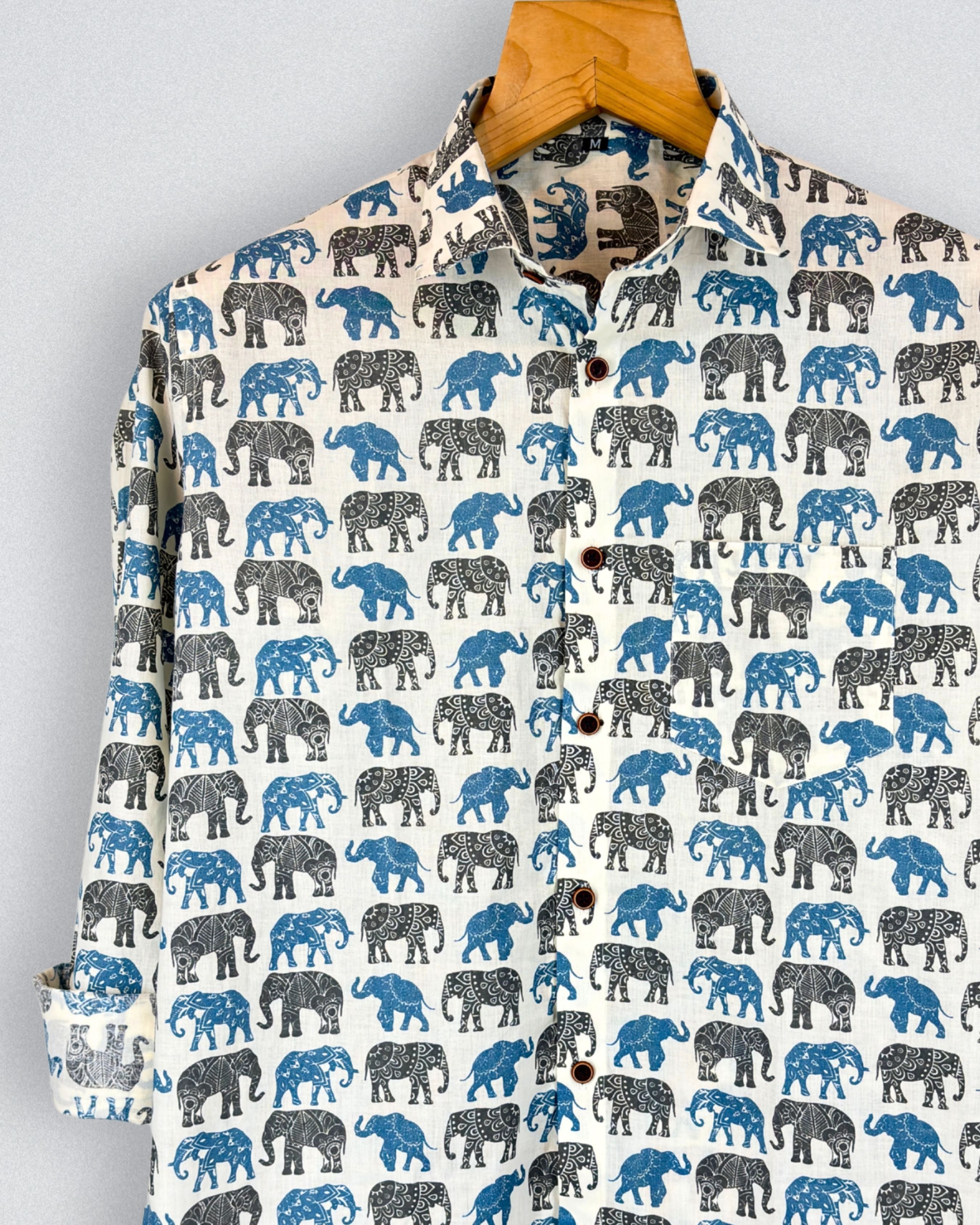 Step into the wild with the Elephant Dance by Jaipuri Crown – a stunning Full sleeve cotton shirt featuring an intricate elephant print in shades of blue and black on a cream background. Made from 100% Sanganeri cotton, this shirt ensures a soft touch and breathability, making it ideal for casual gatherings, outdoor trips, or laid-back weekends.