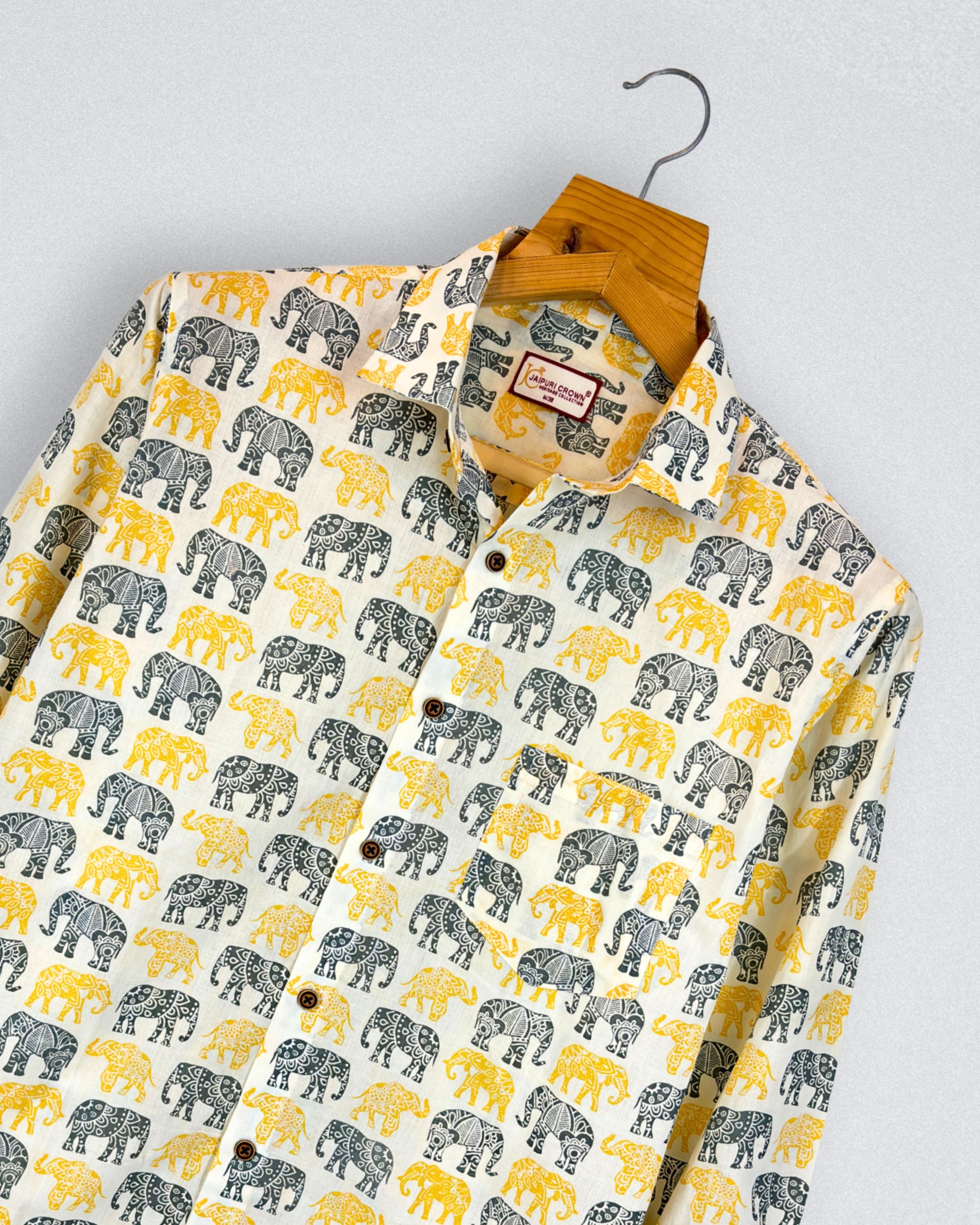 Step into the wild with Elephant Expedition by Jaipuri Crown – a stylish Full sleeve cotton shirt featuring a playful elephant print in vibrant yellow and classic black on a soft cream backdrop. Made from 100% Sanganeri cotton, this shirt ensures a comfortable and breathable fit, perfect for casual outings, beach days, or relaxed gatherings with friends.