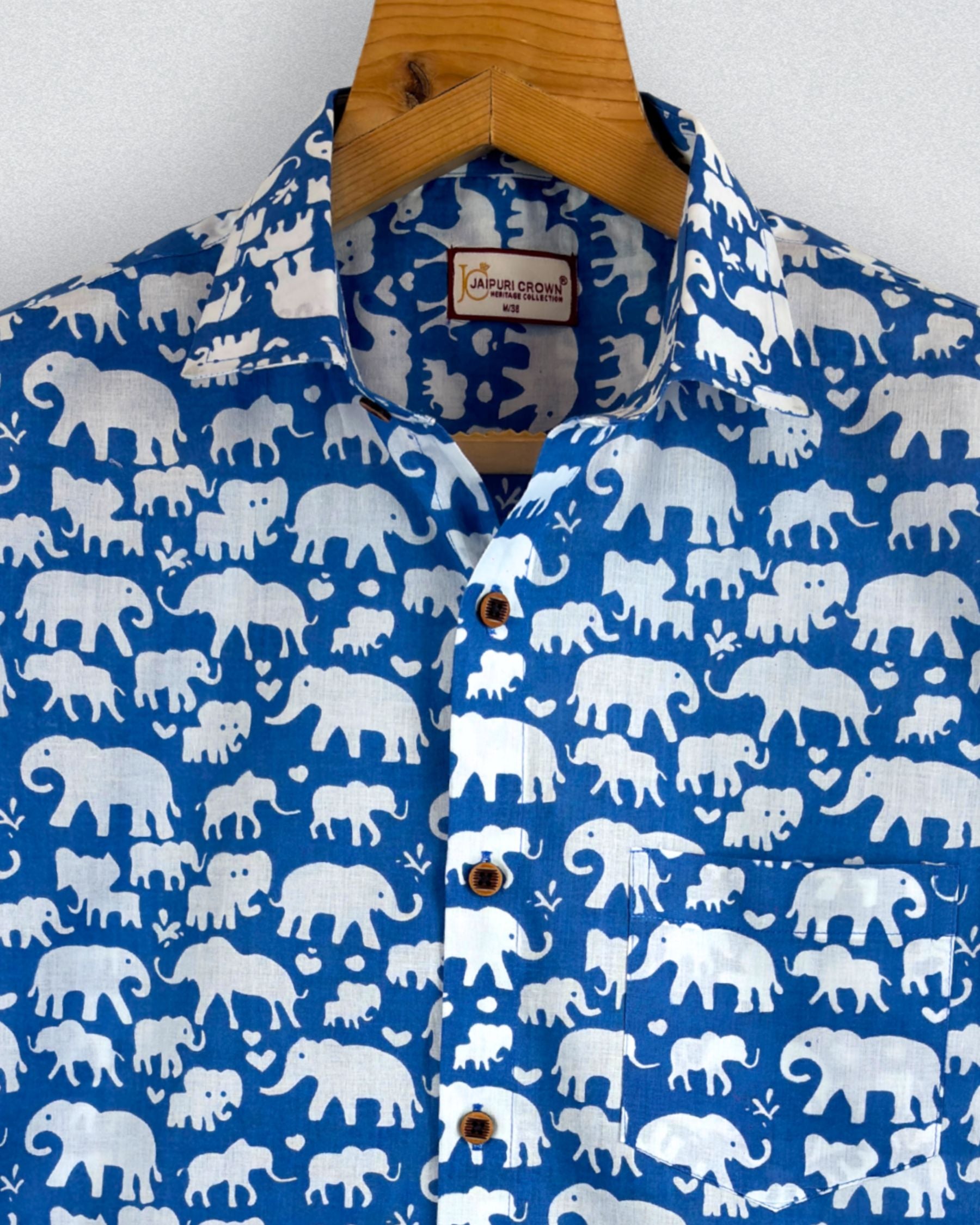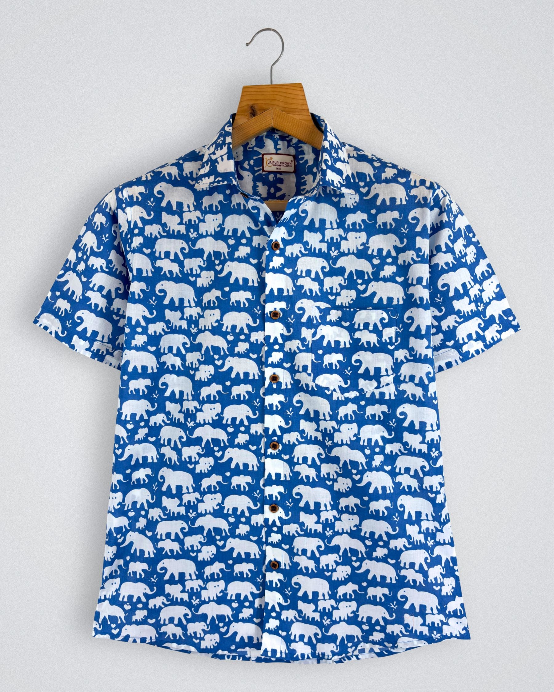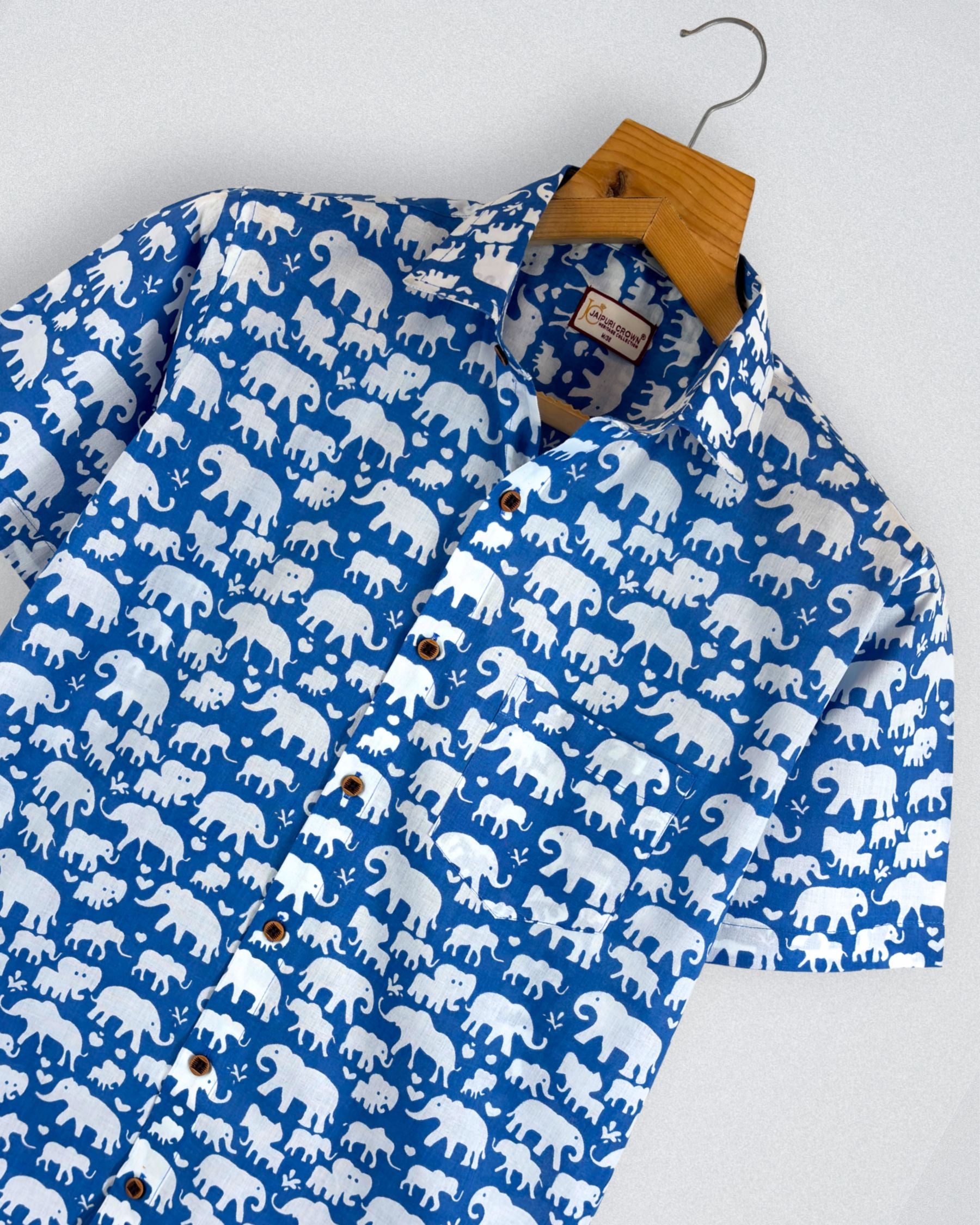 Step into a world of charm with the Elephant Expedition by Jaipuri Crown – a delightful half sleeve cotton shirt featuring playful elephant prints in white against a vibrant blue backdrop. Made from 100% Sanganeri cotton, this shirt promises an incredibly soft and breathable feel, making it an ideal choice for casual gatherings, beach outings, or relaxed days at home.