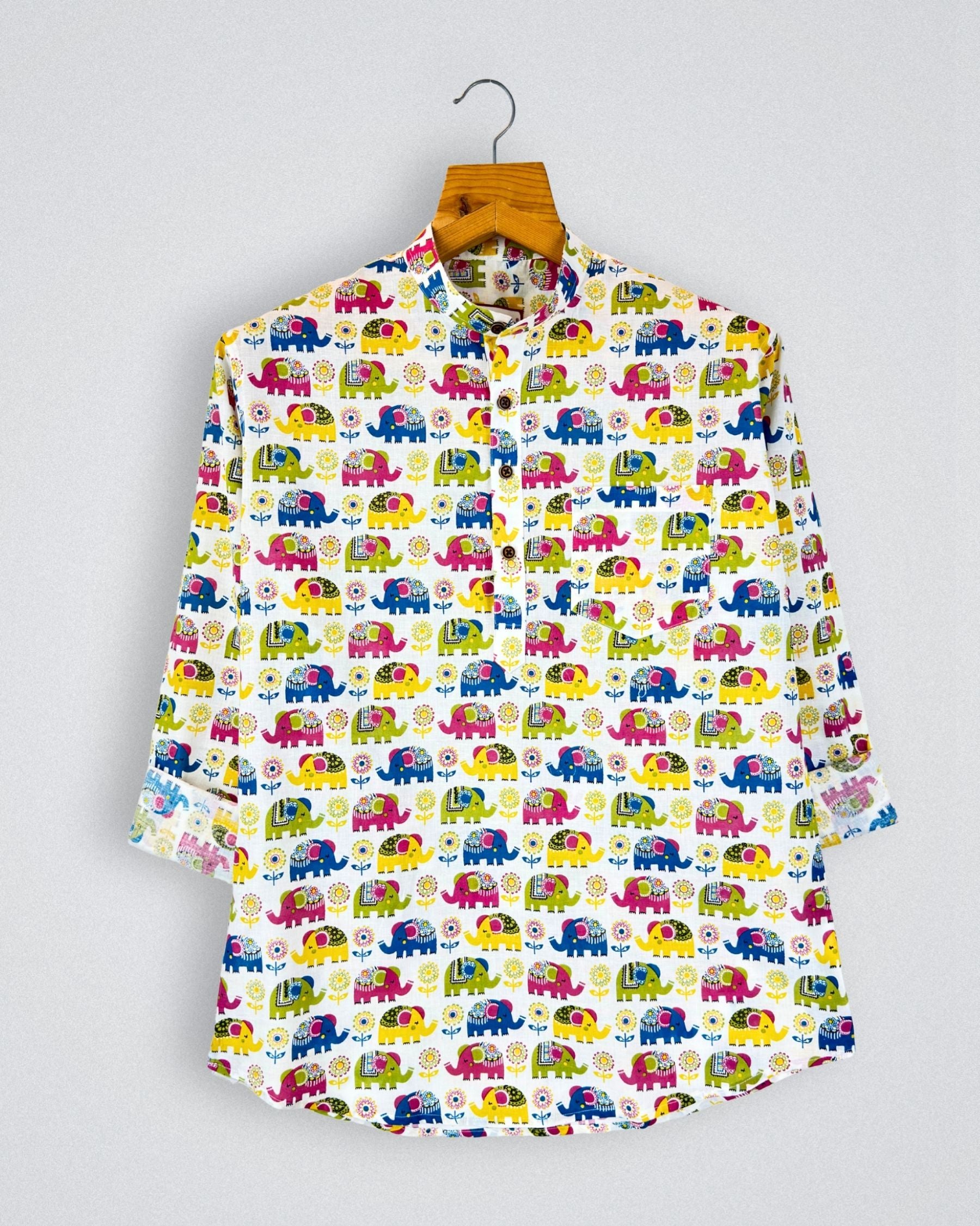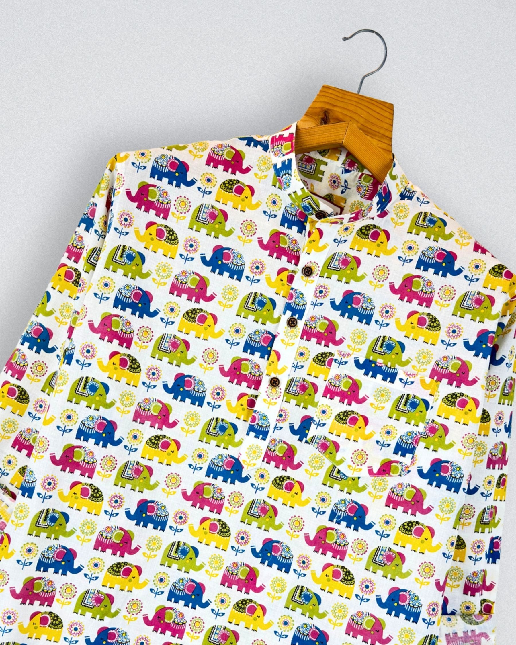 Step into a world of color with our Elephant Fest by Jaipuri Crown – a charming Short Kurta featuring an eye-catching elephant motif in vibrant hues of pink, green, and blue against a soft cream backdrop. Made from 100% Sanganeri cotton, this Kurta is designed for comfort and breathability, making it an ideal choice for casual outings, festive gatherings, or laid-back weekends.