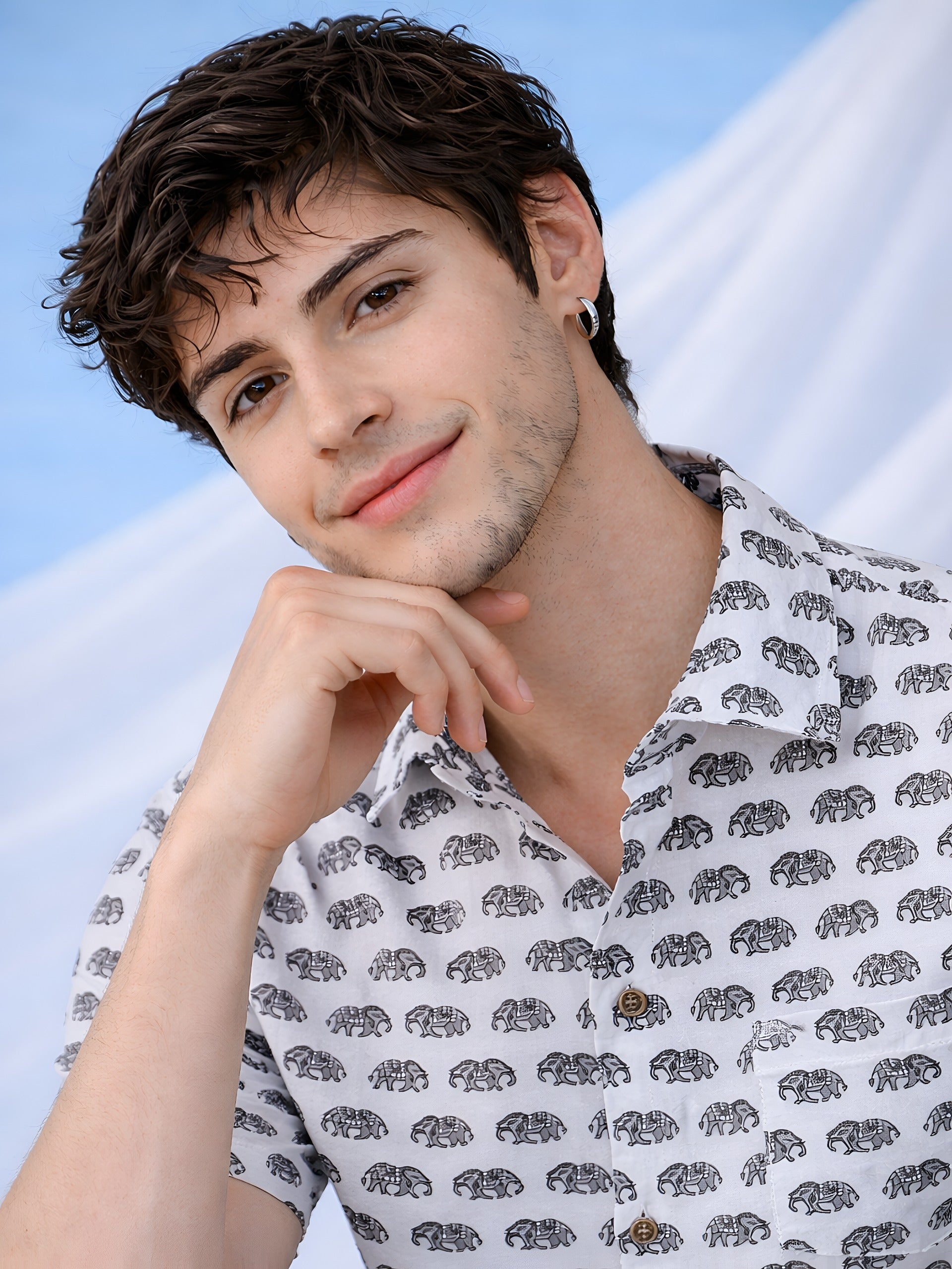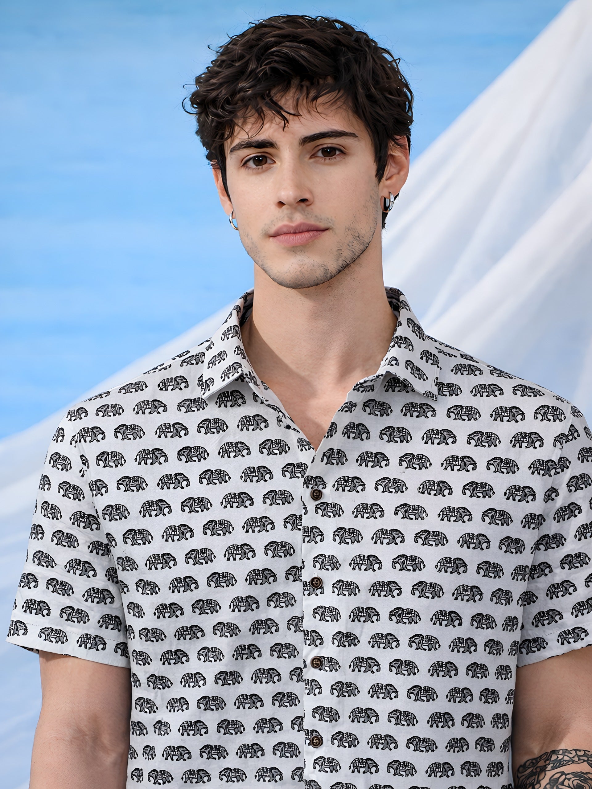 Add a touch of elegance to your wardrobe with the Elephant Harmony by Jaipuri Crown – a charming half sleeve cotton shirt featuring a delightful elephant and castle print in grey on a pristine white backdrop. Made from 100% Sanganeri cotton, this shirt provides a soft and breathable feel, making it ideal for casual outings, family gatherings, or weekend getaways.