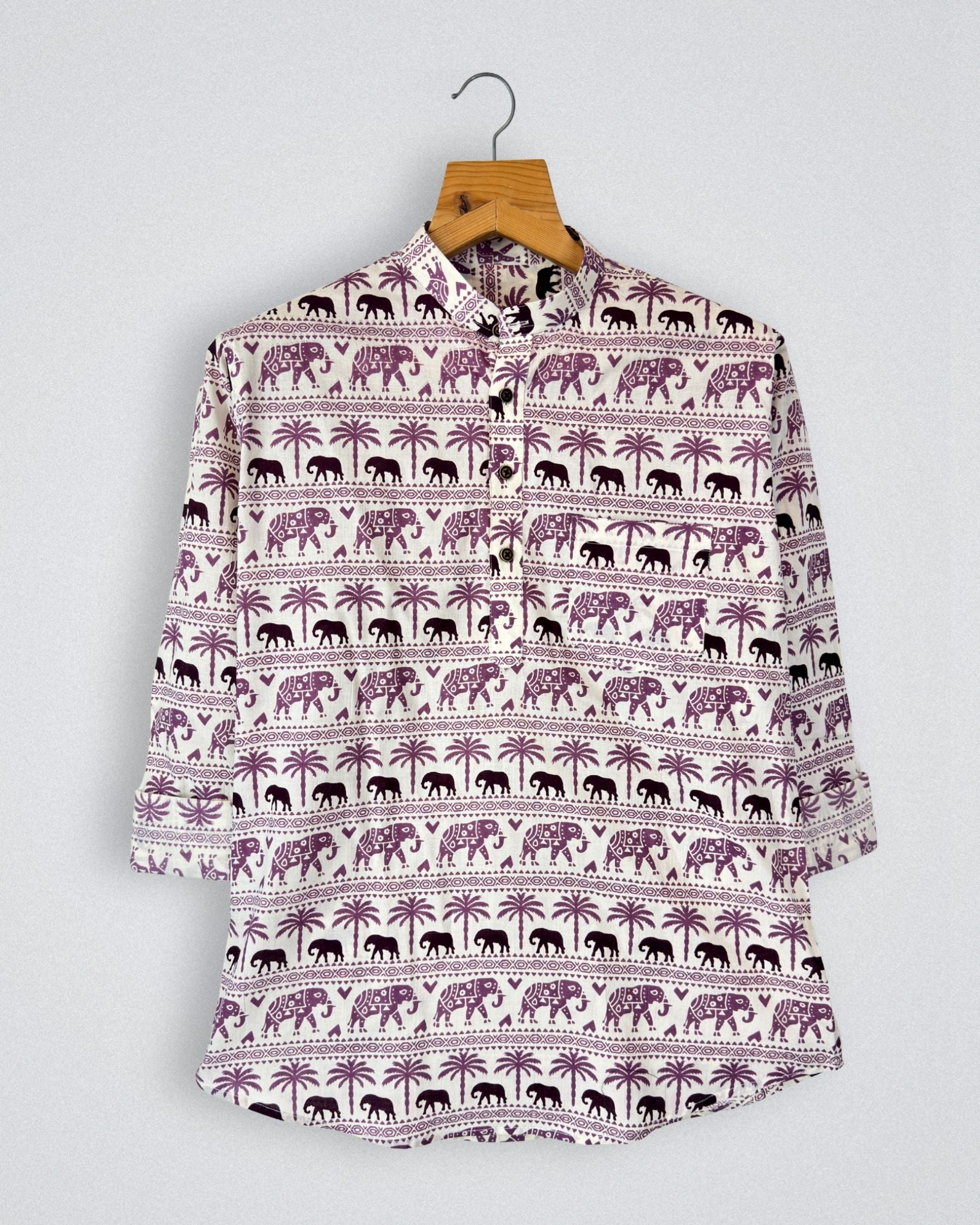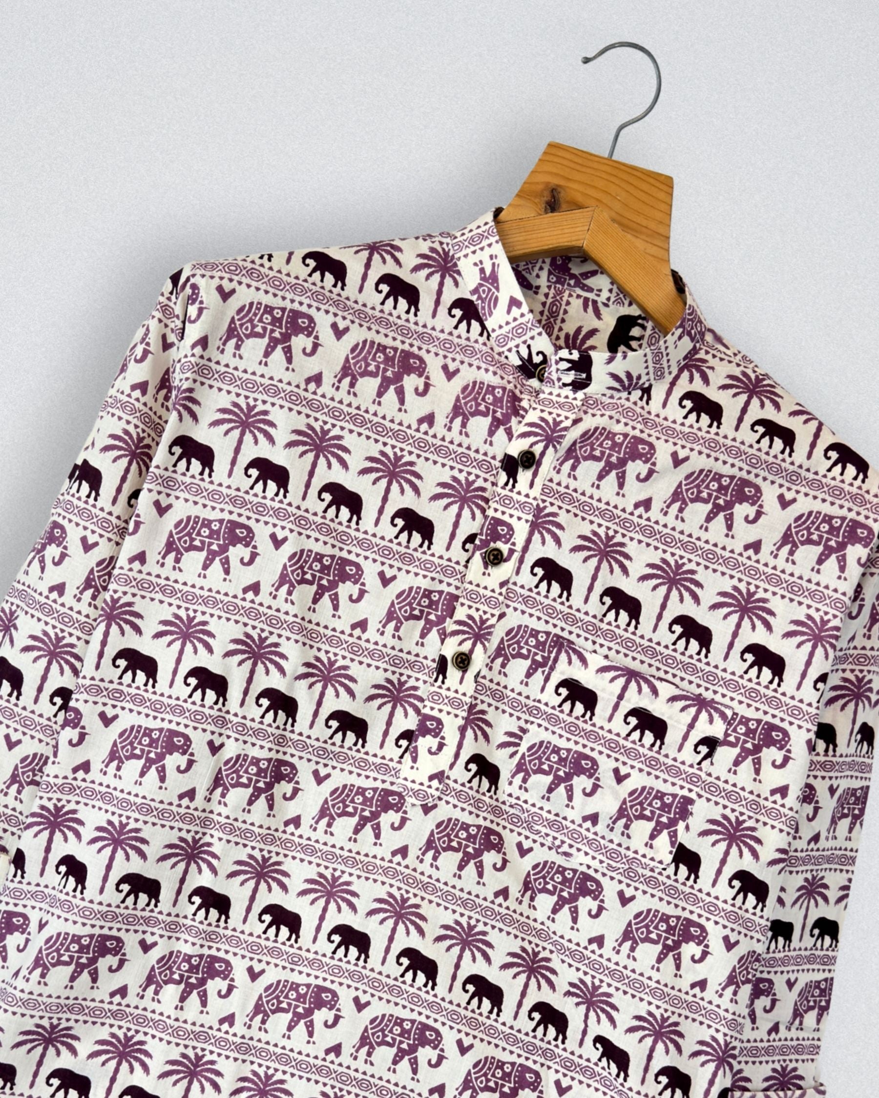 Step into a world of adventure with the Elephant Journey by Jaipuri Crown – a charming Short Kurta featuring an eye-catching elephant and palm print in rich maroon against a cream base. Made from 100% Sanganeri cotton, this Kurta ensures a soft and breathable fit, perfect for casual gatherings, festive occasions, or relaxing at home.