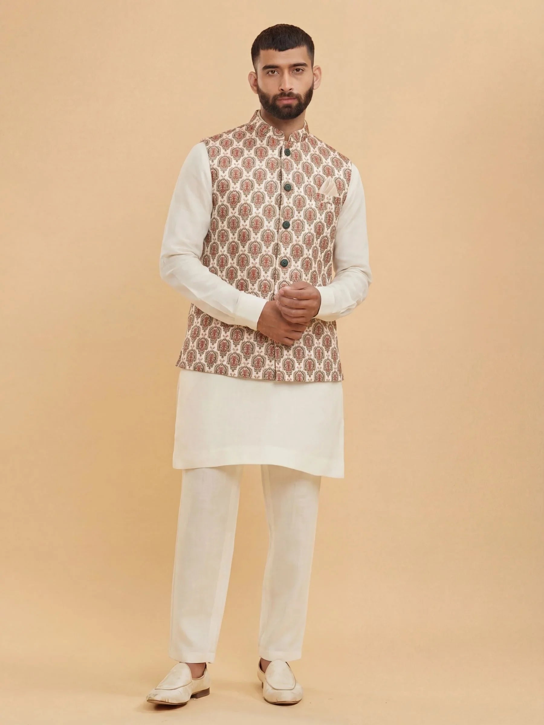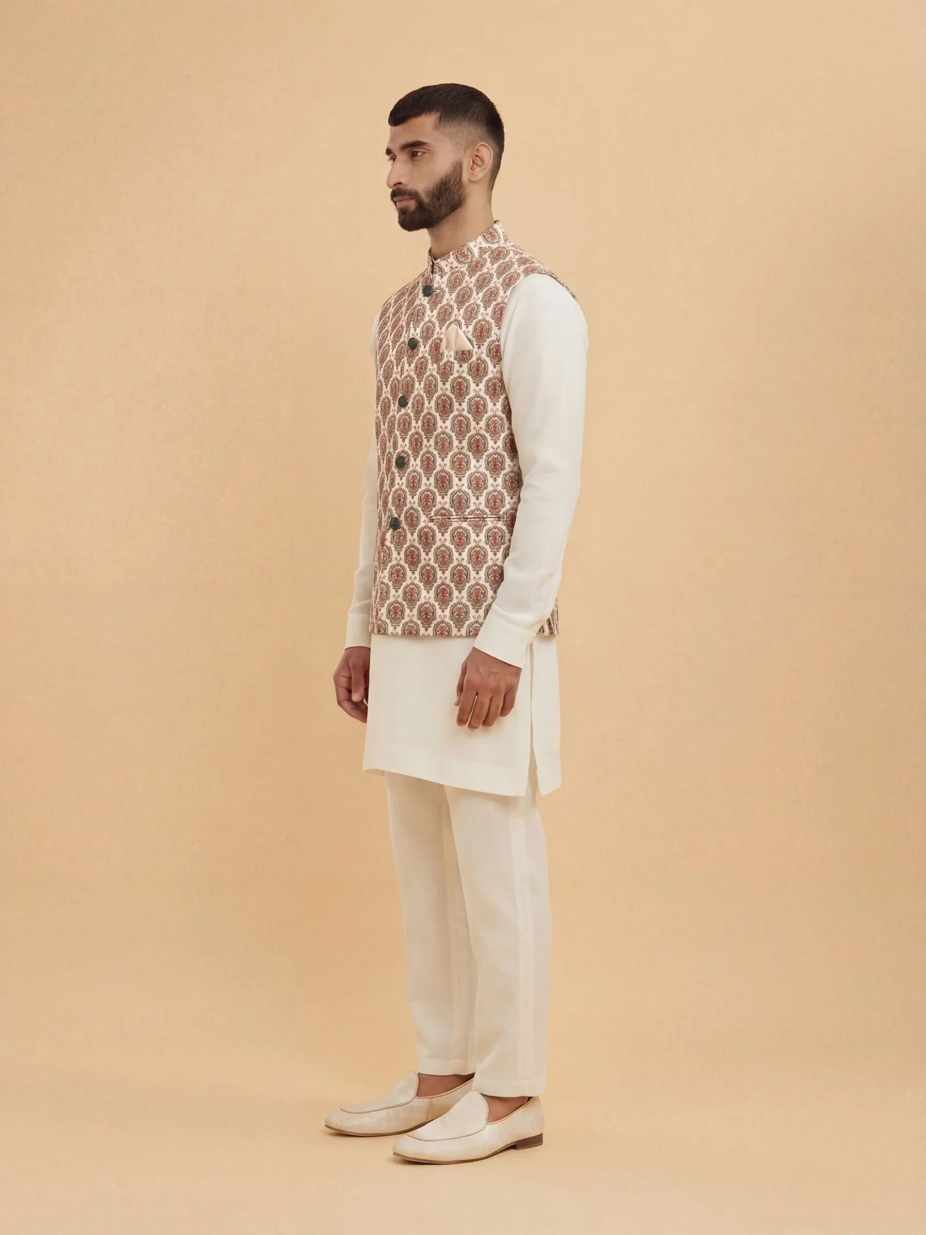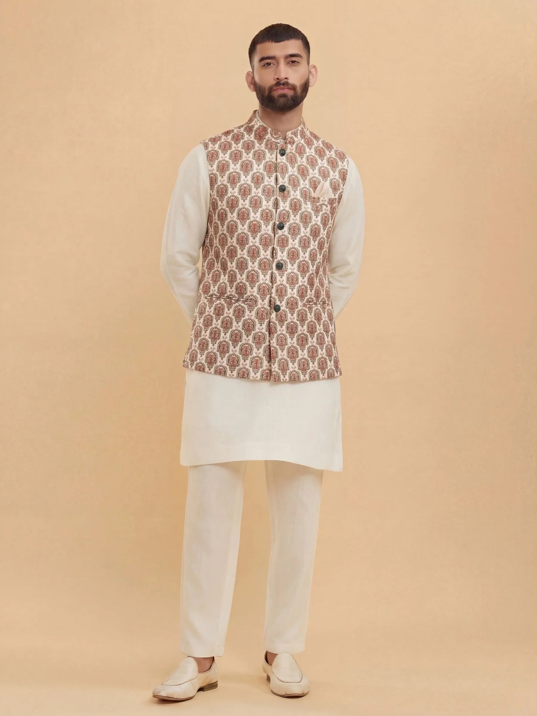 Our Nehru Jacket boasts a traditional print that captures the essence of rich heritage and cultural vibrancy. 🌟 This timeless design infuses your attire with elegance, perfect for celebrating cultural occasions with flair.