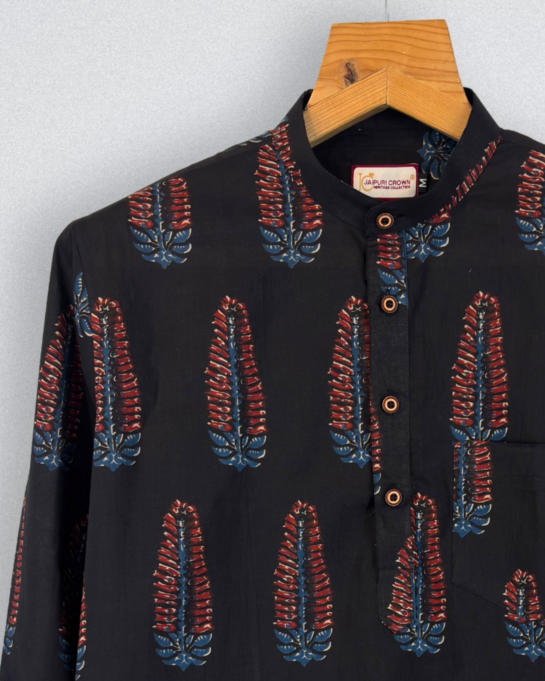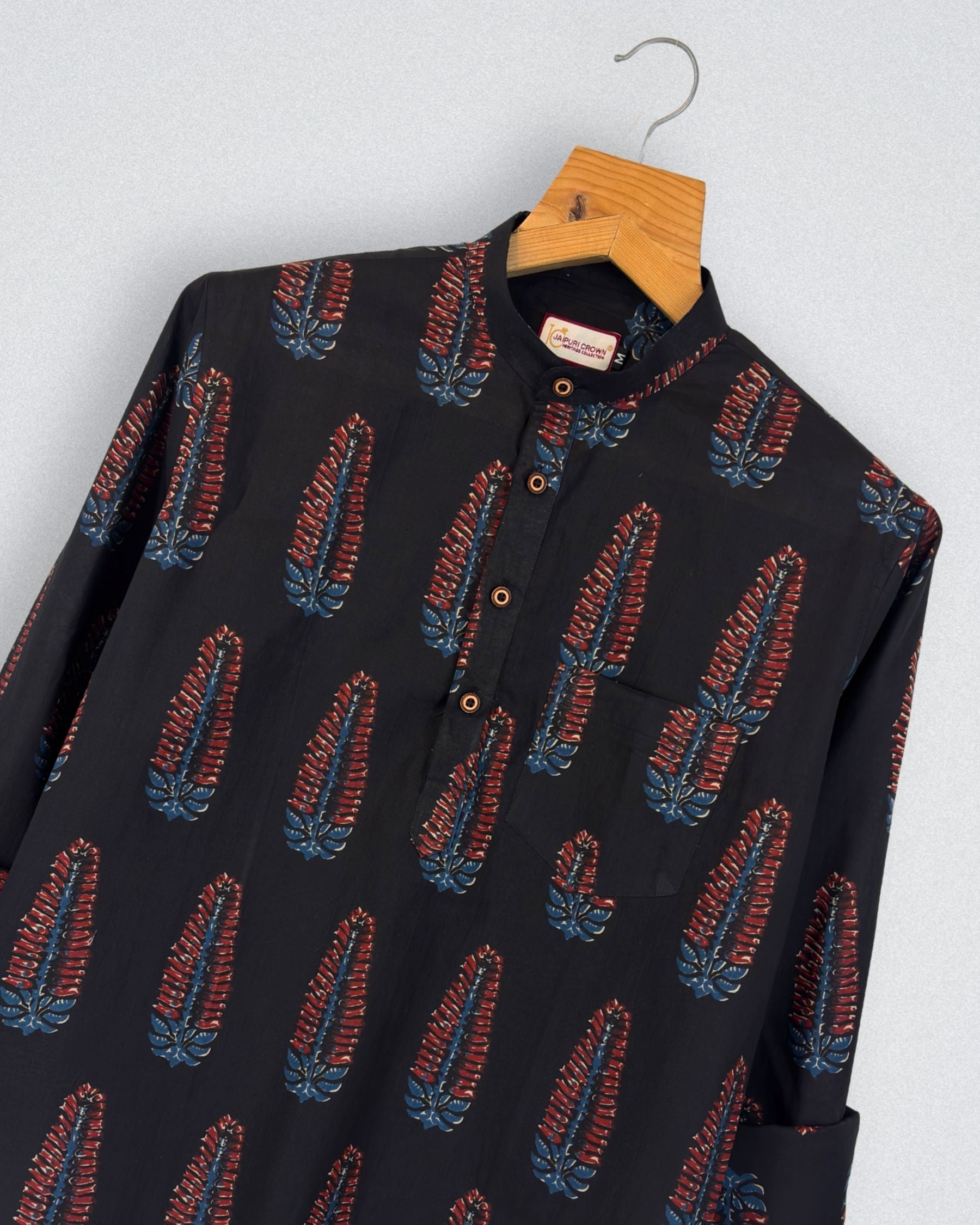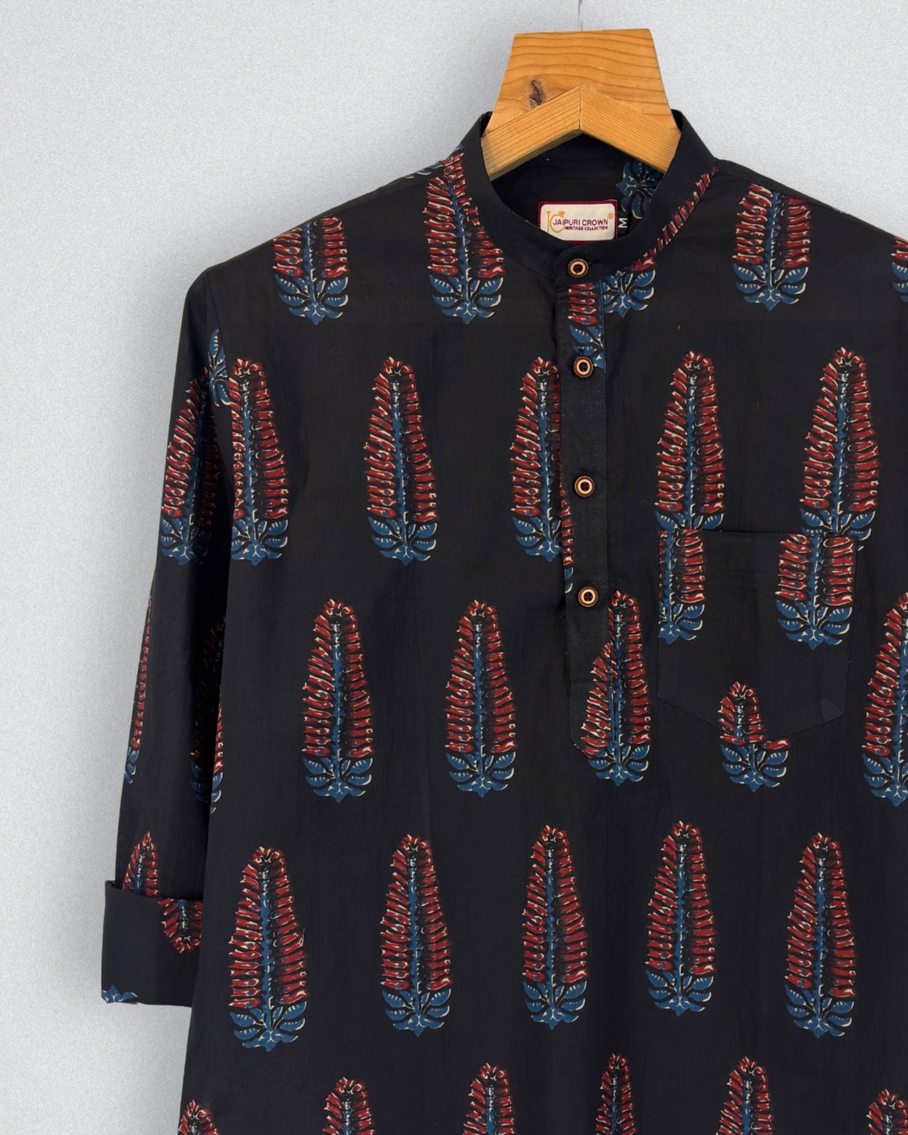 Step into style with Feathered Elegance by Jaipuri Crown – a striking Short Kurta featuring a unique feather motif in vibrant colors against a rich black backdrop. Made from 100% Sanganeri cotton, this Kurta provides exceptional comfort and breathability, making it the ideal choice for festive occasions, casual gatherings, or easygoing weekends.
