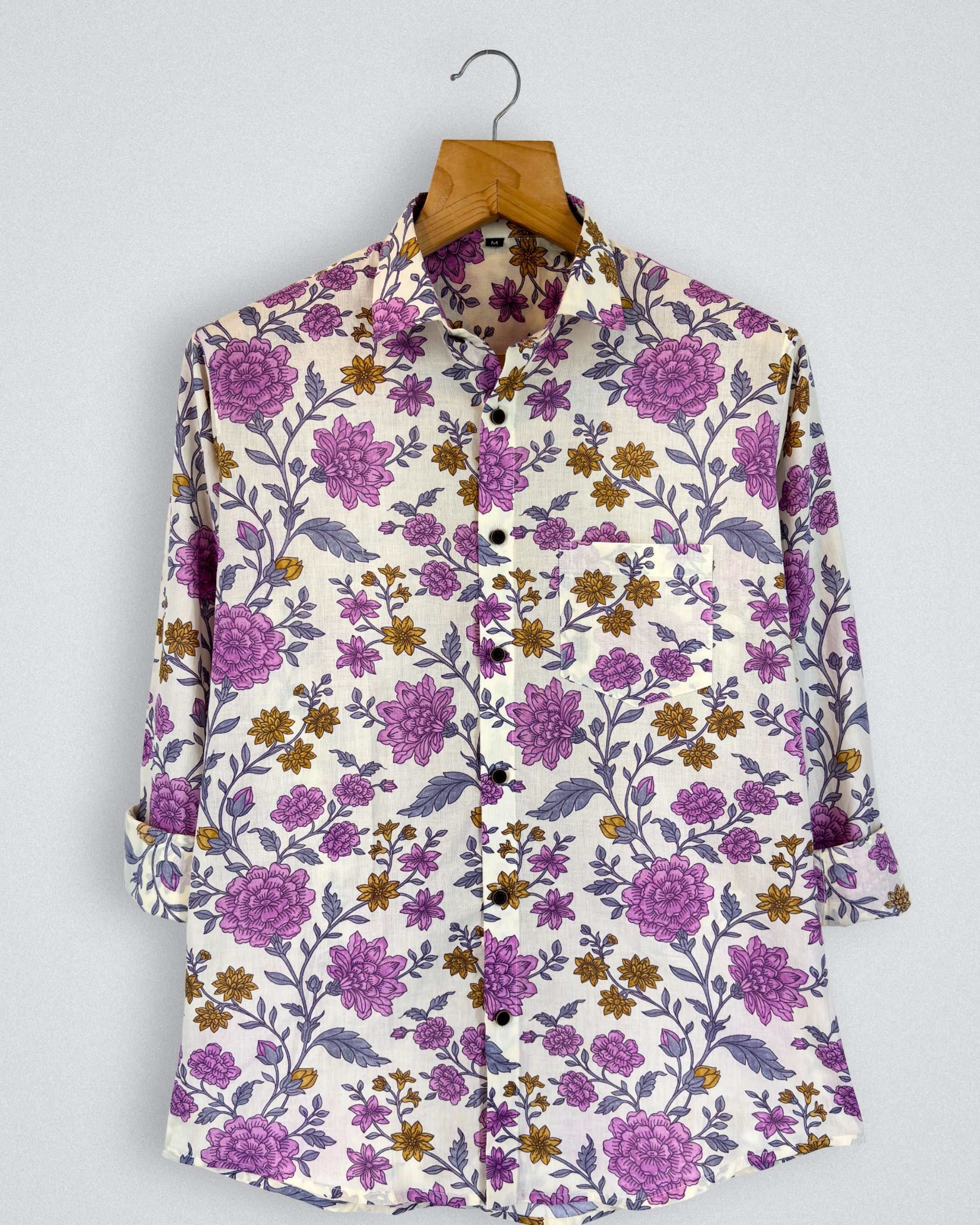 Step into style with Floral Charm by Jaipuri Crown – a stunning Full sleeve cotton shirt featuring an eye-catching floral print in vibrant purple and gold against a cream background. Made from 100% Sanganeri cotton, this shirt promises a soft, breathable fit, making it ideal for casual gatherings, festive occasions, or laid-back weekends.