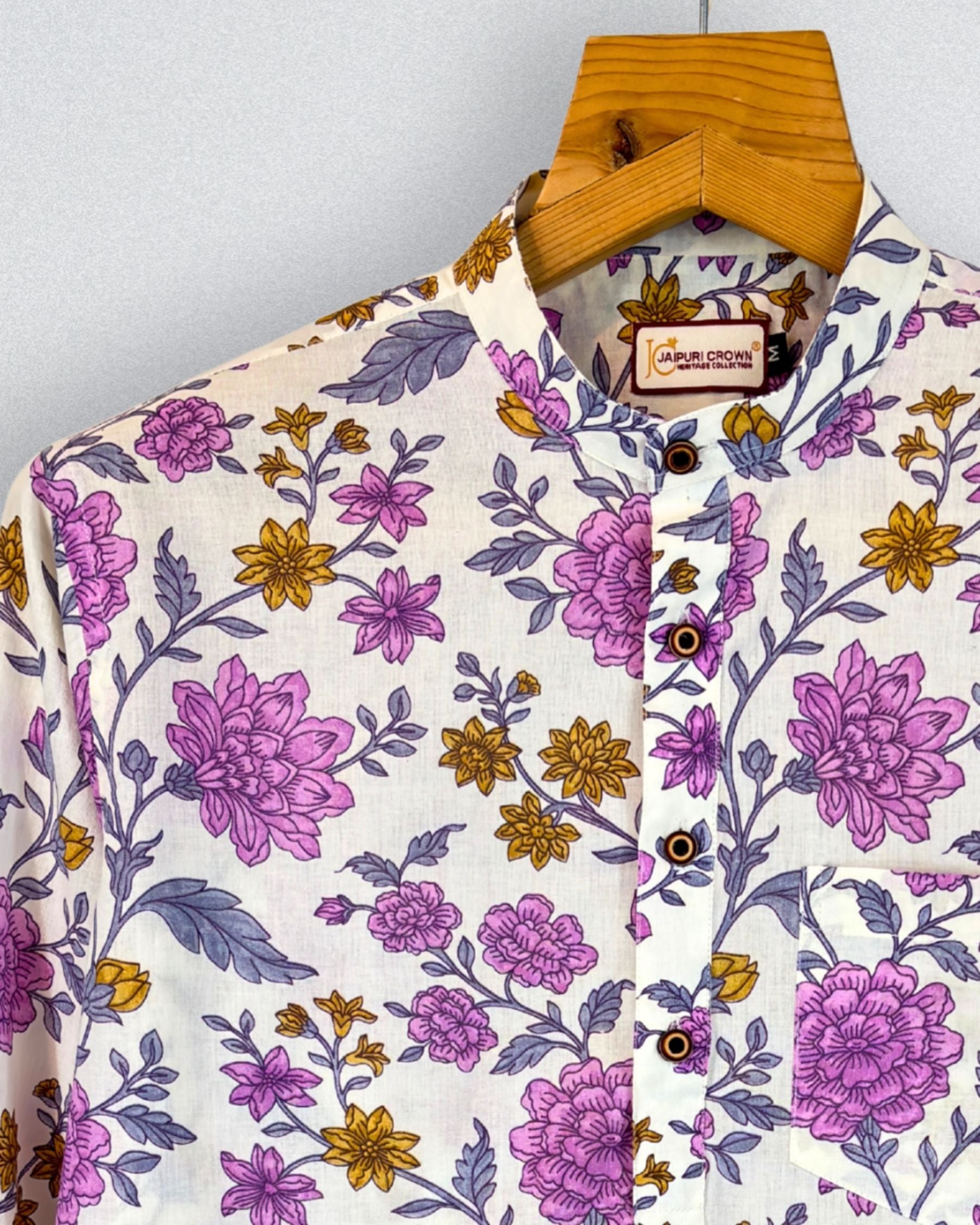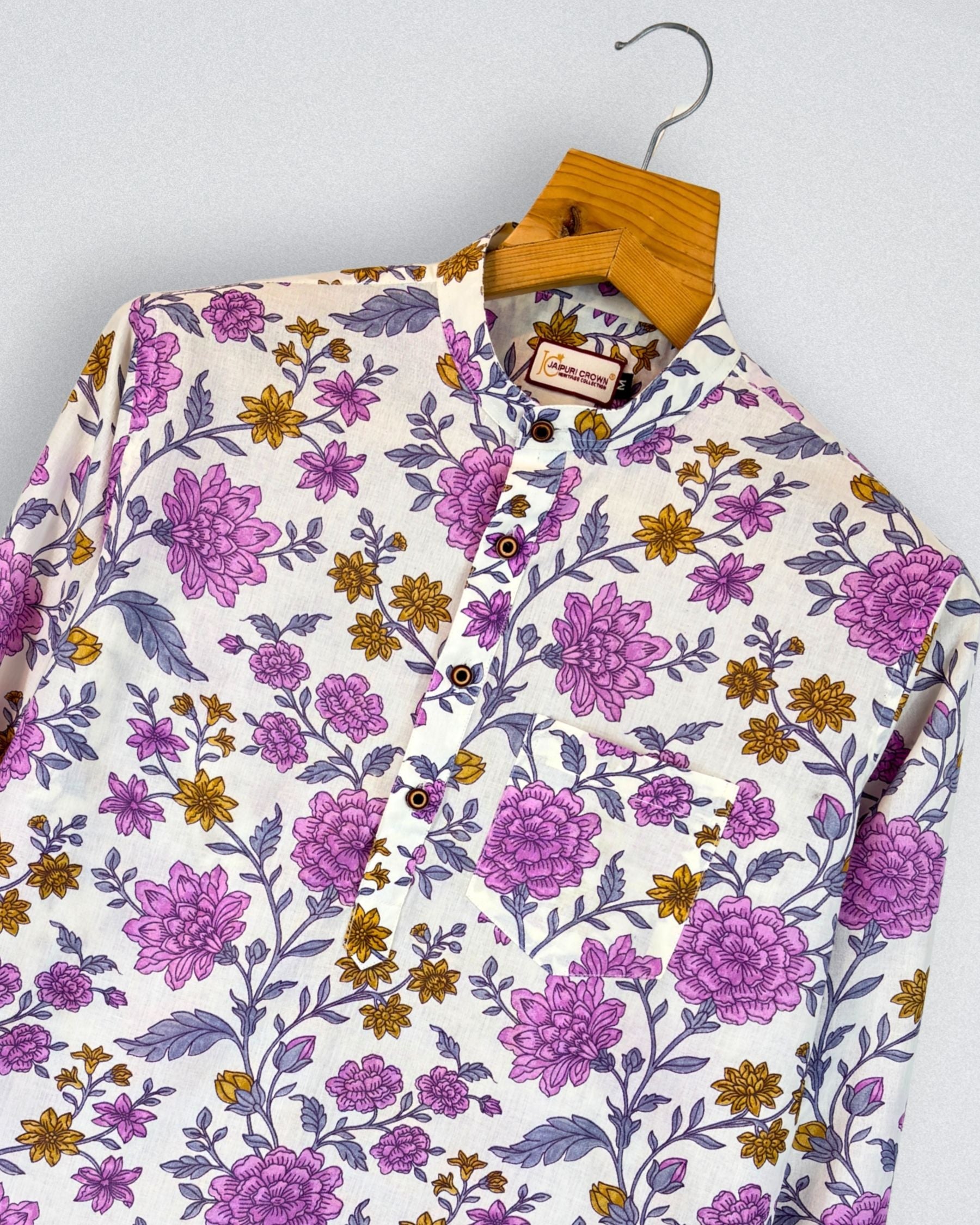 Step into elegance with Floral Charm by Jaipuri Crown – a stunning Short Kurta featuring a beautiful floral print in vibrant purple and gold against a soft white background. Made from 100% Sanganeri cotton, this kurta is not only stylish but also ensures maximum comfort for your everyday wear. Ideal for casual outings, family gatherings, or festive occasions, this piece will surely elevate your wardrobe.
