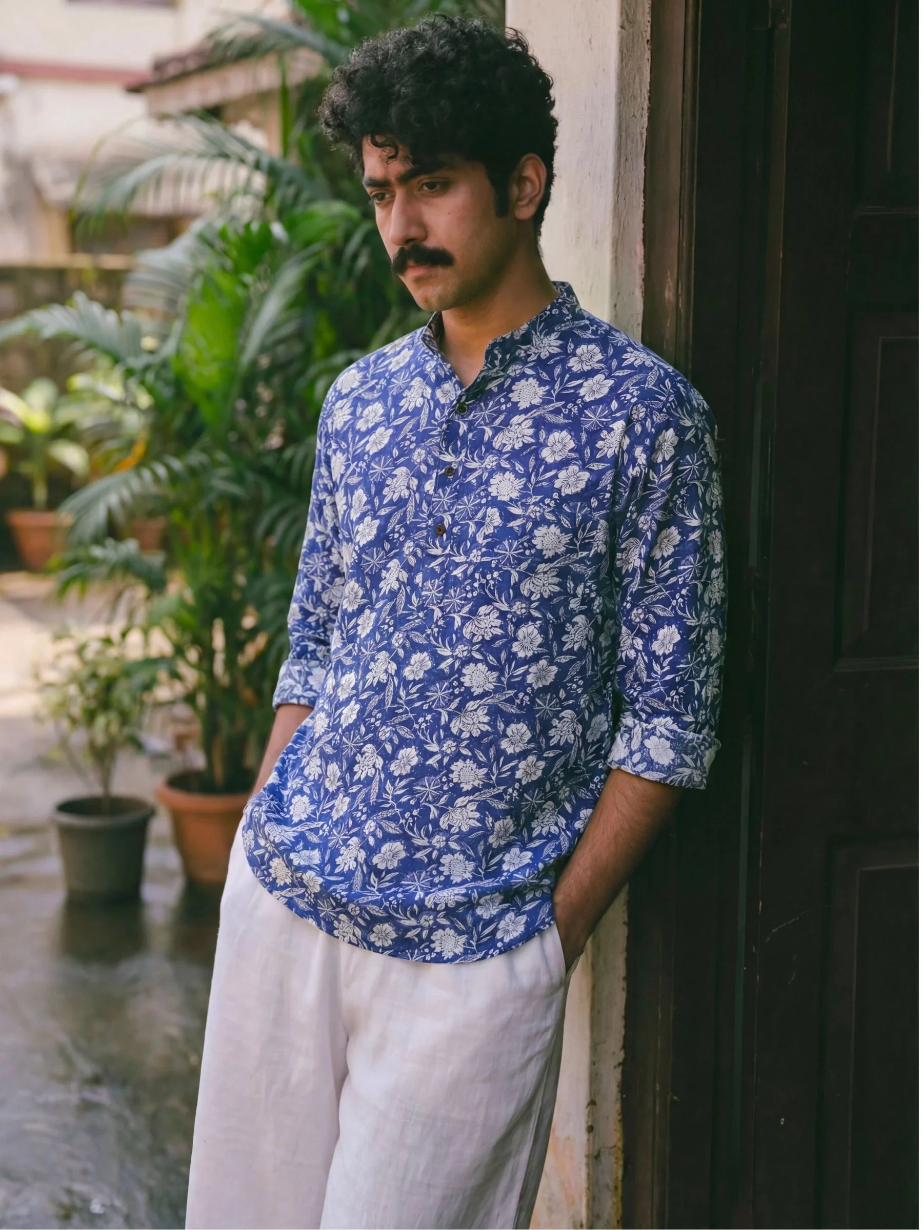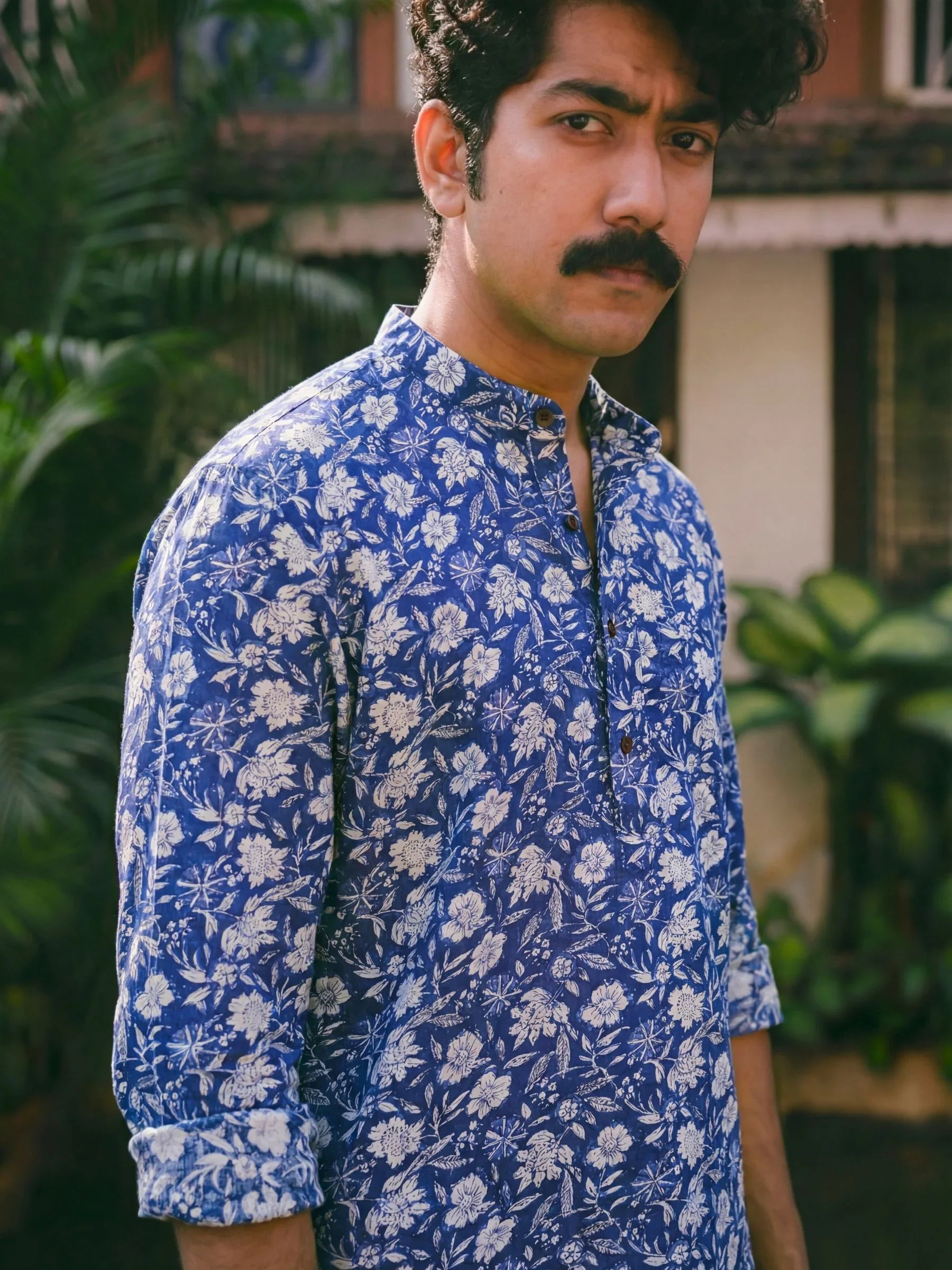 Elevate your wardrobe with Floral Charm by Jaipuri Crown – a striking Short Kurta featuring a vibrant blue floral print against a classic white background. Made from 100% Sanganeri cotton, this Kurta ensures supreme comfort and breathability, making it an ideal choice for casual gatherings, festive occasions, or lazy afternoons at home.