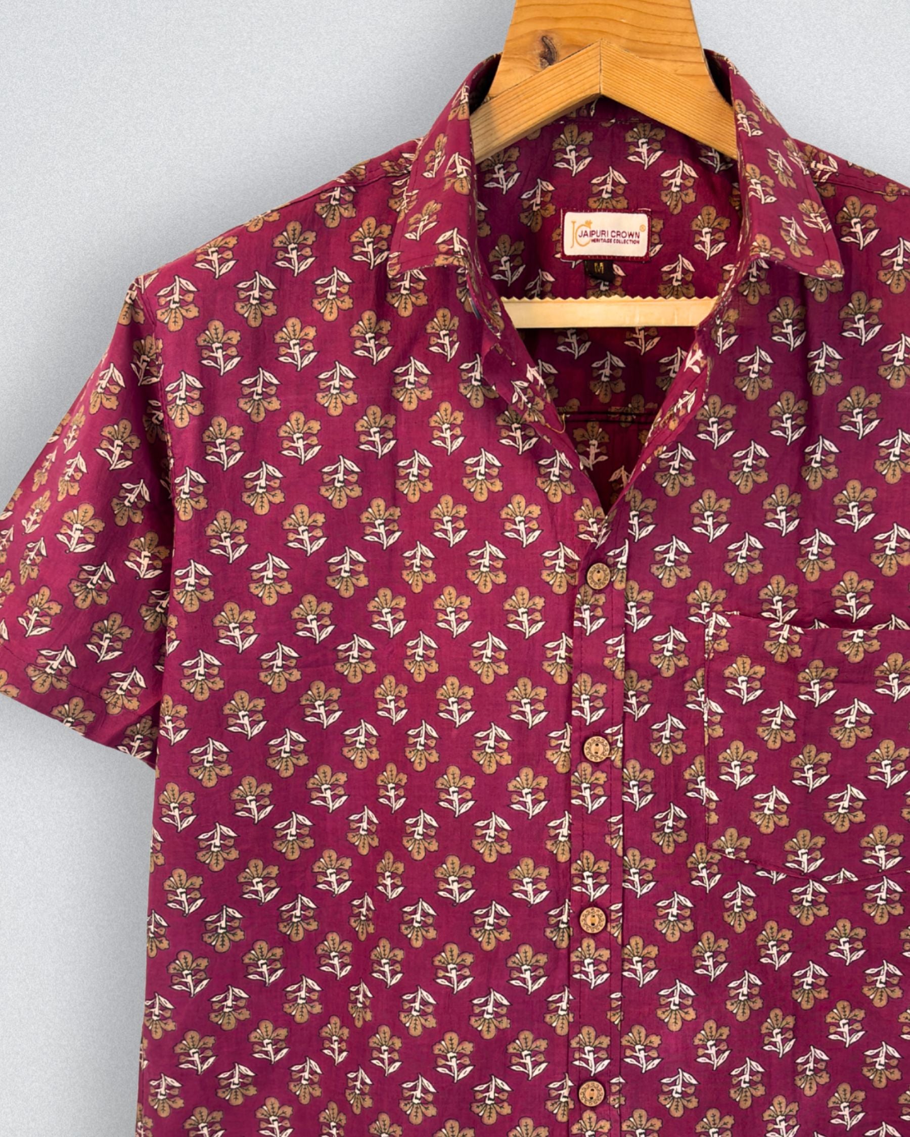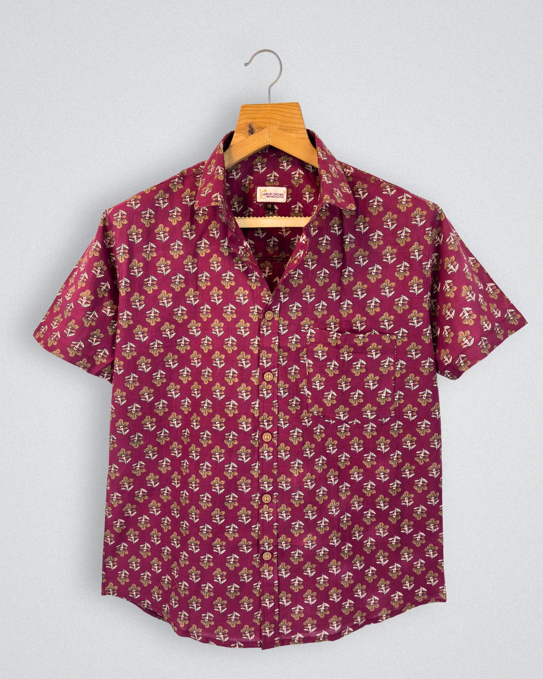 Elevate your casual wardrobe with Floral Elegance by Jaipuri Crown – a charming half sleeve cotton shirt featuring a beautiful floral pattern in maroon and gold. Made from 100% Sanganeri cotton, this shirt ensures a soft touch and breathability, perfect for any casual outing or laid-back day at home.