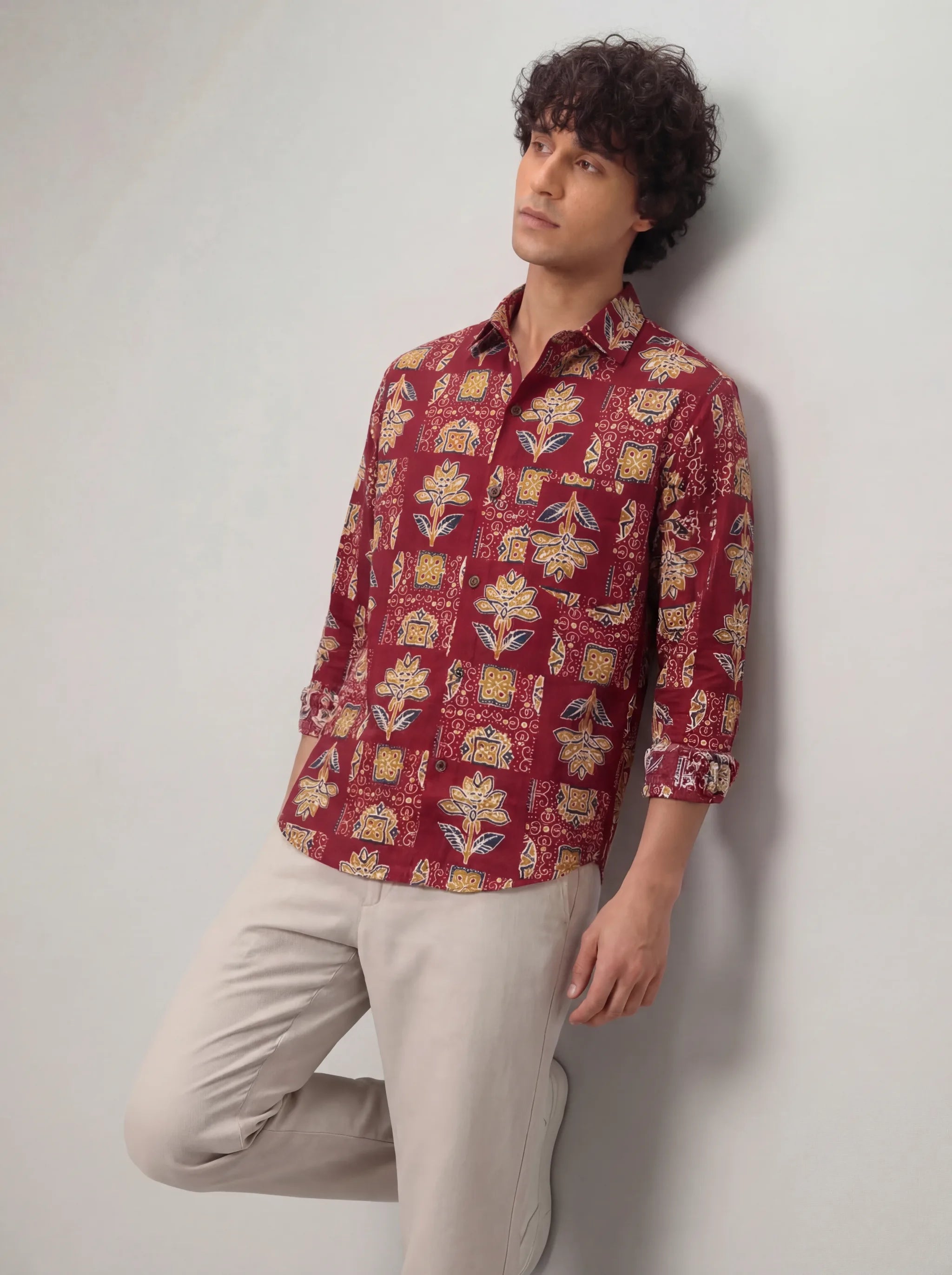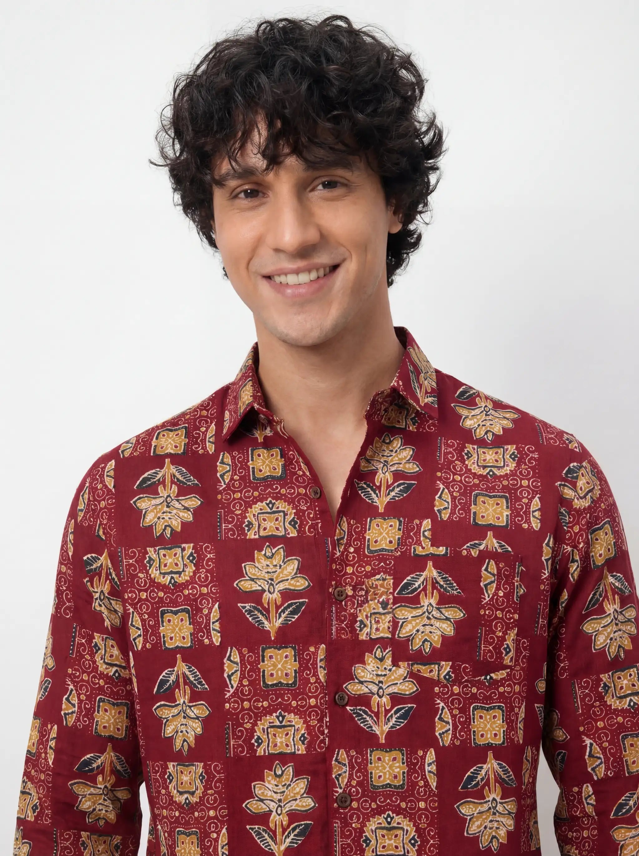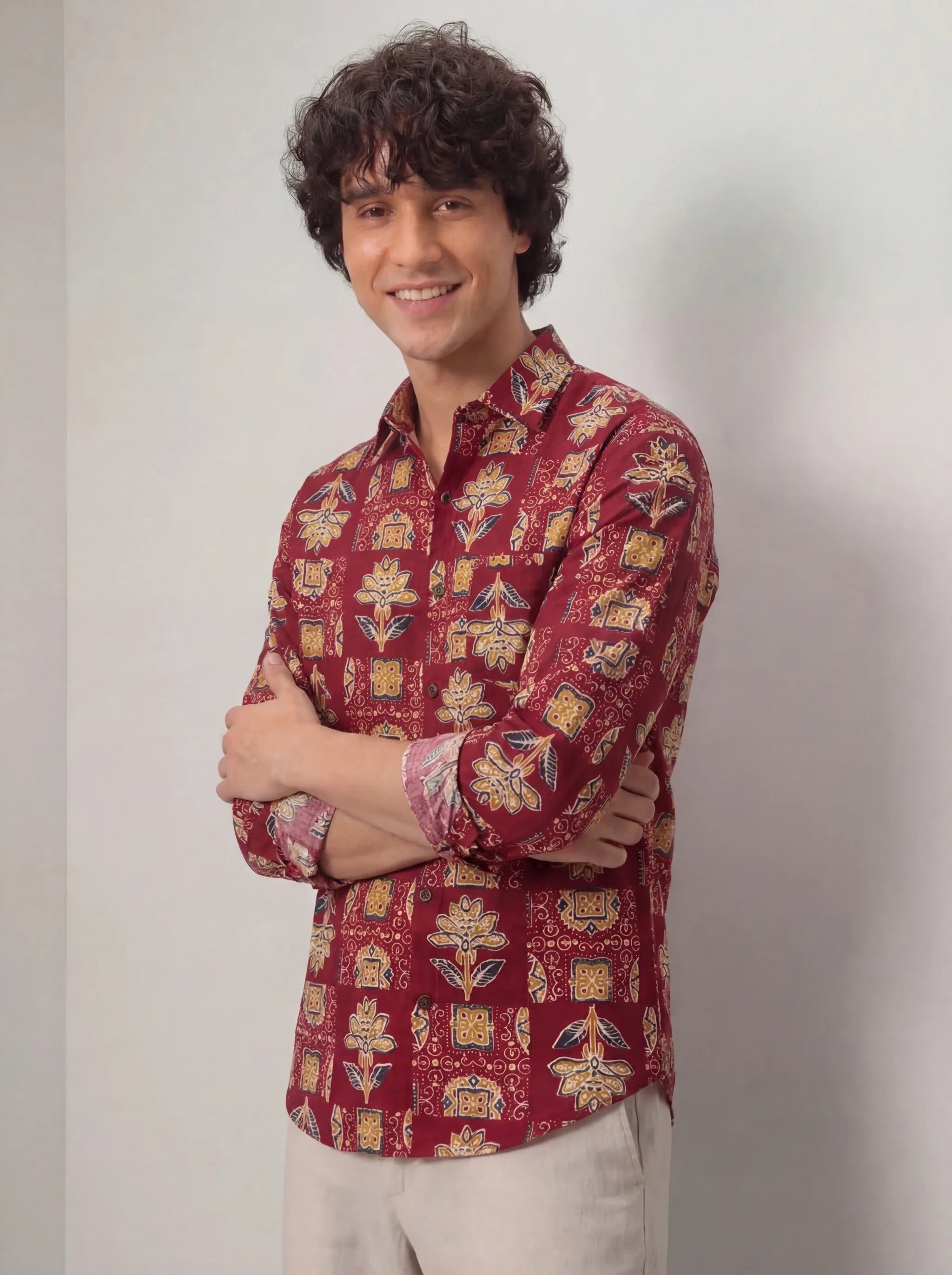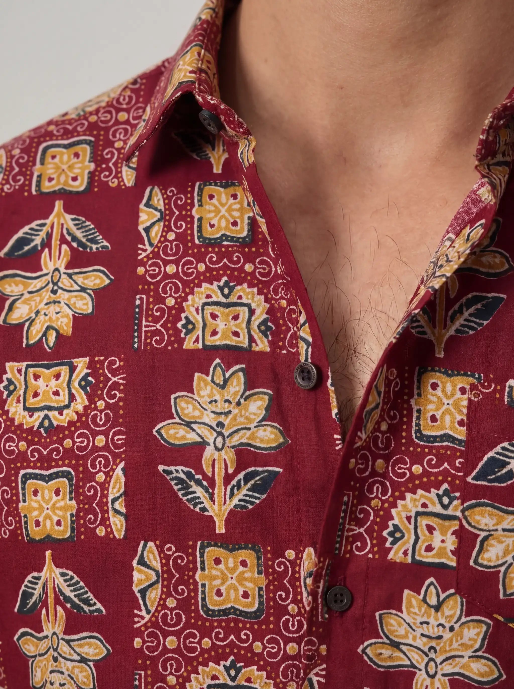 Elevate your casual wardrobe with Heritage Blossom by Jaipuri Crown – a striking Full sleeve cotton shirt featuring intricate floral patterns in vibrant hues of maroon, blue, and gold. Made from 100% Sanganeri cotton, this shirt promises a comfortable and breathable fit, ideal for casual outings, family gatherings, or festive occasions.