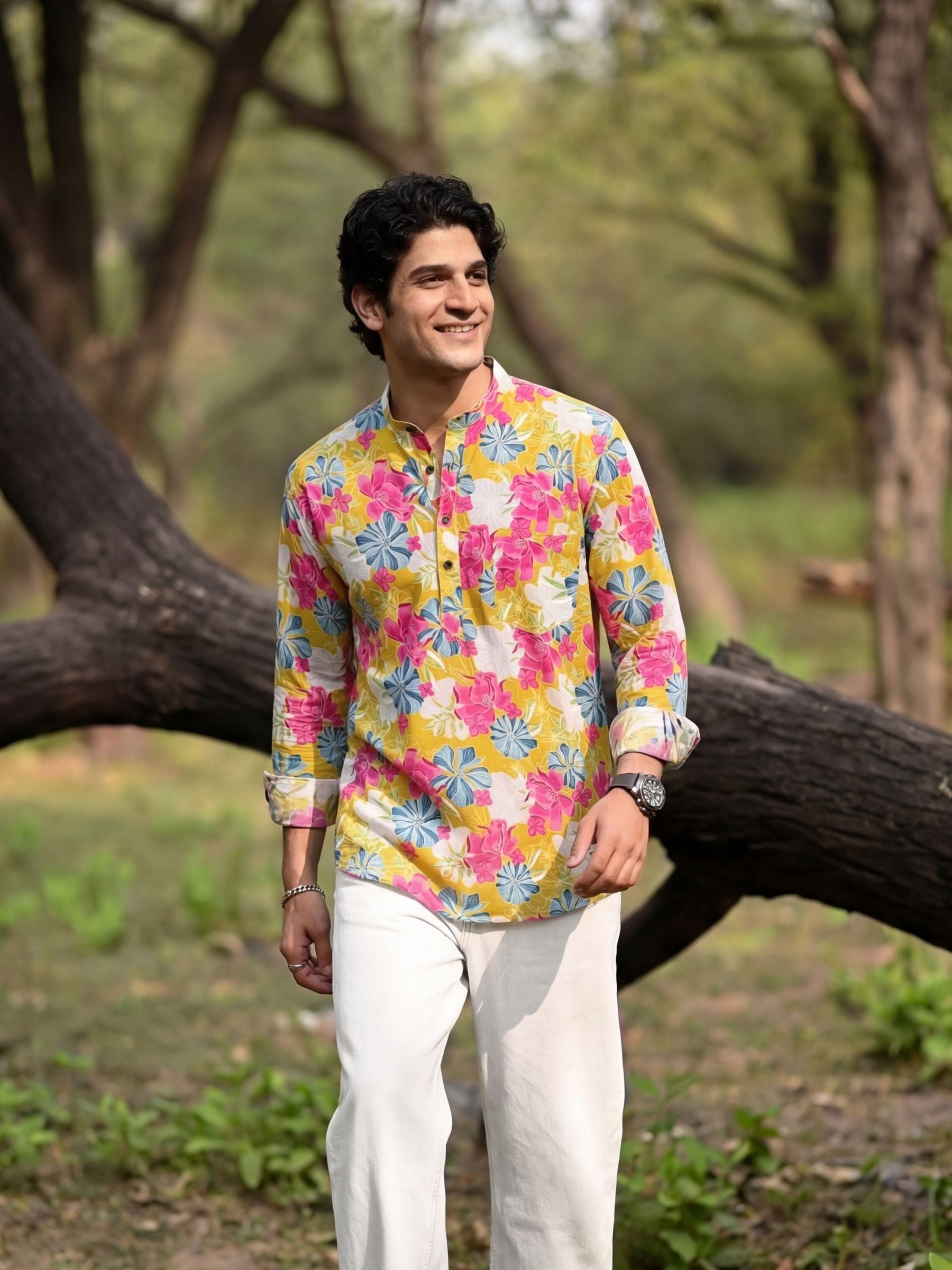 Step into summer with Tropical Bloom by Jaipuri Crown – a charming Short Kurta featuring a delightful floral print in vibrant pink and blue on a sunny yellow background. Made from 100% Sanganeri cotton, this Kurta ensures a soft, breathable, and comfortable fit, making it perfect for casual gatherings, beach outings, or leisurely strolls.