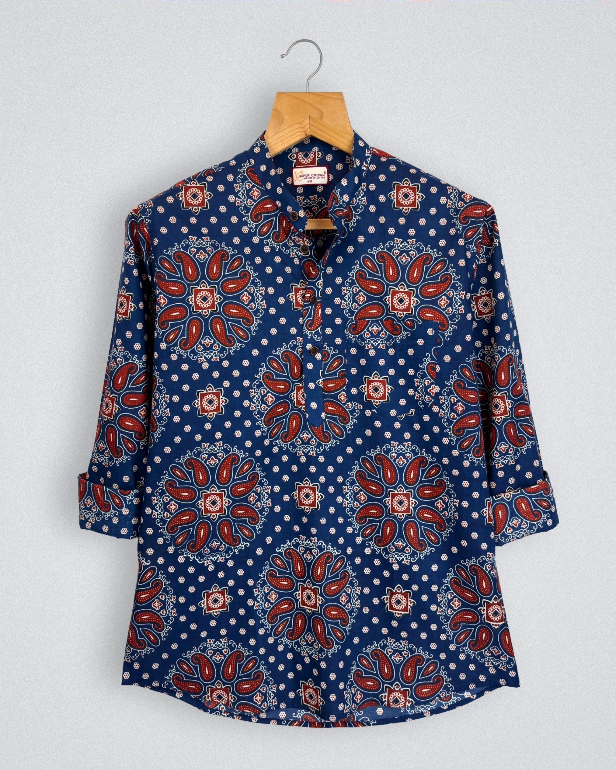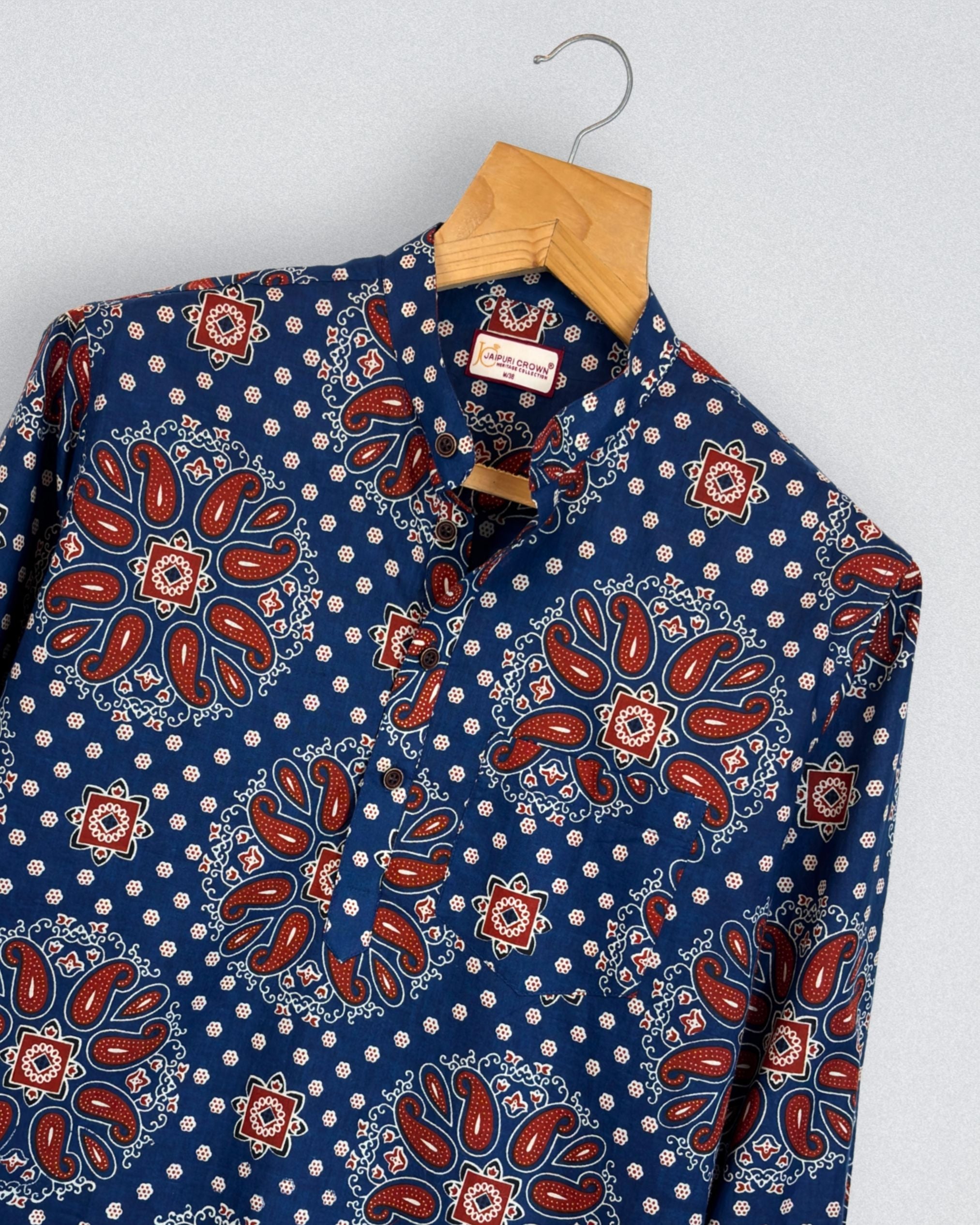 Step into style with Navy Blossom by Jaipuri Crown – a stunning Short Kurta featuring an intricate floral print in red and blue shades against a deep navy backdrop. Made from 100% Sanganeri cotton, this Kurta ensures a soft and breathable feel, making it ideal for festive occasions, casual gatherings, or relaxed weekends.