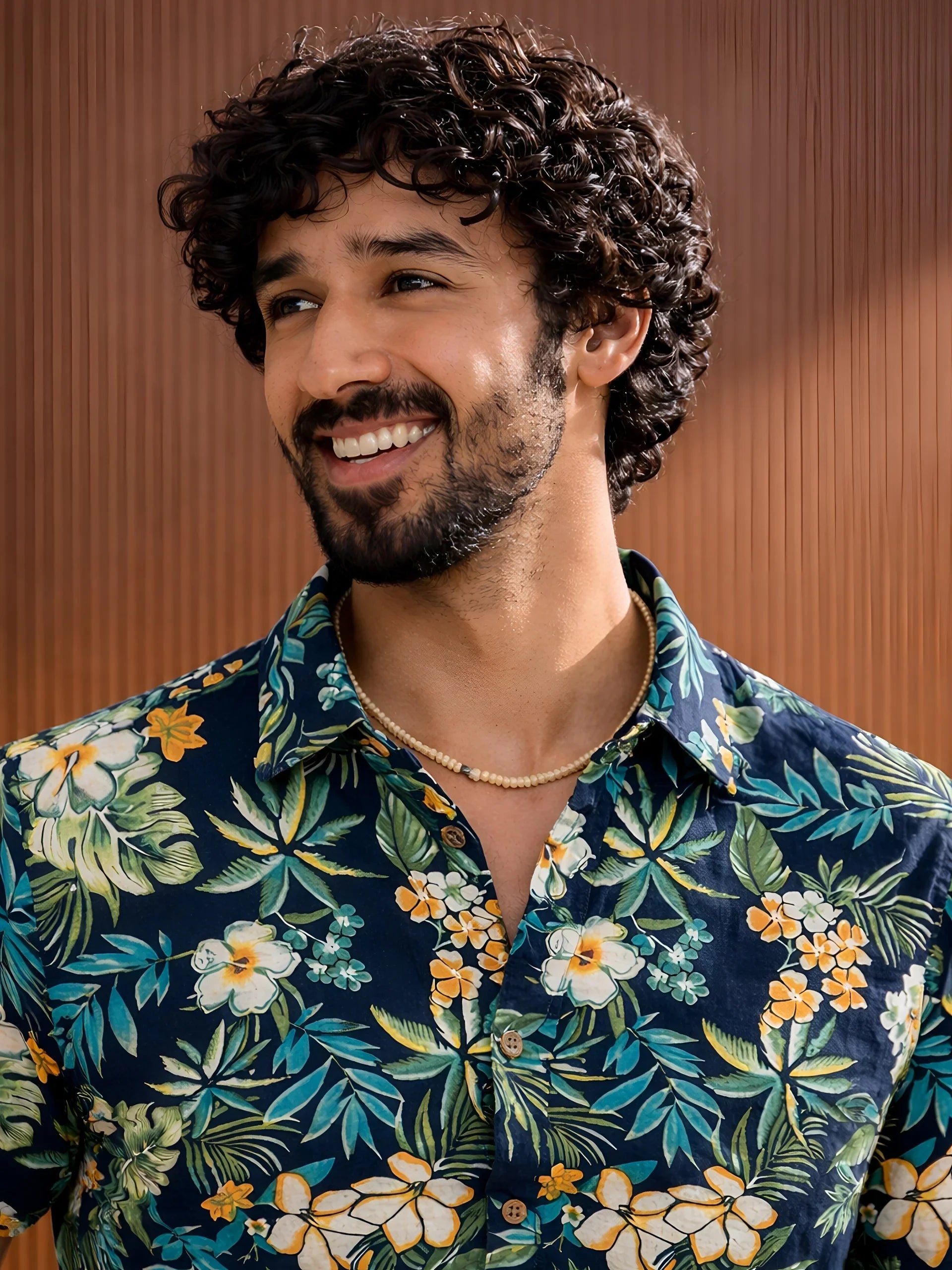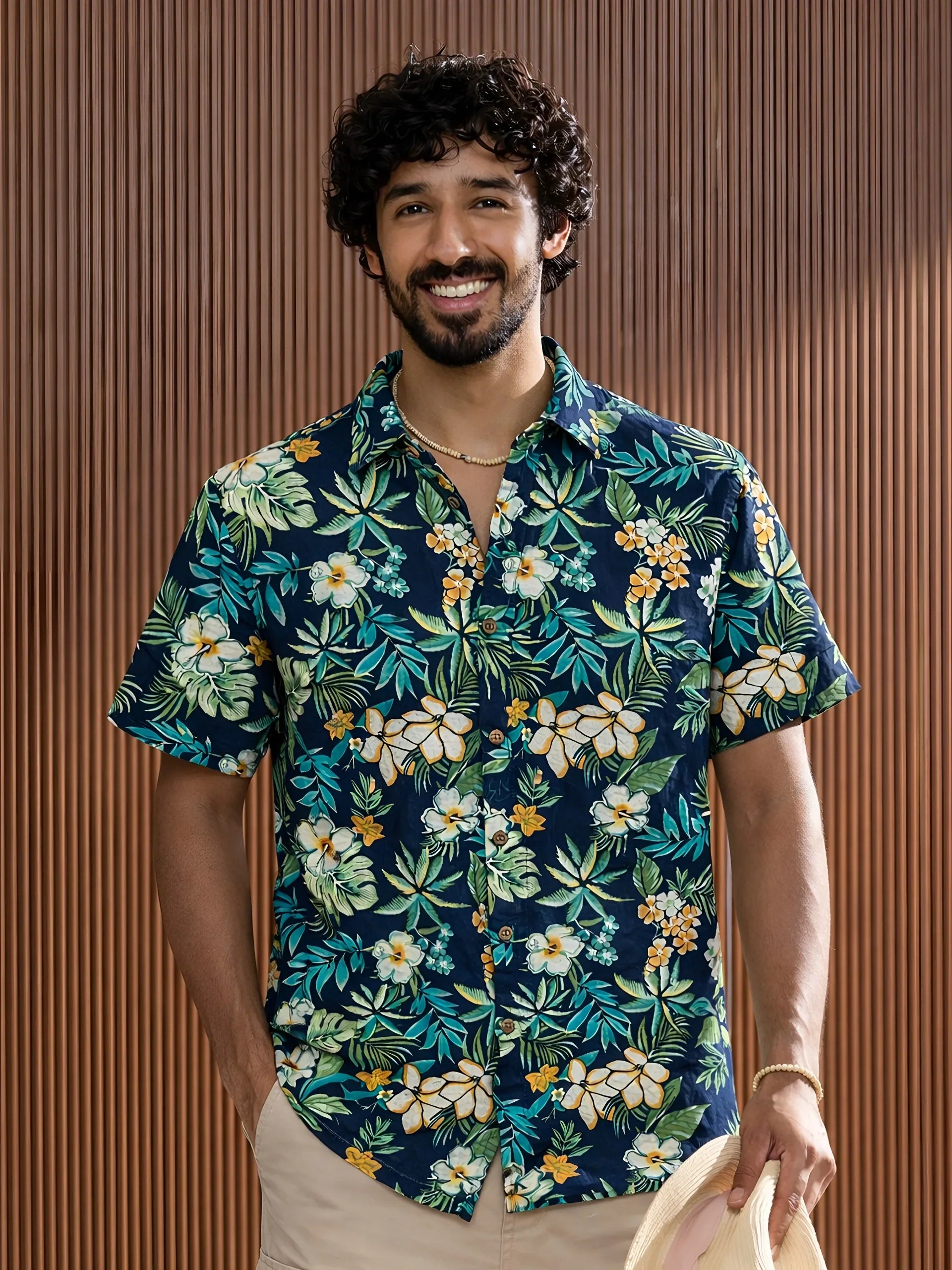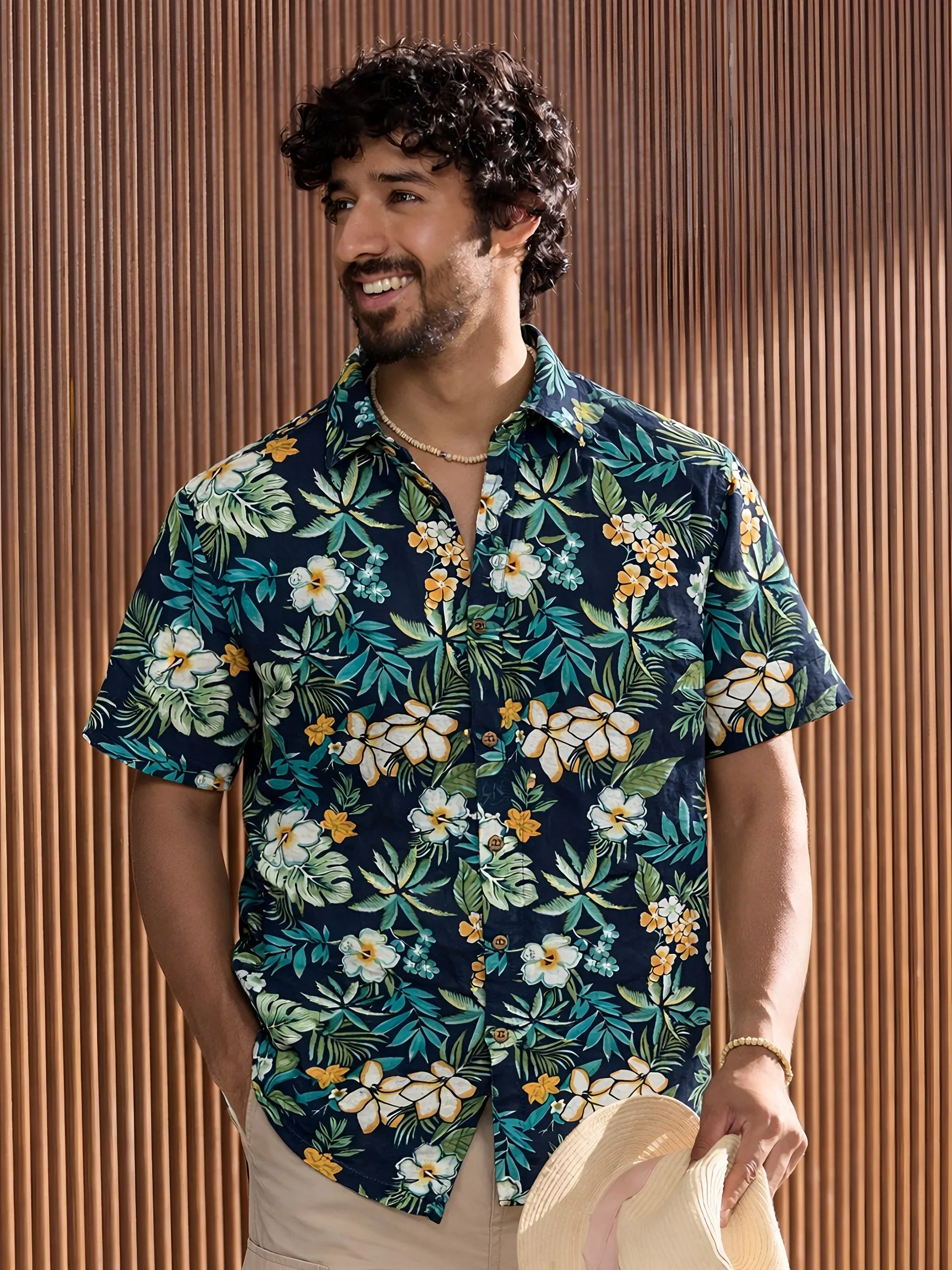 Step into the warmth of summer with Tropical Vibes by Jaipuri Crown – a stylish half sleeve cotton shirt showcasing a vibrant floral print in hues of navy, green, and yellow. Made from 100% breathable cotton, this shirt ensures comfort for all your casual outings, beach trips, or laid-back weekends.
