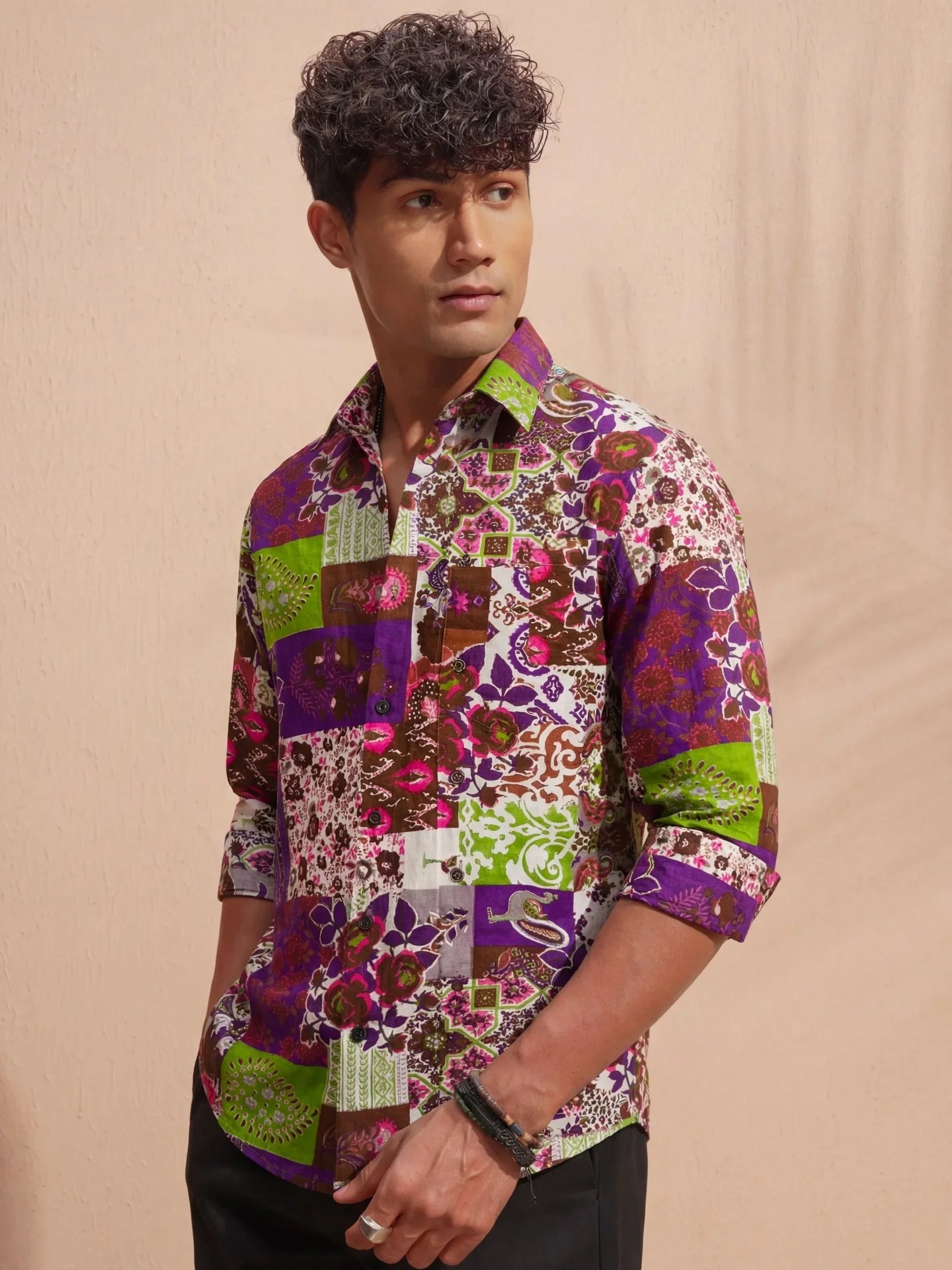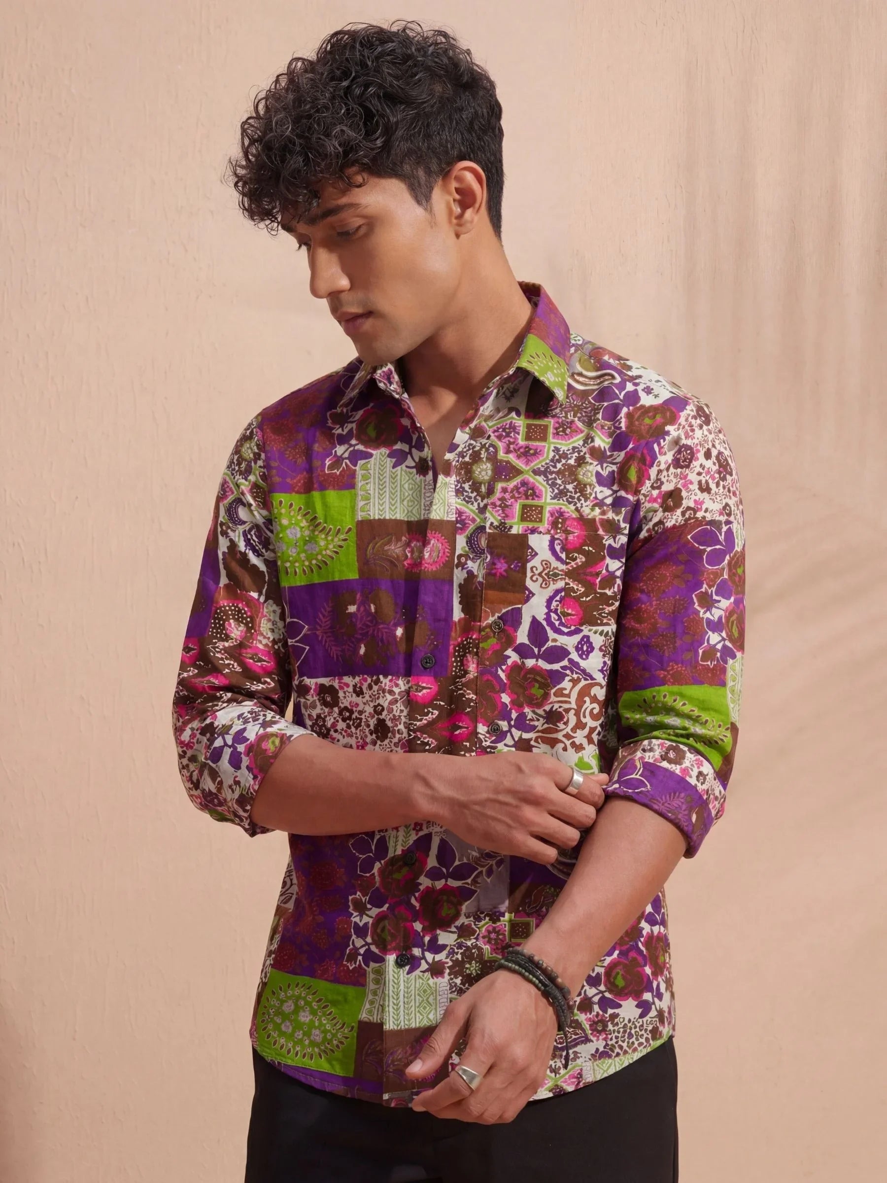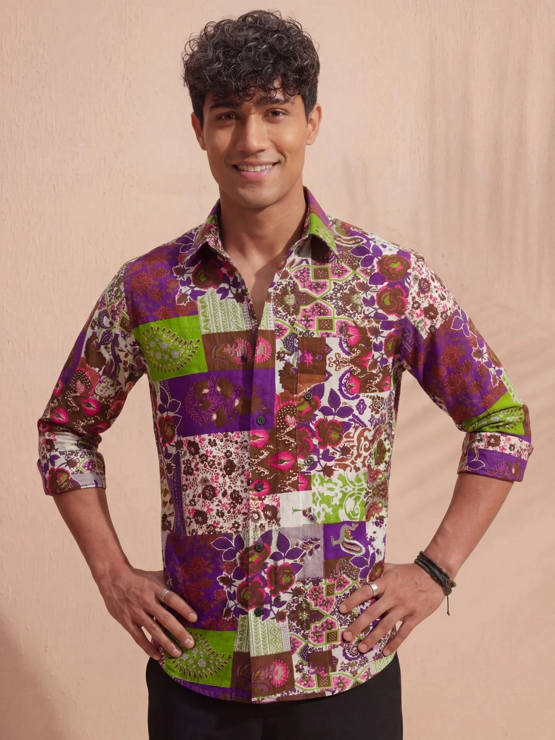 Step into the world of vibrant fashion with Floral Fusion by Jaipuri Crown – a stunning full sleeve cotton shirt featuring an eclectic mix of floral and geometric prints in rich purple, green, and earthy tones. This shirt, made from 100% Sanganeri cotton, ensures a soft touch against your skin while offering breathability for all-day comfort. Ideal for casual gatherings, festive occasions, or simply adding a dash of color to your wardrobe.