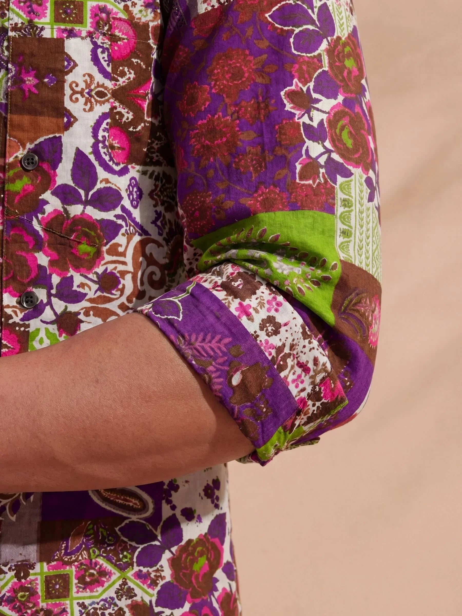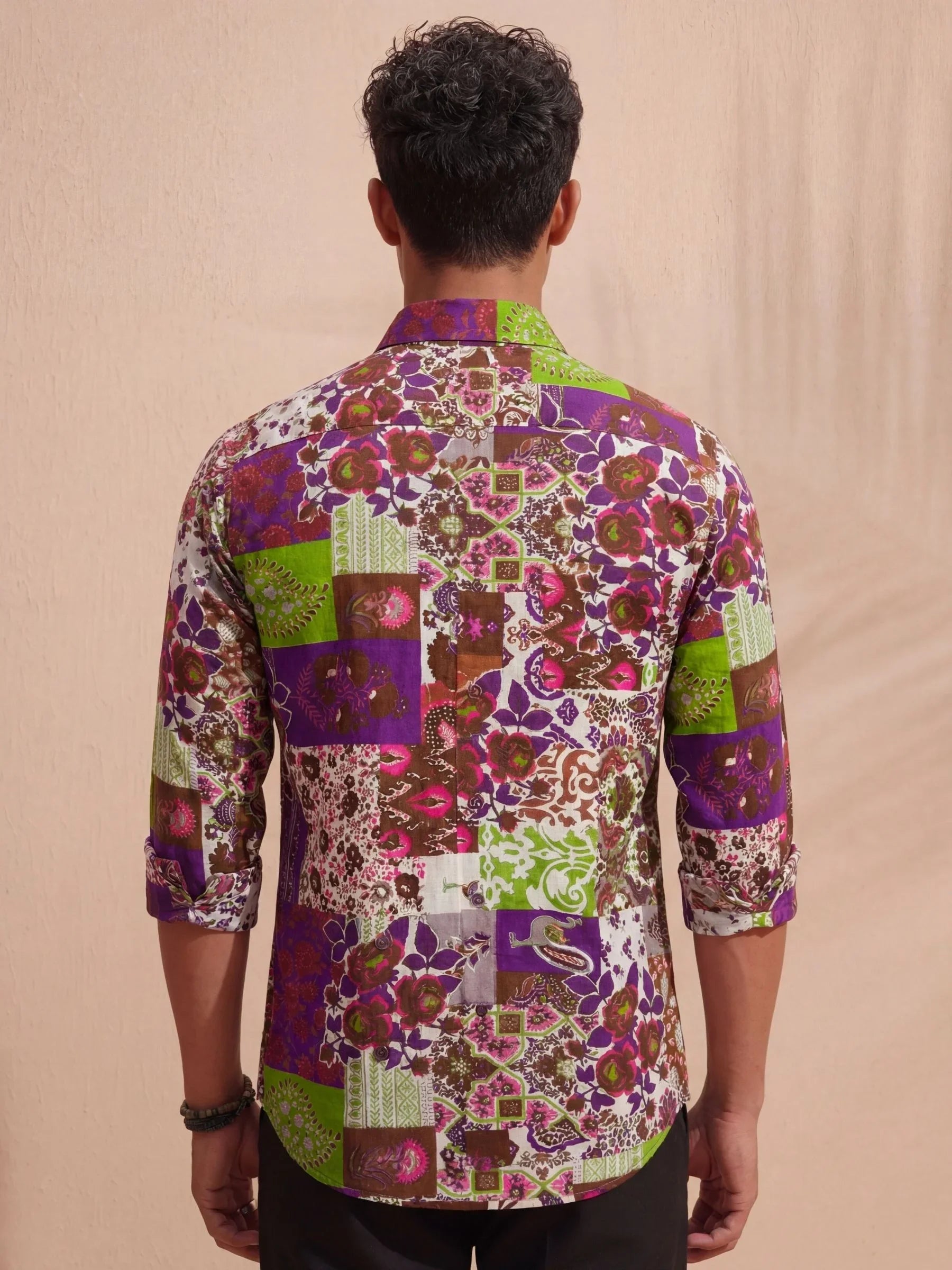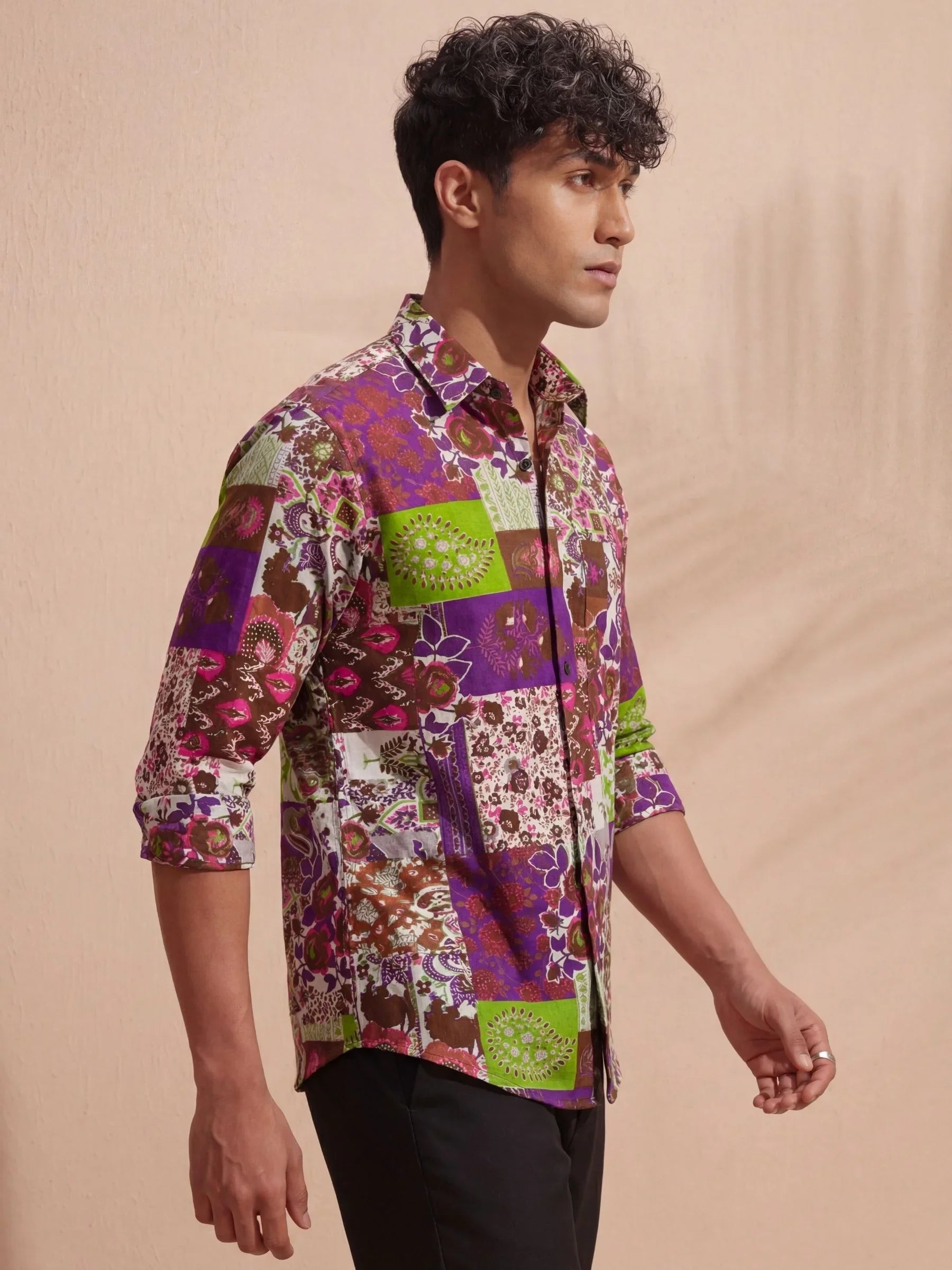 Step into the world of vibrant fashion with Floral Fusion by Jaipuri Crown – a stunning full sleeve cotton shirt featuring an eclectic mix of floral and geometric prints in rich purple, green, and earthy tones. This shirt, made from 100% Sanganeri cotton, ensures a soft touch against your skin while offering breathability for all-day comfort. Ideal for casual gatherings, festive occasions, or simply adding a dash of color to your wardrobe.