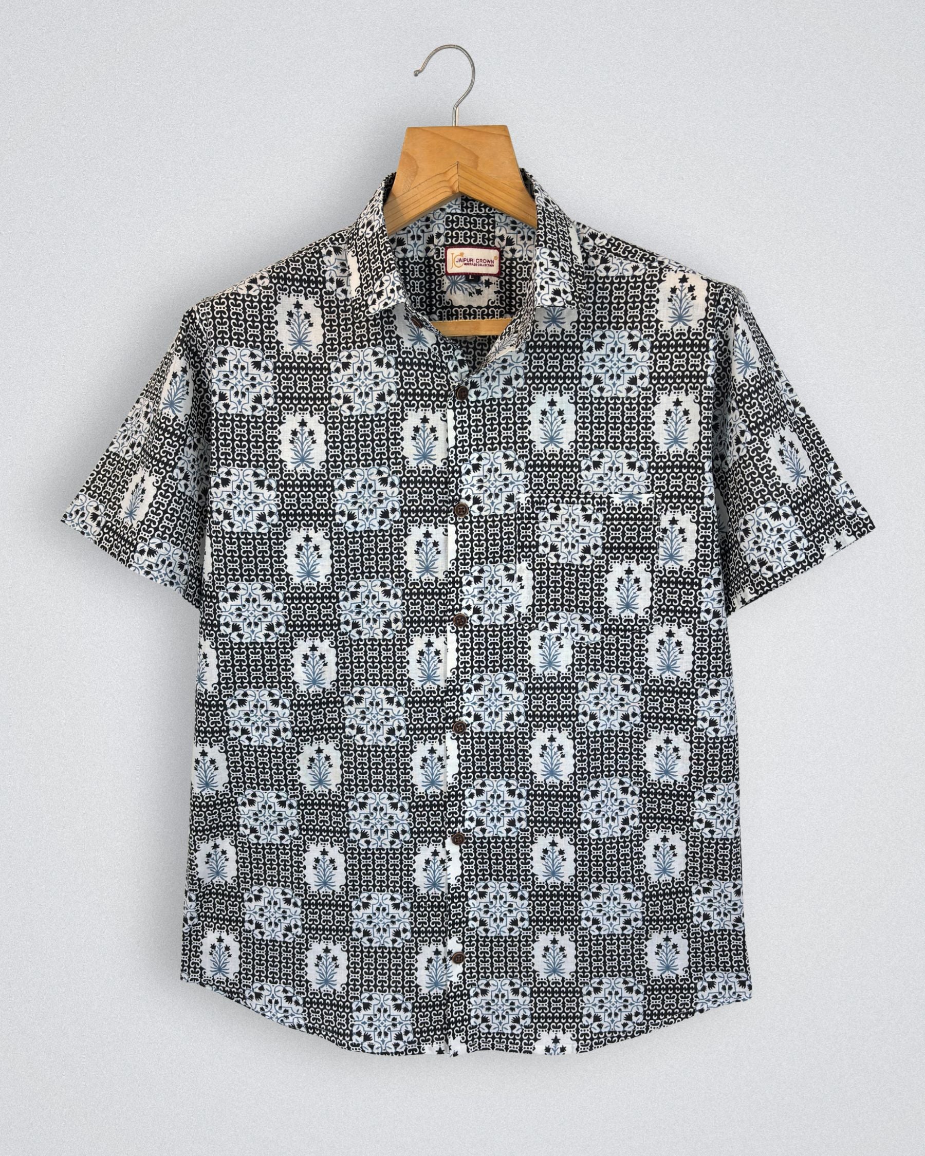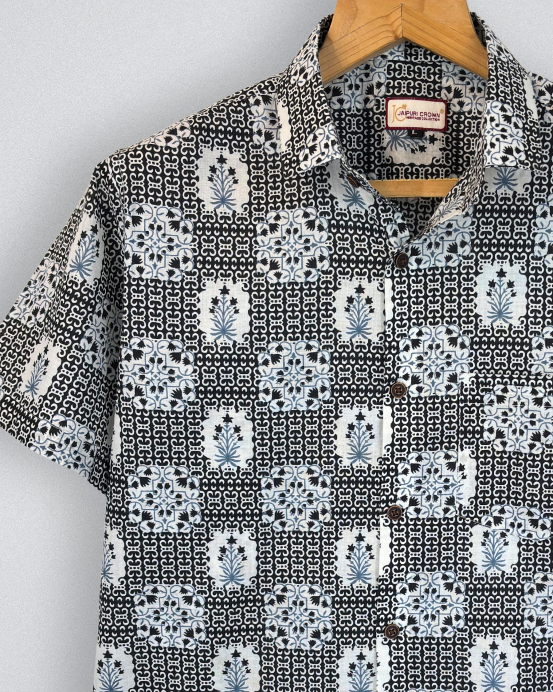 Step up your style game with Botanical Bliss by Jaipuri Crown – a chic half sleeve cotton shirt featuring an eye-catching floral pattern in soothing shades of blue on a classic black base. Crafted from 100% breathable cotton, this shirt ensures comfort all day long, making it the ideal choice for casual outings, brunches, or weekend adventures.