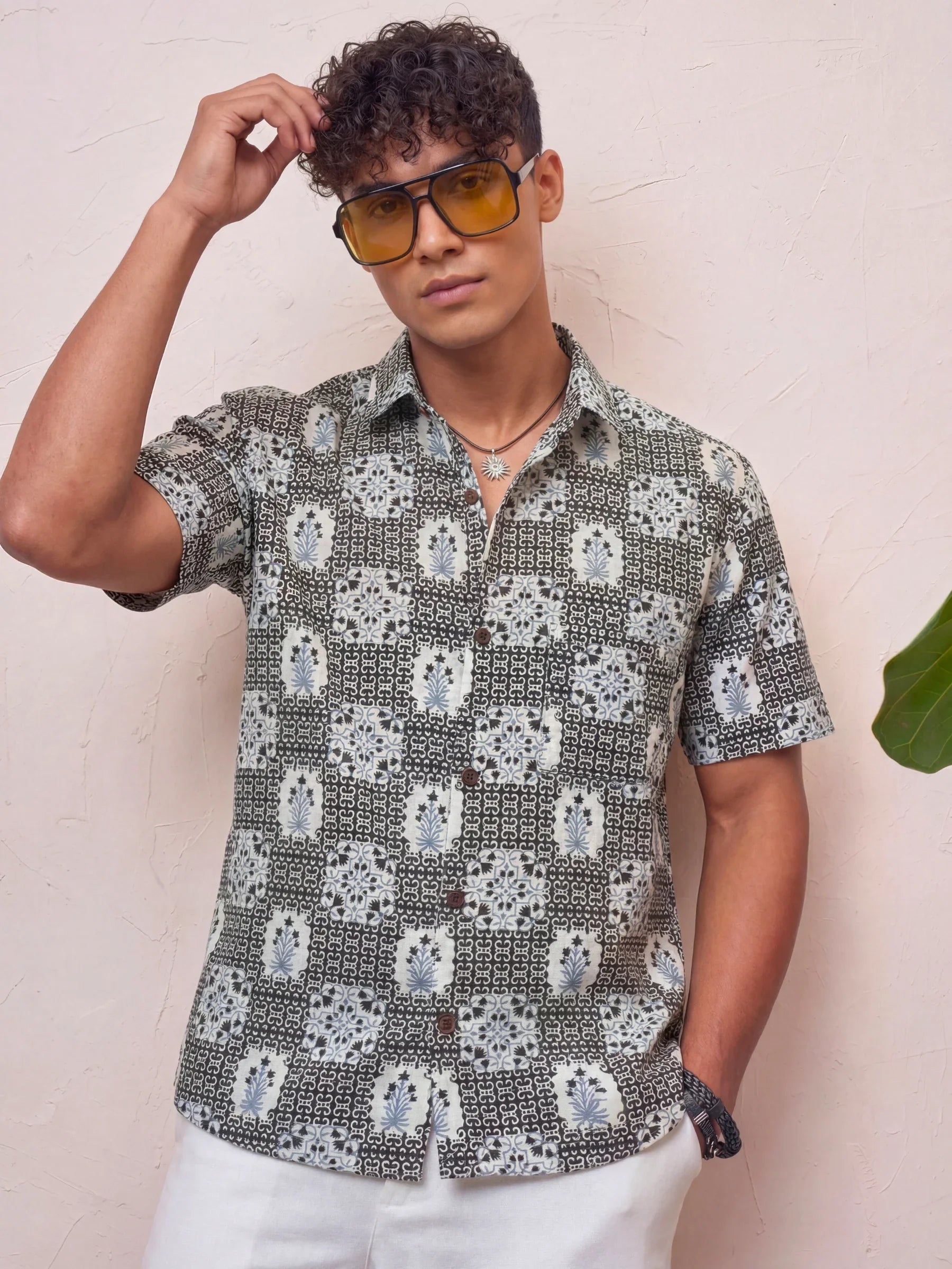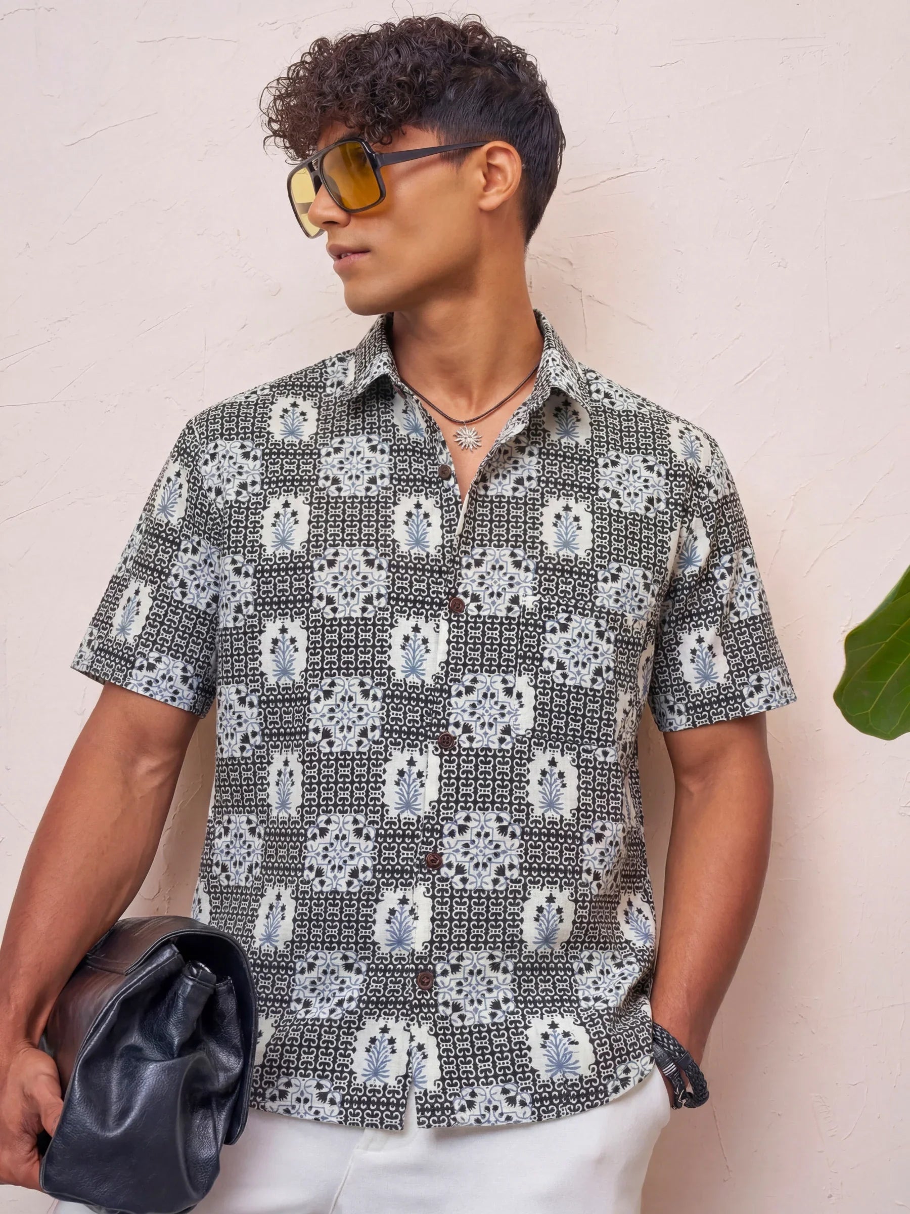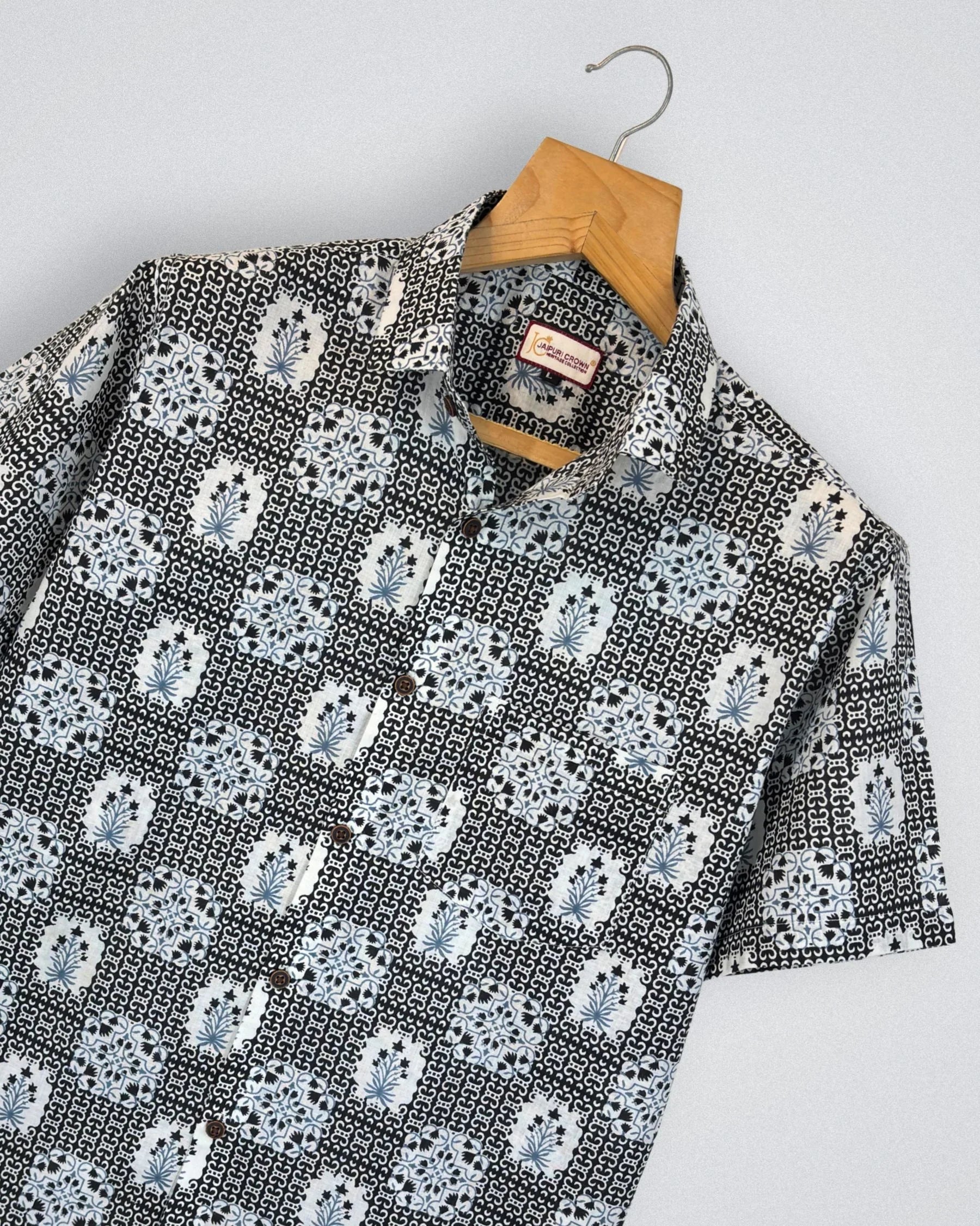 Step up your style game with Botanical Bliss by Jaipuri Crown – a chic half sleeve cotton shirt featuring an eye-catching floral pattern in soothing shades of blue on a classic black base. Crafted from 100% breathable cotton, this shirt ensures comfort all day long, making it the ideal choice for casual outings, brunches, or weekend adventures.