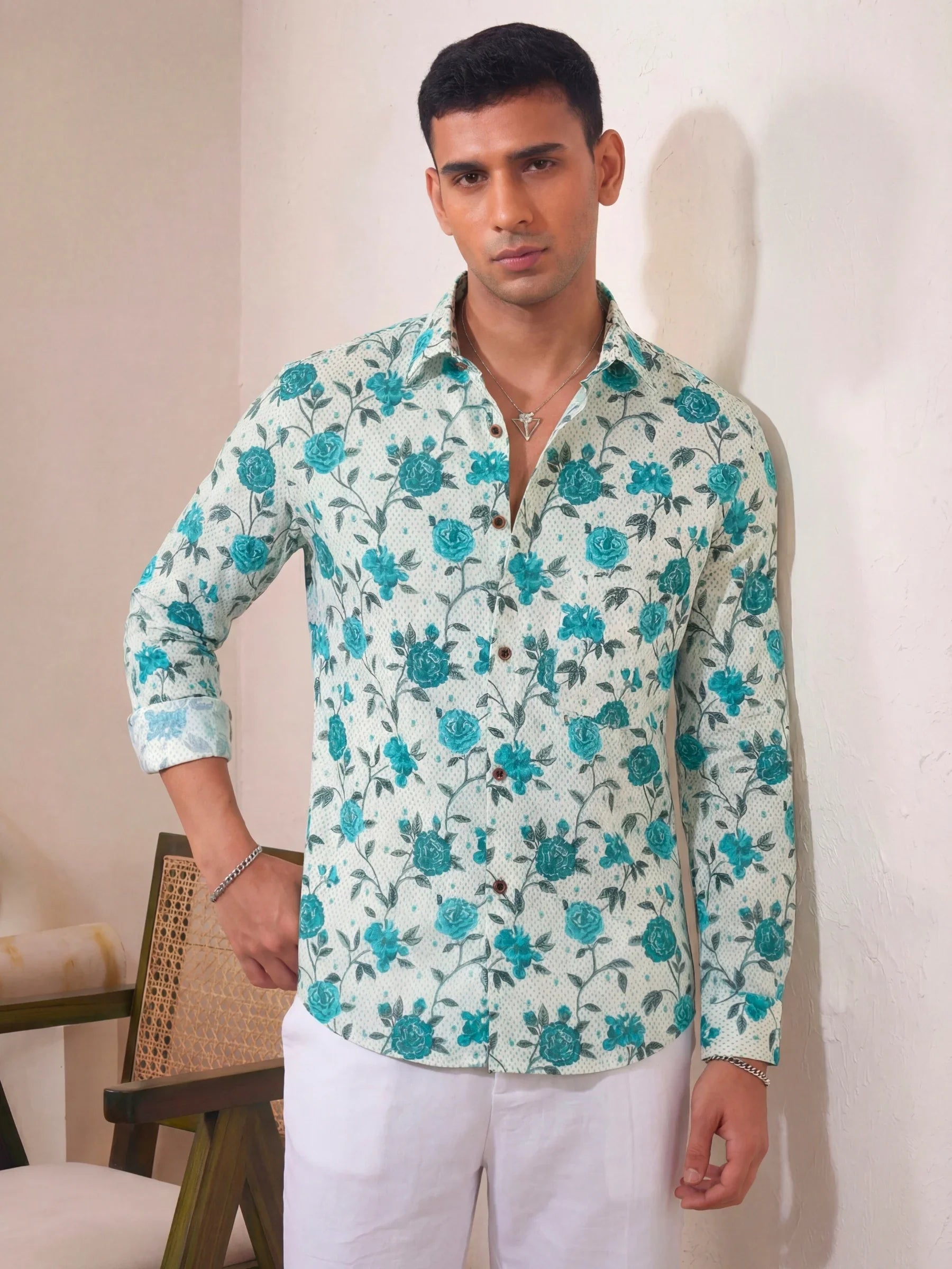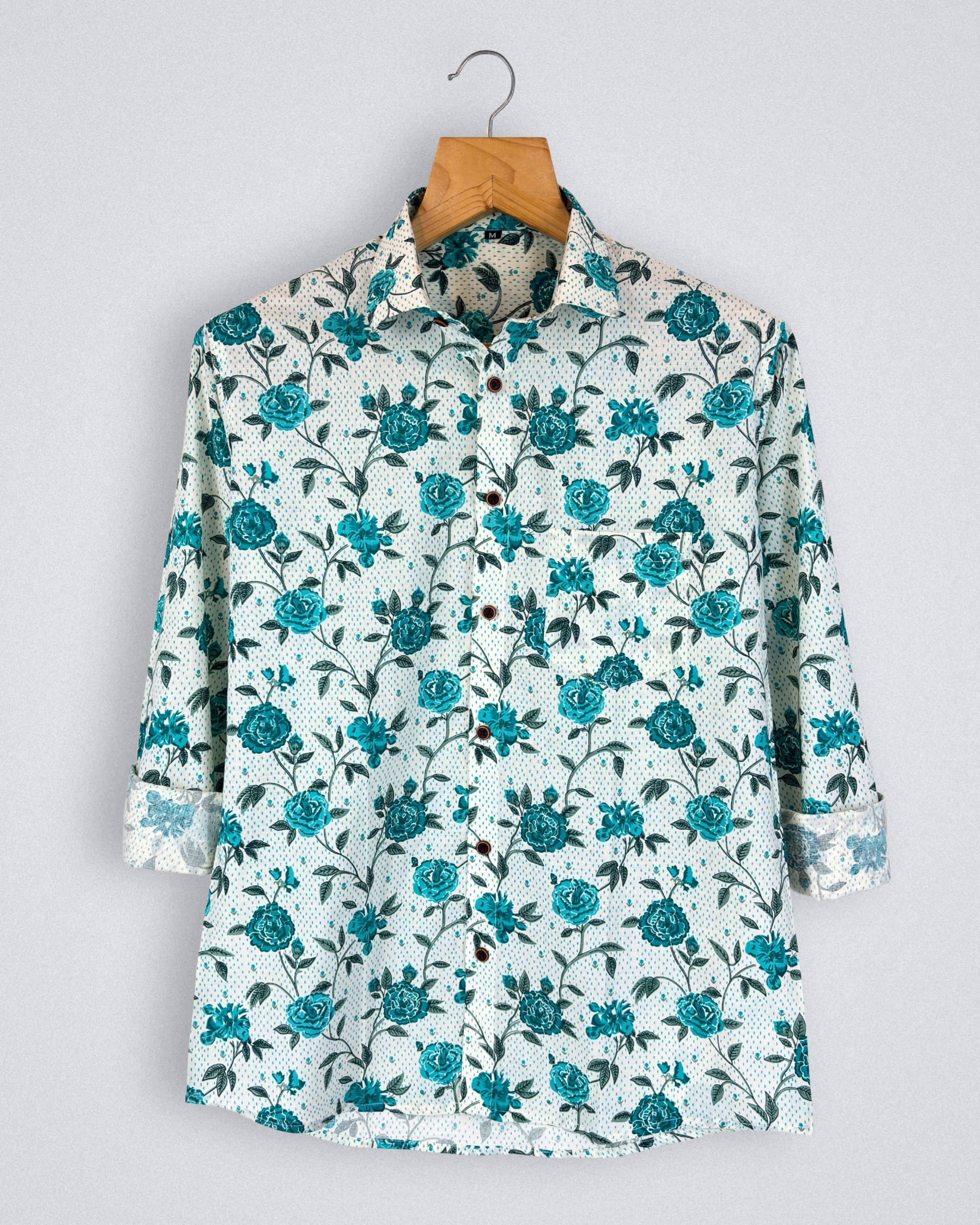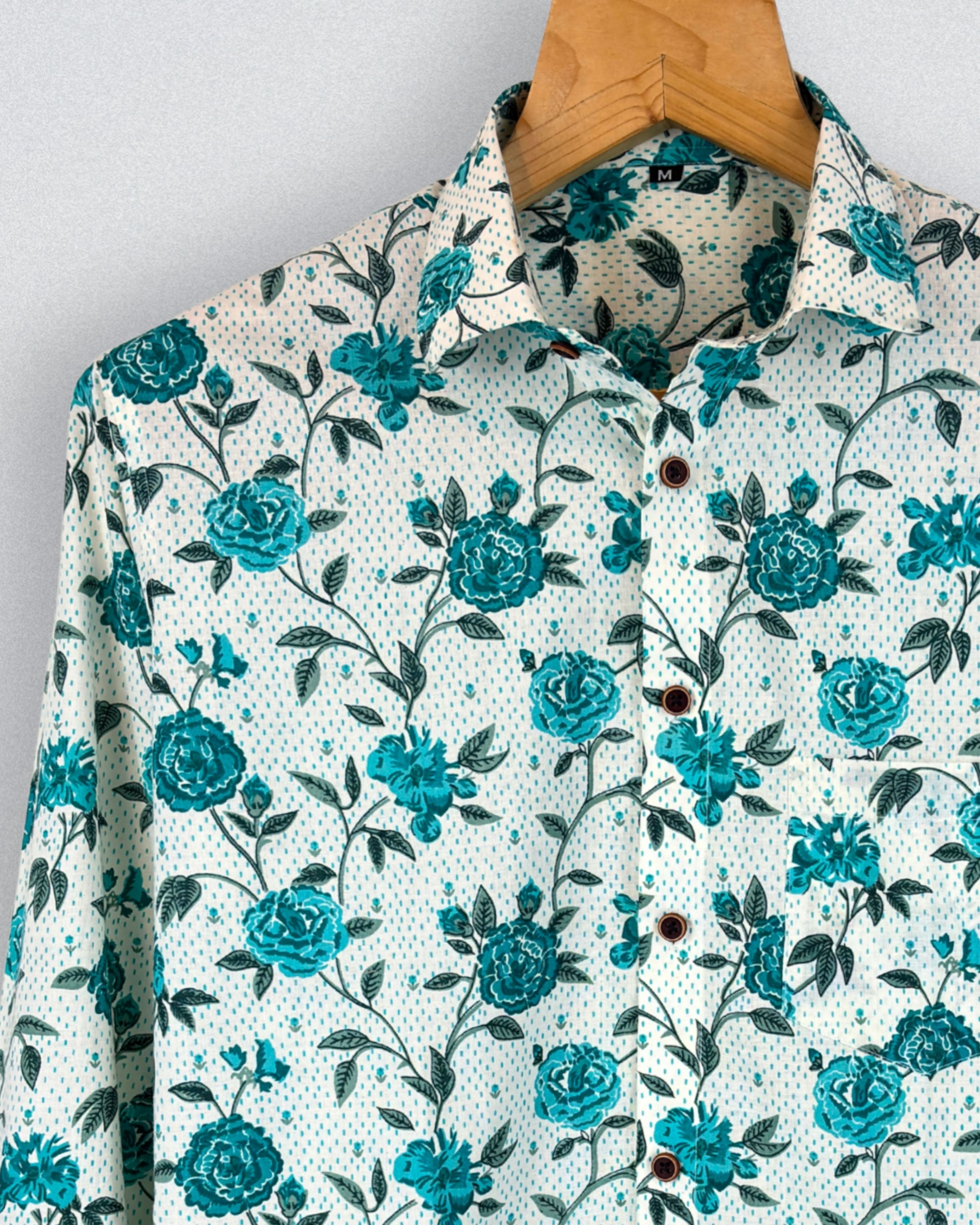 Step into style with Rose Garden by Jaipuri Crown – a charming full sleeve cotton shirt featuring a delightful floral print in teal against a cream backdrop. Made from 100% Sanganeri cotton, this shirt ensures a soft and breathable fit, perfect for casual gatherings, outings, or relaxed weekends.