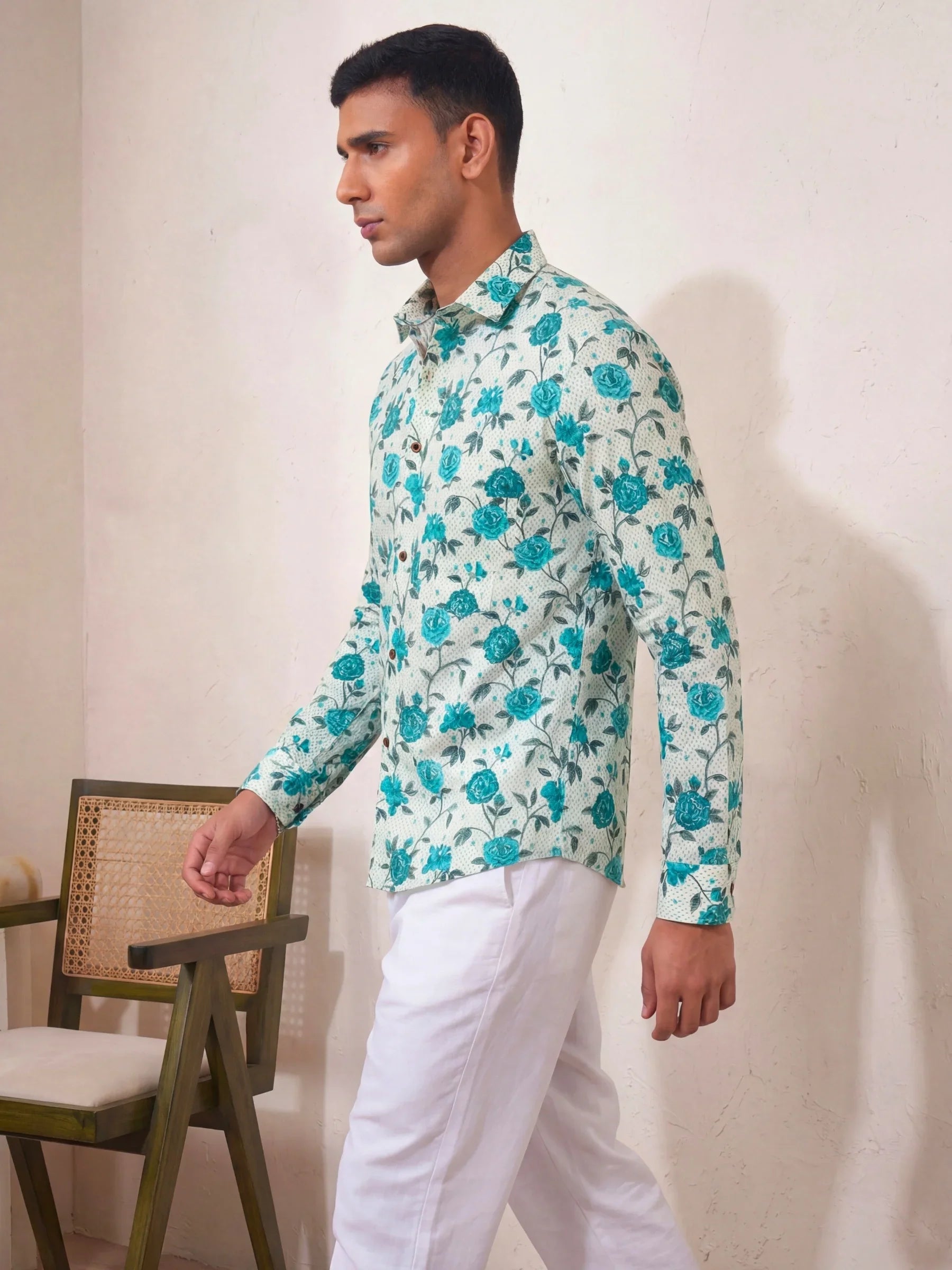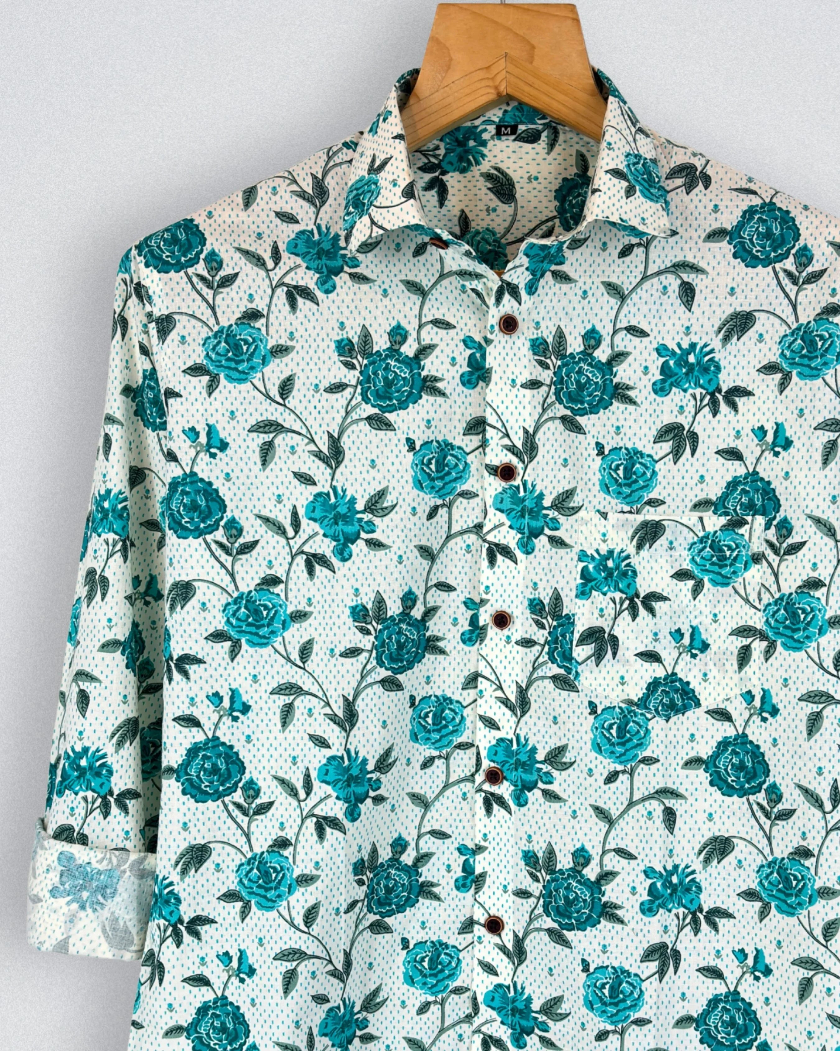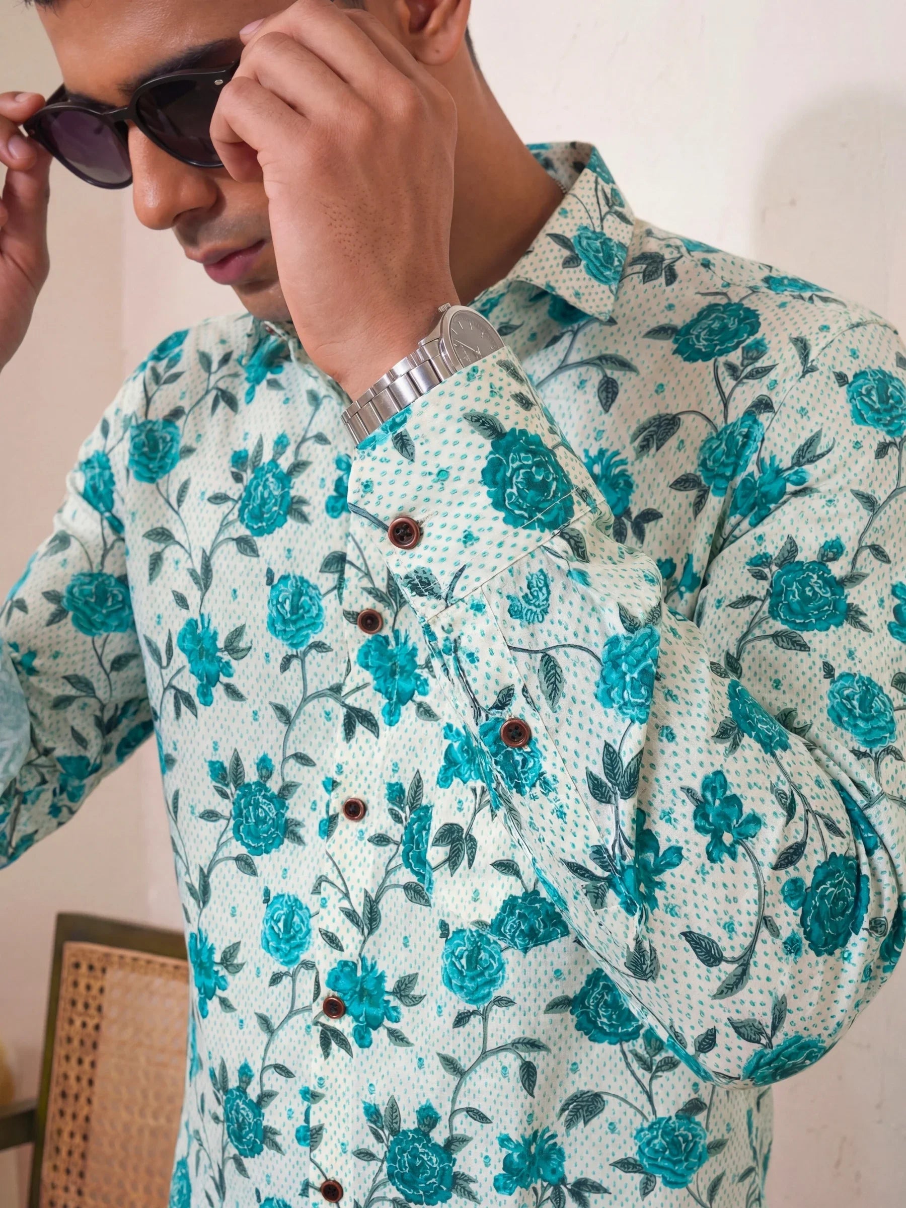 Step into style with Rose Garden by Jaipuri Crown – a charming full sleeve cotton shirt featuring a delightful floral print in teal against a cream backdrop. Made from 100% Sanganeri cotton, this shirt ensures a soft and breathable fit, perfect for casual gatherings, outings, or relaxed weekends.