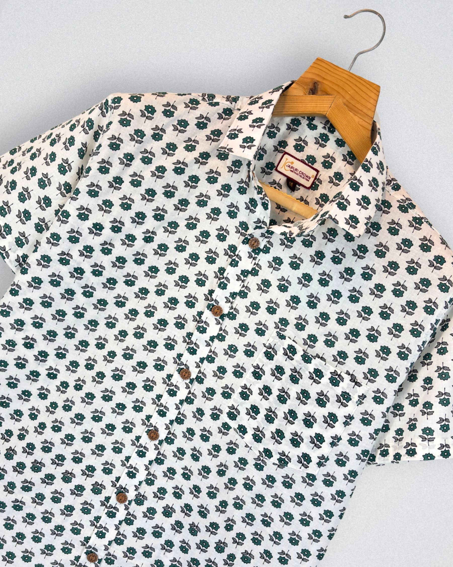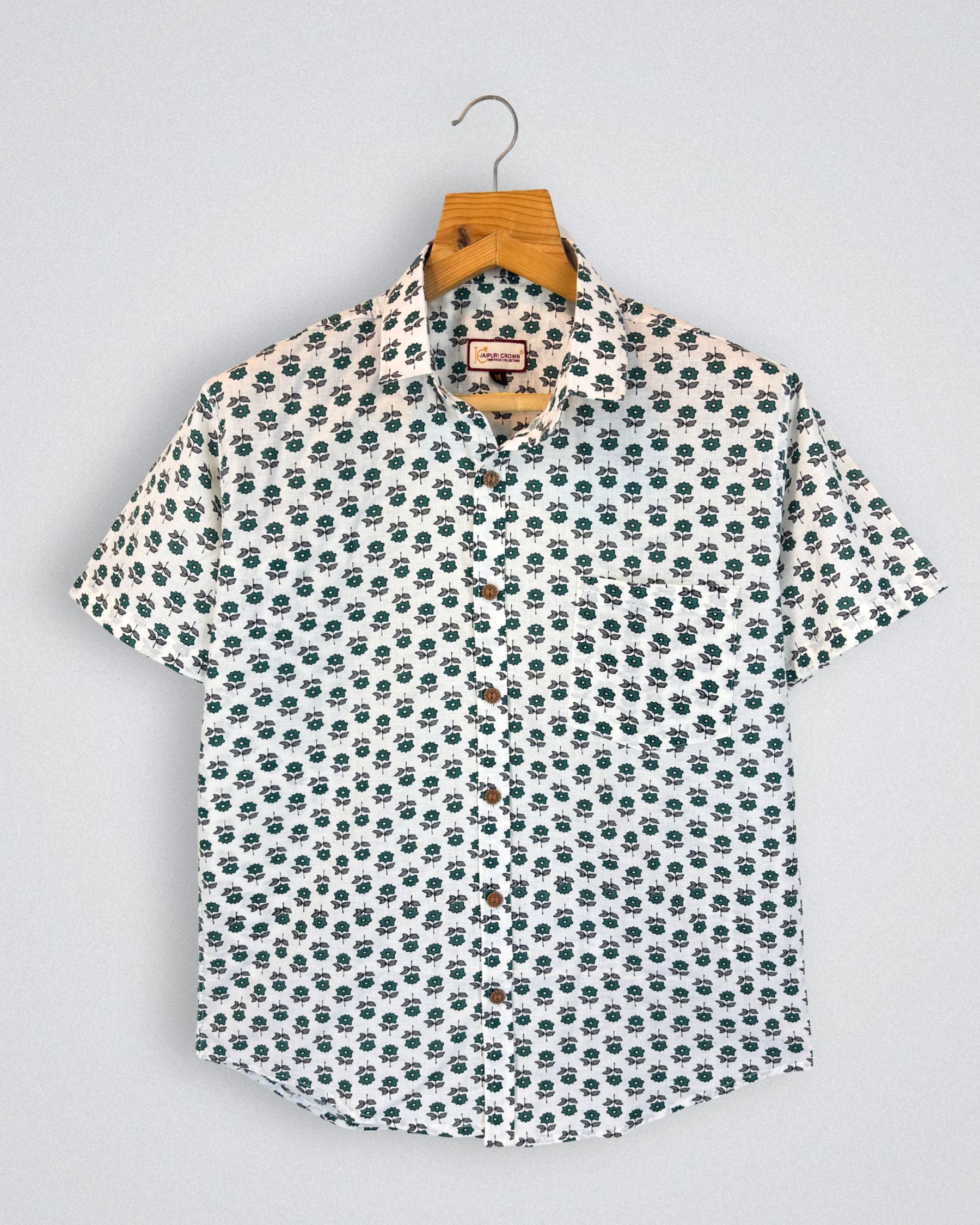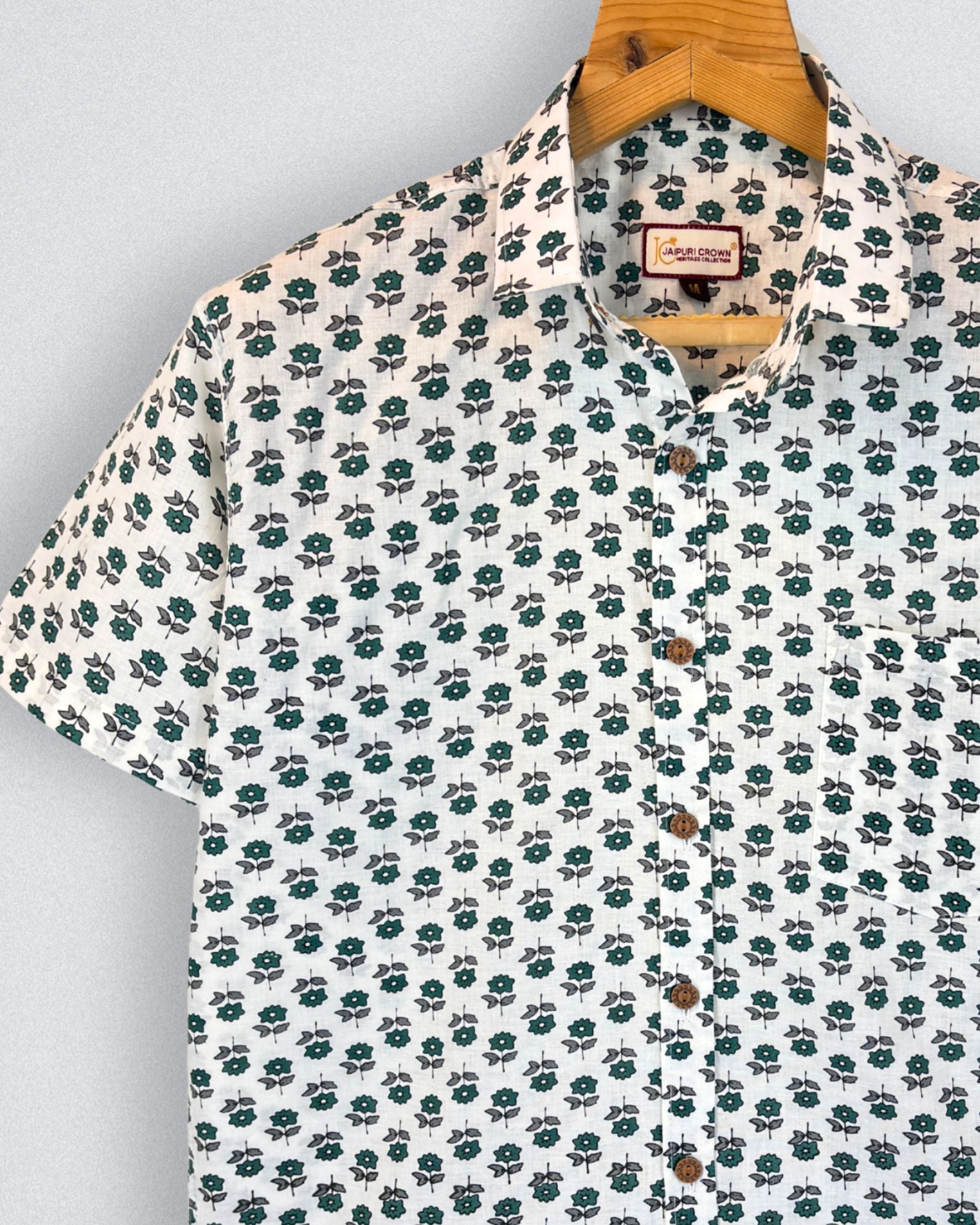 Step into the season with Floral Harmony by Jaipuri Crown – a stylish half sleeve cotton shirt featuring a charming floral print in rich green against a crisp white background. Made from 100% Sanganeri cotton, this shirt ensures a soft touch and breathability, perfect for casual gatherings, beach outings, or laid-back weekends.