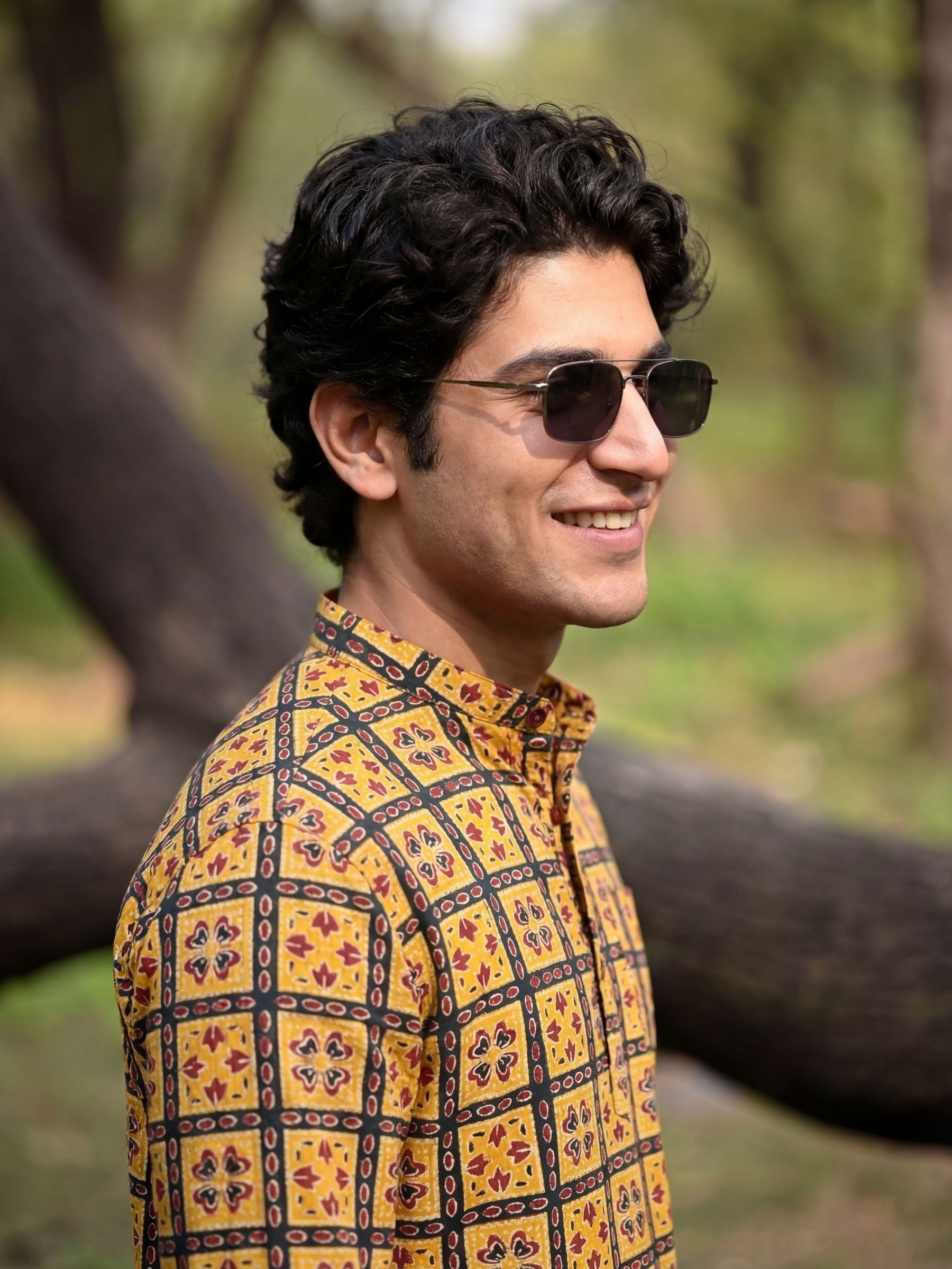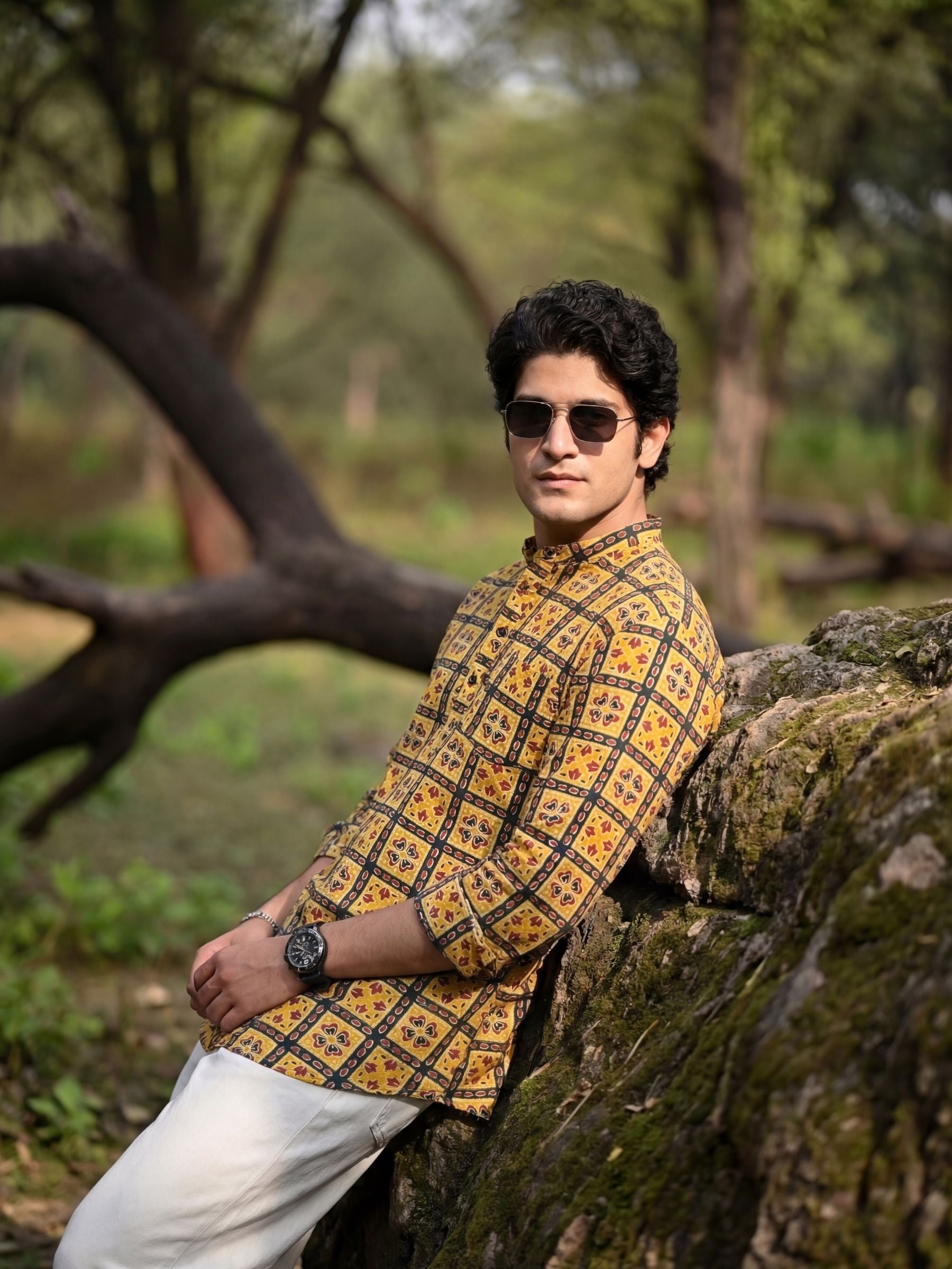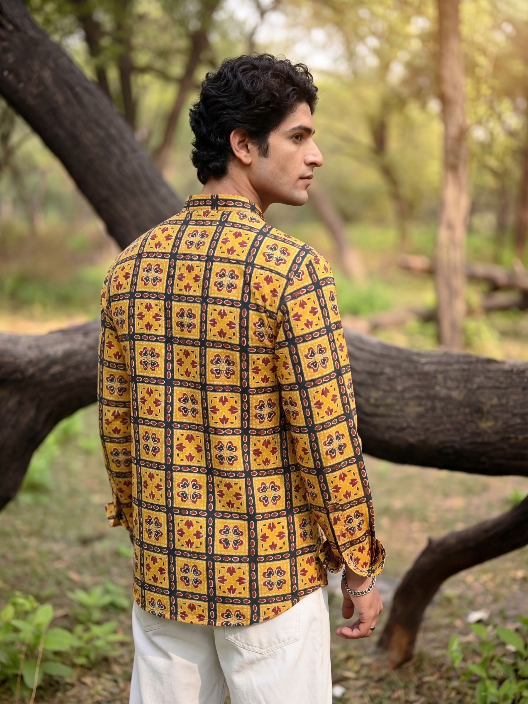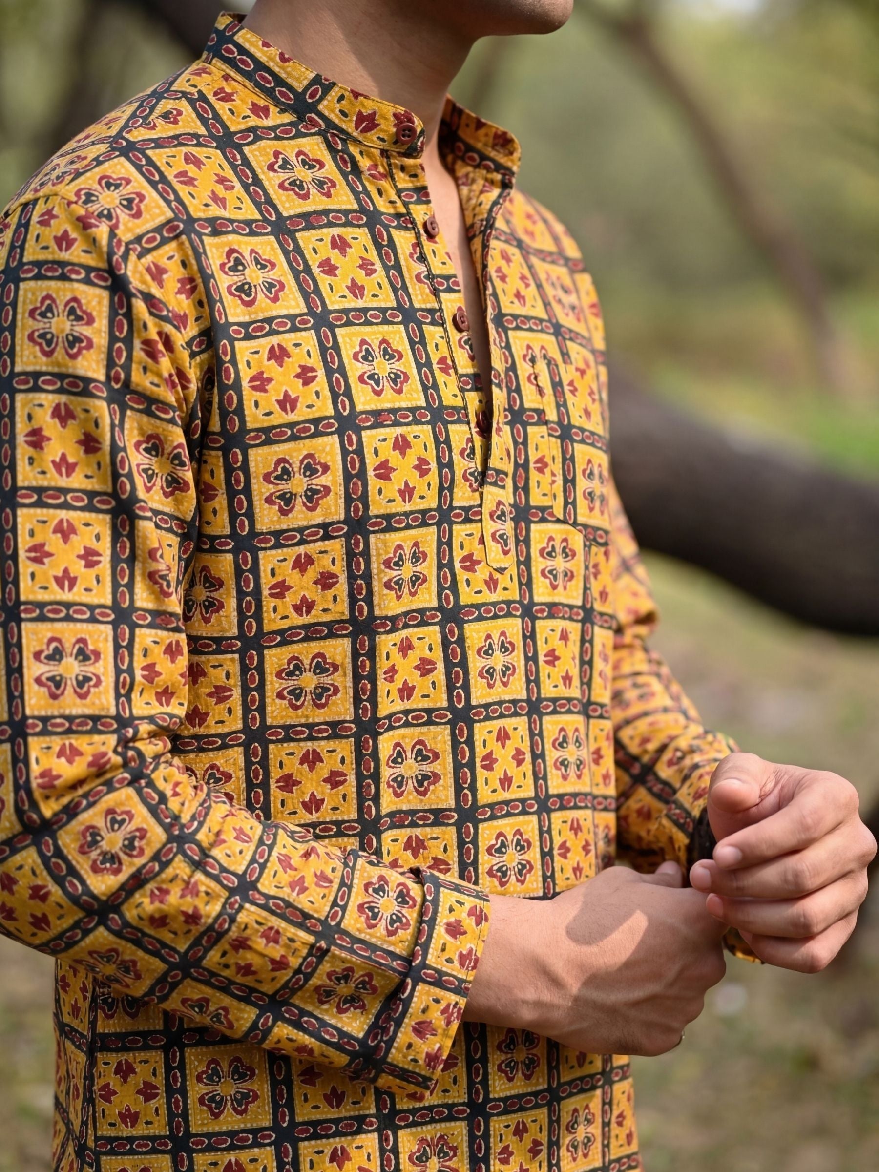 Step into tradition with the Floral Mosaic by Jaipuri Crown – a striking Short Kurta featuring a beautiful floral pattern in vibrant mustard and deep red against a rich black background. Made from 100% Sanganeri cotton, this Kurta combines comfort and style, making it an ideal choice for festive occasions or casual get-togethers.